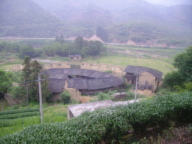 La campagne alentours que l’on va finalement parcourir à moto est tout simplement exceptionnelle, des champs de thé en terrasse, des montagnes aux cimes qui dépassent d’une brume épaisse blanche, des paysans qui rentrent des champs avec leur chapeau de paille, et puis ces maisons rondes qui telles des maisons extra terrestres fascinent. Les américains en pleine guerre froide ont cru voir en ces cylindres immenses des silos nucléaires que la Chine avait construit dans le secret. Les satellites de l’armée américaine avaient photographié la région et un grand étonnement autour de ces bases secrètes s’emparait de Washington. Des espions US sont donc parti voir de plus sur le terrain (ce qui a été avéré sur certains sites que j’ai lu sur le net, des hakkas ont rencontré des blancs à cette époque de la Chine fermée, nul doute qu’ils ont du surpris par la vérité).