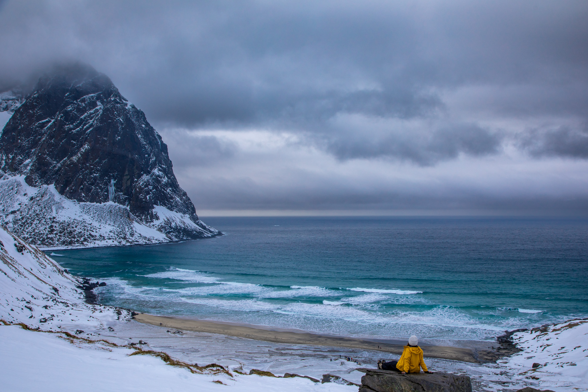 Nous sortons les crampons pour une randonnée dans la nature norvégienne, malgré le temps qui s’annonce maussade, on décide de quand même se lancer sans quelques appréhensions. On marche une demi journée en suivant un chemin recouvert de neige fraiche qui nous amène d’un fjors jusqu’à une superbe plage sauvage lovée au milieu de montagnes abruptes.