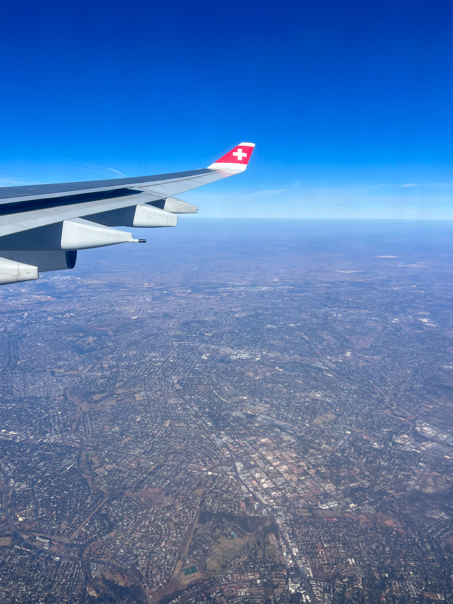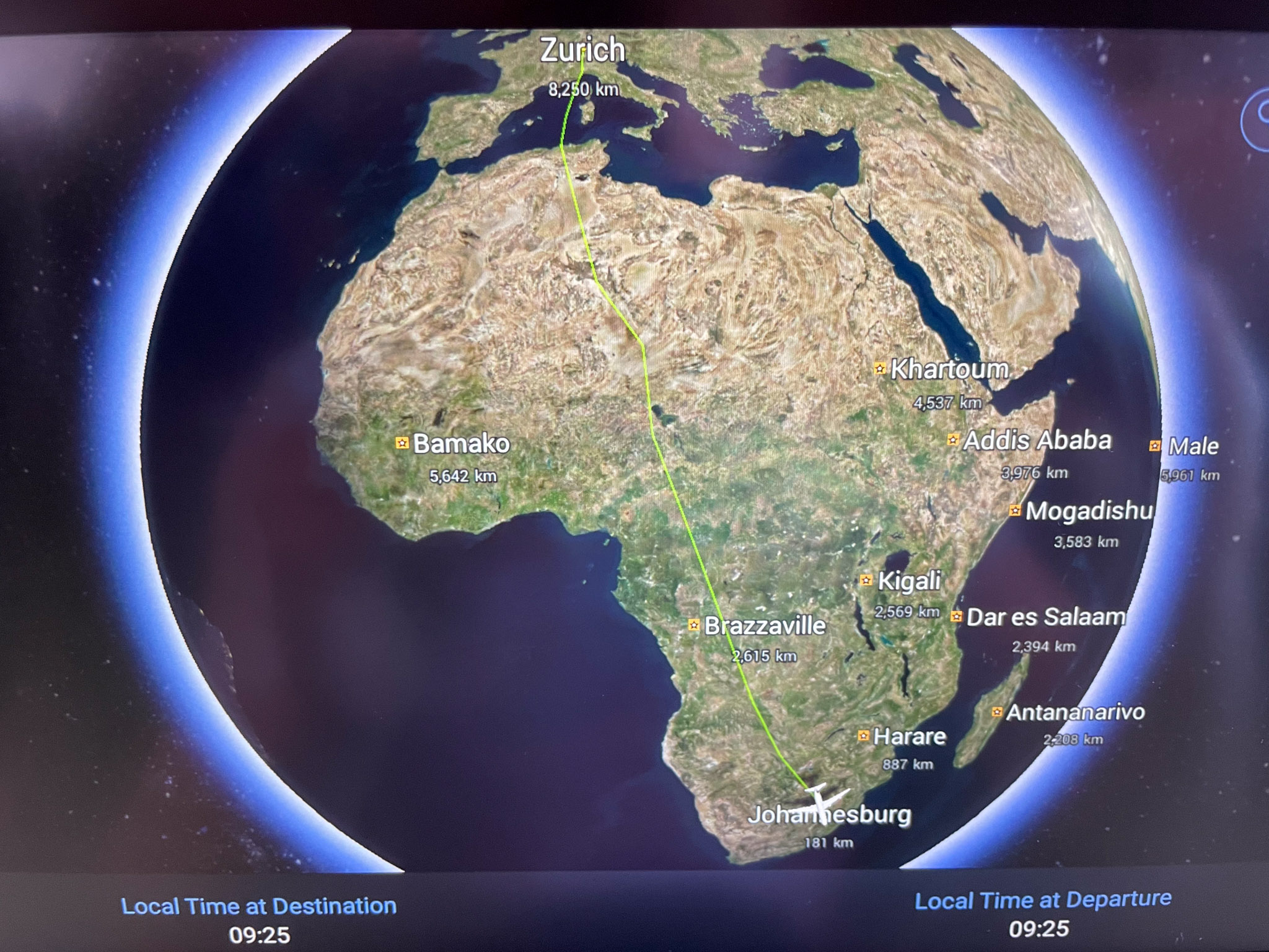 Nous partons de Genève avec un vol SWISS pour rejoindre Johannesburg tout au Sud de l’Afrique. Un vol avec correspondance à Zurich en fin de soirée puis un vol de nuit entre Zurich et Johannesburg, les horaires sont idéal car on ne perd pas de temps dans les transports ni à l’aller ni au retour. Nous avons réservé les billets d’avion en Février et les prix sur Juillet étaient très intéressant, environ 750€ par personne. Bien sur, avec la nouvelle politique tarifaire des compagnies, ce prix n’inclus ni le choix du siège ni les bagages en soute et il est non remboursable. L’avion entre Zurich et Johannesburg n’est pas confortable, l’espace pour les jambes est ridicule, pour mon gabarit standard, je n’arrive pas à faire rentrer les genoux. Mais l’excitions du voyage prend le dessus et on arrive à dormir tant bien que mal quelques heures.