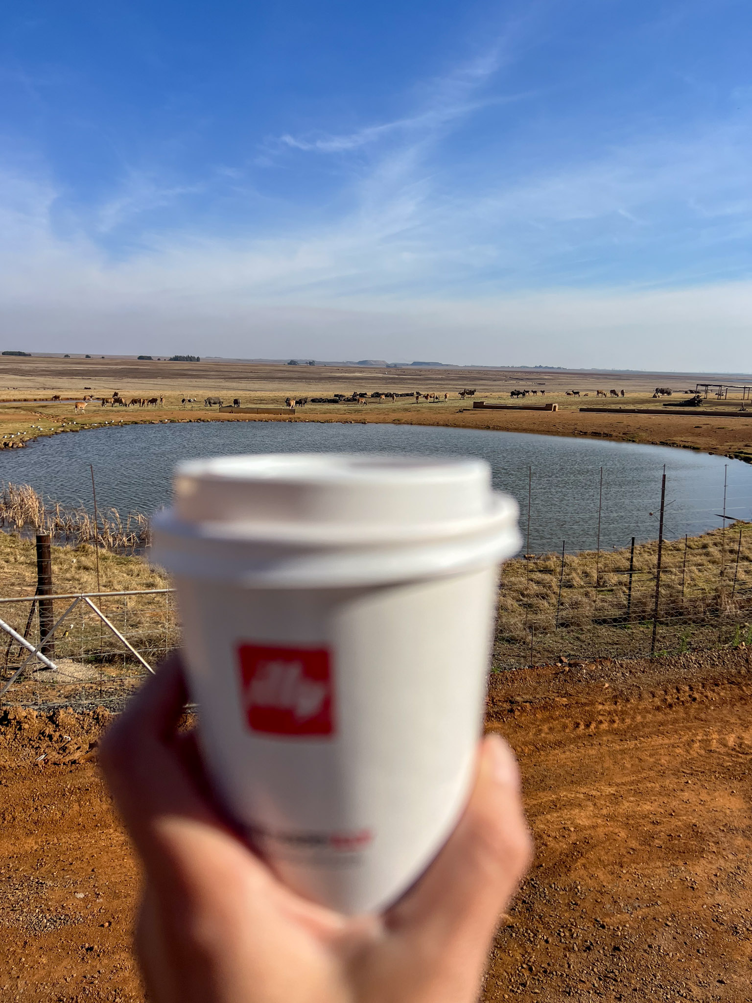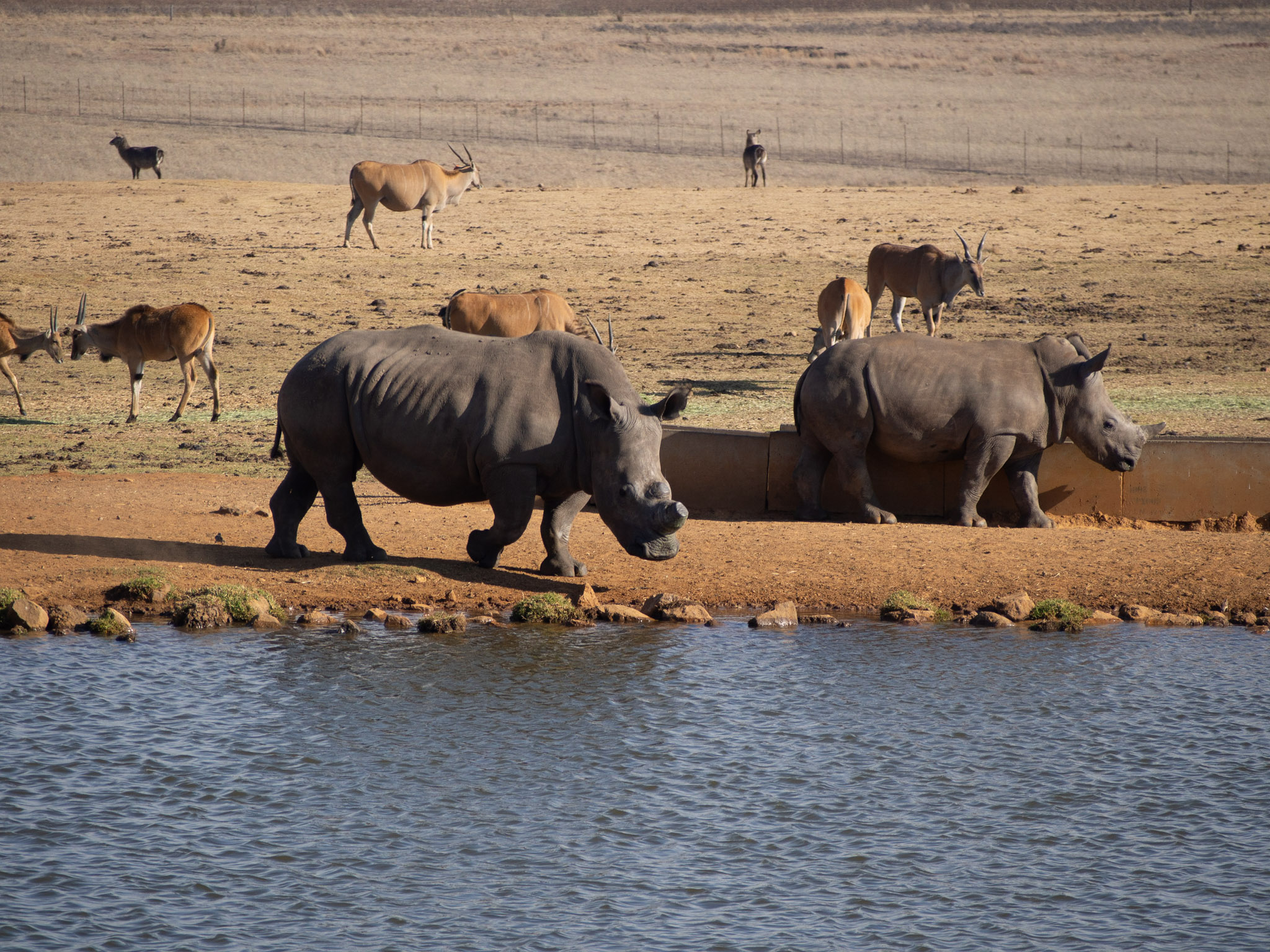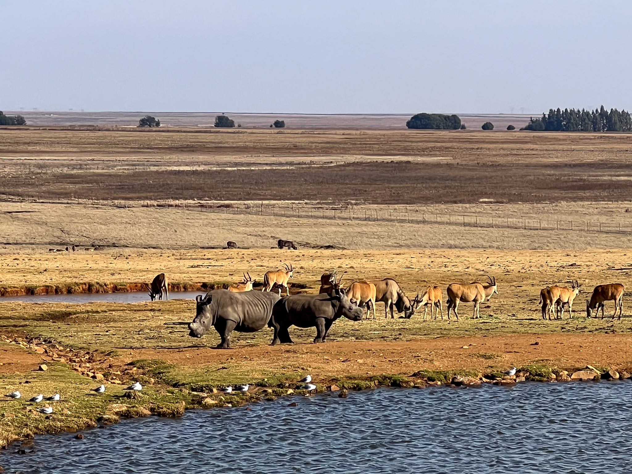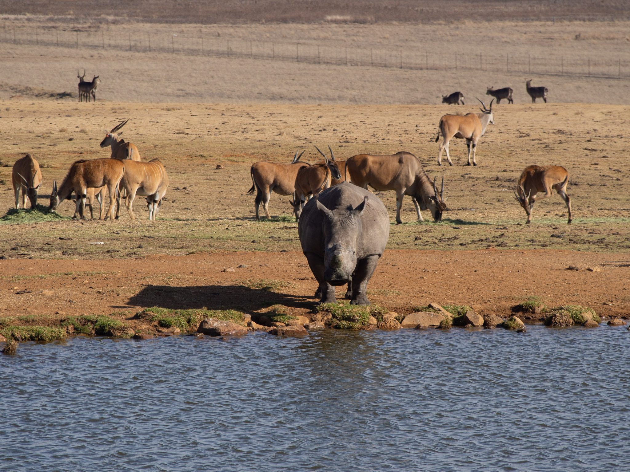 On s’embarque sur l’autoroute en direction de Blyde River Canyon, notre première étape de ce voyage. L’autoroute est peu fréquentée, la conduite est tranquille, et les kilomètres défilent. Les journées sont très courtes en hiver et on veut pouvoir arriver avant la nuit à l’hôtel. On fait une pause à l’aire d’autoroute Alzu Petroport N4 pour manger quelque chose et prendre un café. On aura ici notre premier contact avec des animaux de la savane africaine, un plan d’eau leur a été aménagé en face du restaurant au milieu de la plaine. Il y a des grillages au loin, ce qui veut dire qu’ils ont été mis là pour les voyageurs mais pour nous c’est vraiment extraordinaire. Ma copine me confie que c’est la première fois qu’elle voit certains des animaux ici dont le rhinocéros en vrai. En Chine dans sa ville, il y a un zoo mais avec peu d’animaux africains et c’est une découverte pour elle.