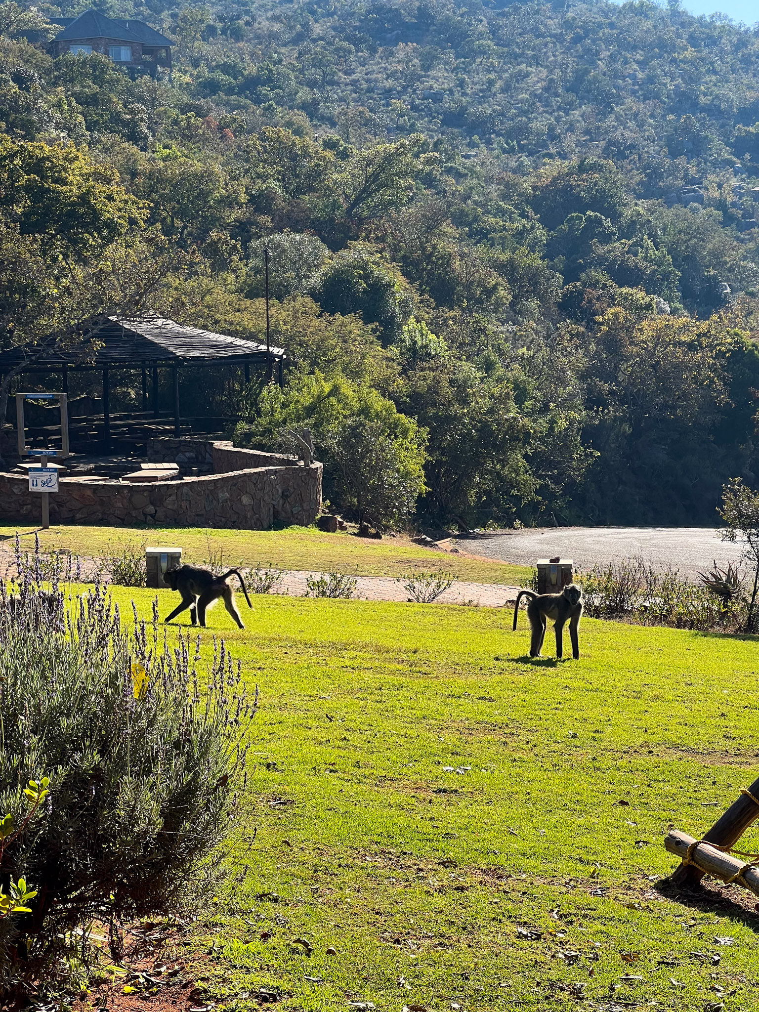 La nuit a été fraiche, l’électricité est revenue dans la nuit et les chargeurs sont bien à fond. On a enfin de l’eau chaude et on en profite. Il fait froid dans le fond de l’air, mais on sent bien que le soleil est brulant, même en hiver. On rejoint le restaurant pour le petit déjeuner et on croise un groupe de babouins sur la pelouse. Ils sont très malins, alors que la serveuse du restaurant nous présente le buffet, les babouins en ont profité pour entrer dans le restaurant dans son dos pour se jeter sur la nourriture. Ils en mettent de partout jusqu’à ce que le cuisinier arrive et les fait fuir. Avec surprise, on remarque qu’ils ont dérobé les sachets de sucre blanc pour le café et rien d’autre, comme des enfants.