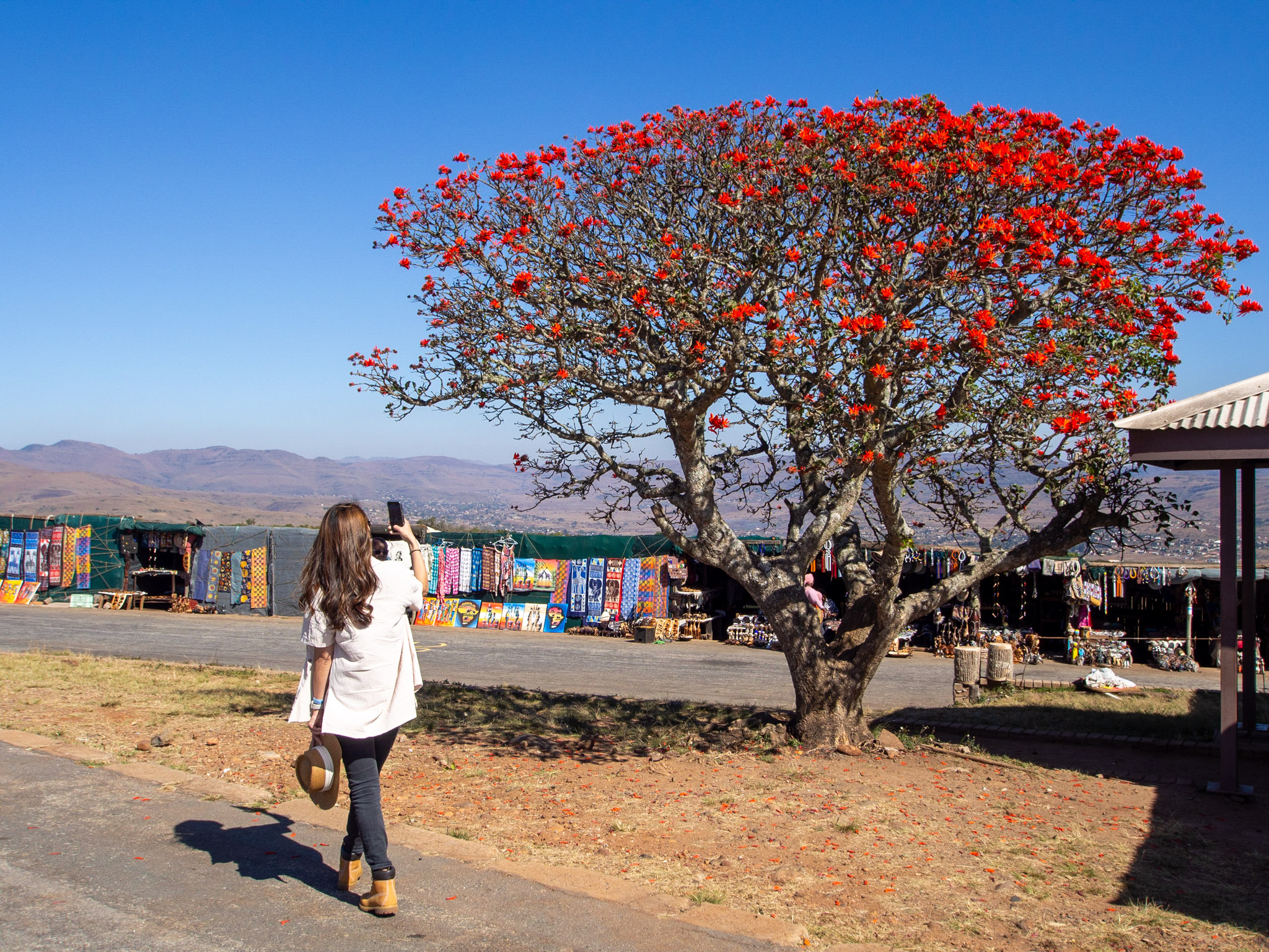 Sur le parking du point de vue, un arbre par contre semble à contre courant. Il fleurit en plein hiver, on s’approche pour le regarder et un vendeur nous explique que cet arbre est spécial, il s’appelle le moral tree, il a des très belles fleurs rouges magnifiques.