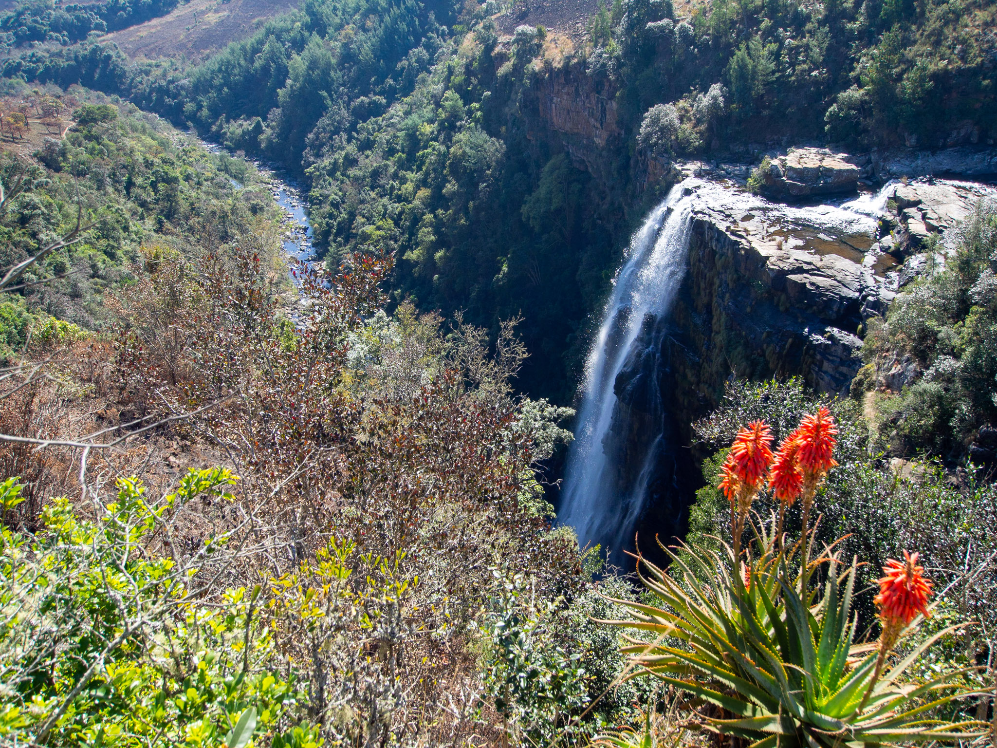 Mais avant on fait un dernier arrêt à la cascade de Lisbon, une belle chute d’eau qui dévale de presque 92 mètres dans une crevasse en contrebas. C’est la plus grande cascade de la province du Mpumalanga. Par contre, en saison sèche le débit n’est pas très impressionnant mais de belles fleurs ont poussé juste devant le point de vue.
