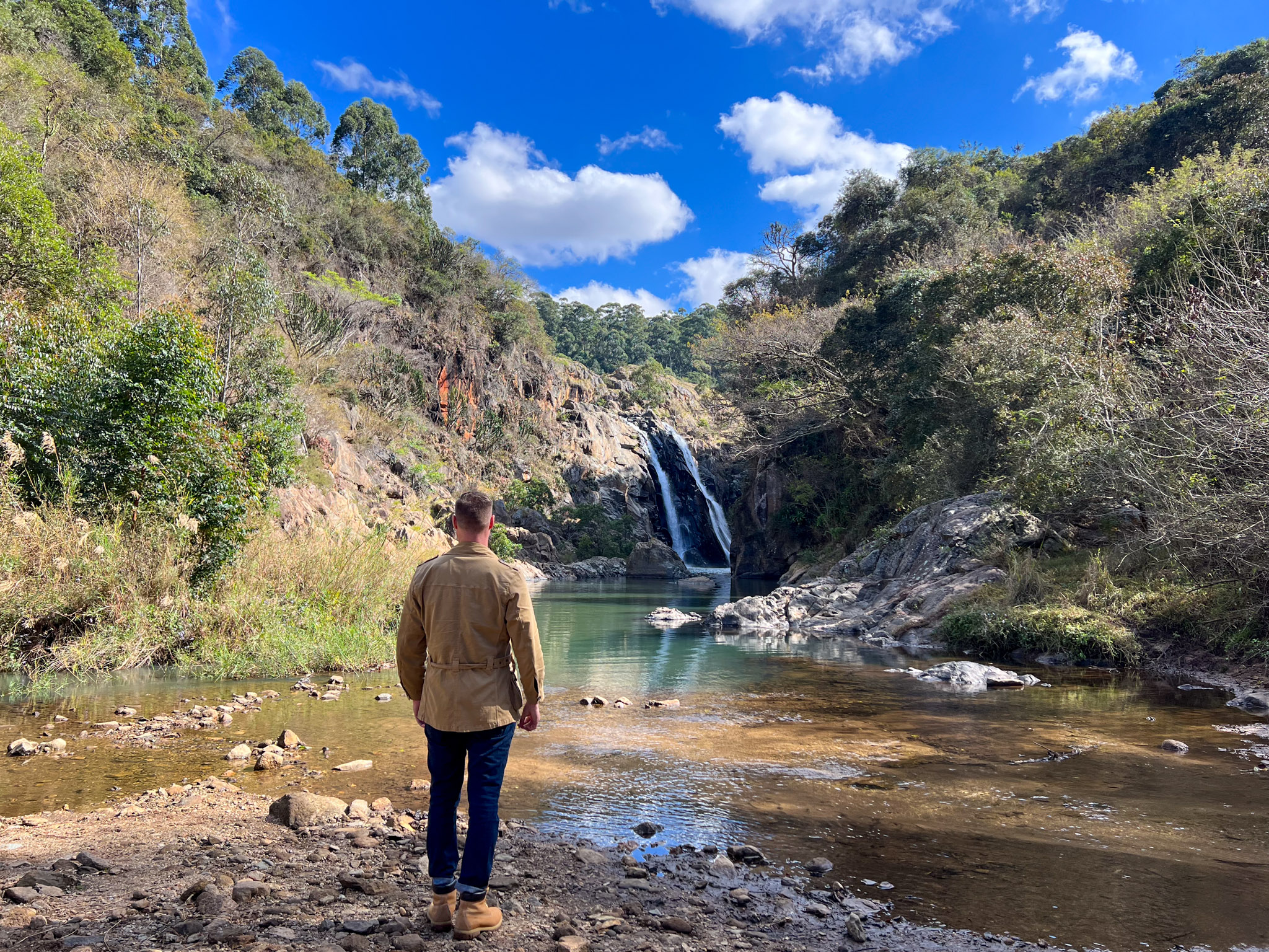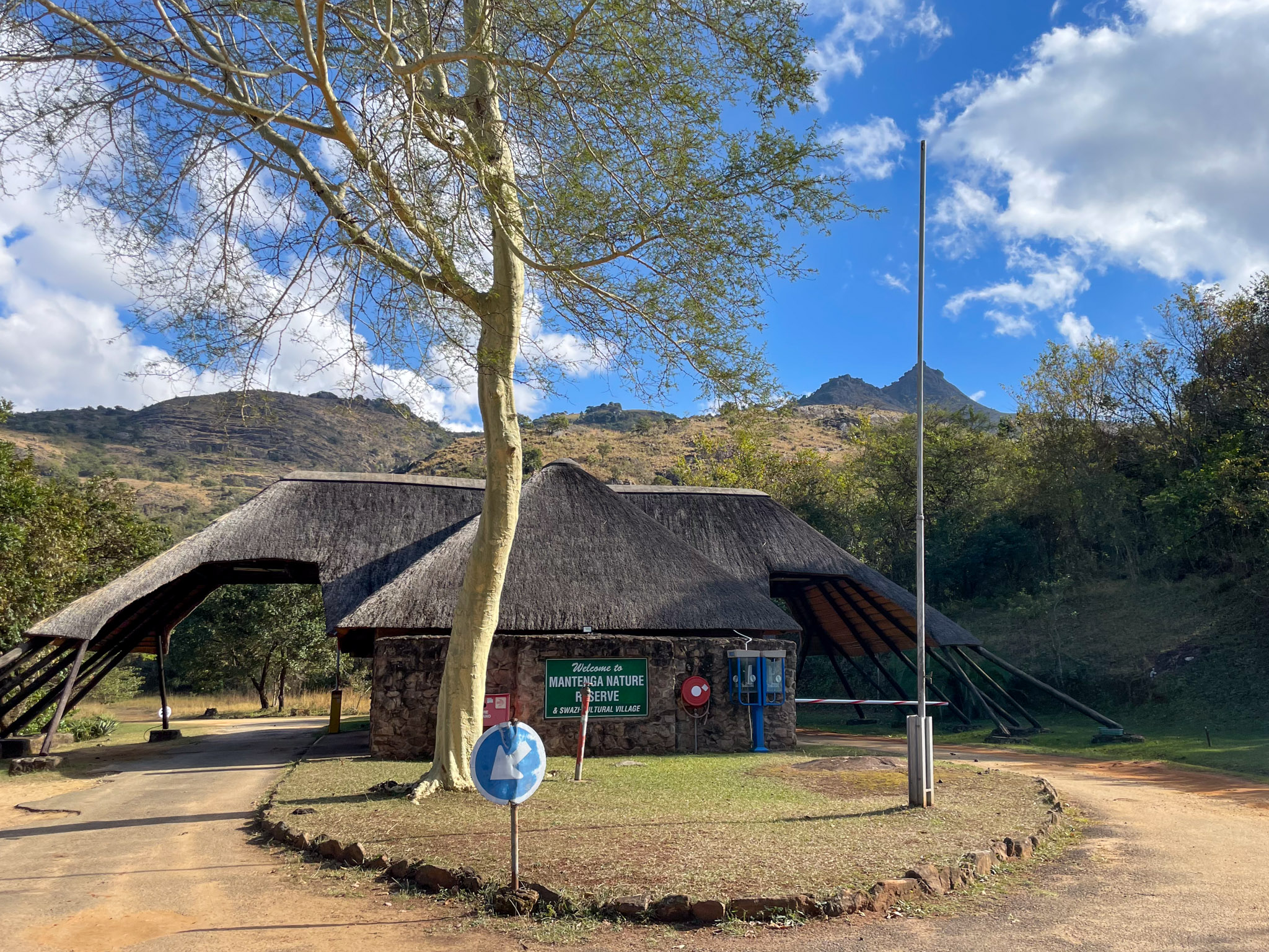 Nous avions vu néanmoins qu’il était possible de visiter un village par l’intermédiaire de la réserve de Hlane mais on a préféré aller à Matenga. Le village culturel a été construit au creux d’une vallée entre la plus grande ville d’eSwantini et la capitale Mbabane. Pas loin de l’énorme bâtiment de l’ambassade américaine et du centre d’entraînement de l’équipe nationale de football. La zone est dotée d’une nature magnifique et donne envie d’y prolonger son séjour, ce qui est possible sur place, on repère de jolies maisonnettes dont le balcon donne sur la rivière, ou alors en logeant au sein de la réserve naturelle de Mlilwane Wildlife Sanctuary à quelques kilomètres. On aurait bien voulu y passer une nuit au moins d’ailleurs pour varier encore les activités. A Mlilwane, il est possible de faire du vélo dans une zone sauvage mais sans prédateurs dangereux. Mais la durée de notre séjour était un peu trop court, si le temps le permet, je recommande vivement d’y ajouter une nuit ce qui fait trois nuits au Swaziland entre le Kruger et Ste Lucia, le cadre est magnifique. On arrive à la porte du village où comme d’habitude il faut descendre de la voiture pour s’acquitter du droit d’entrée.
