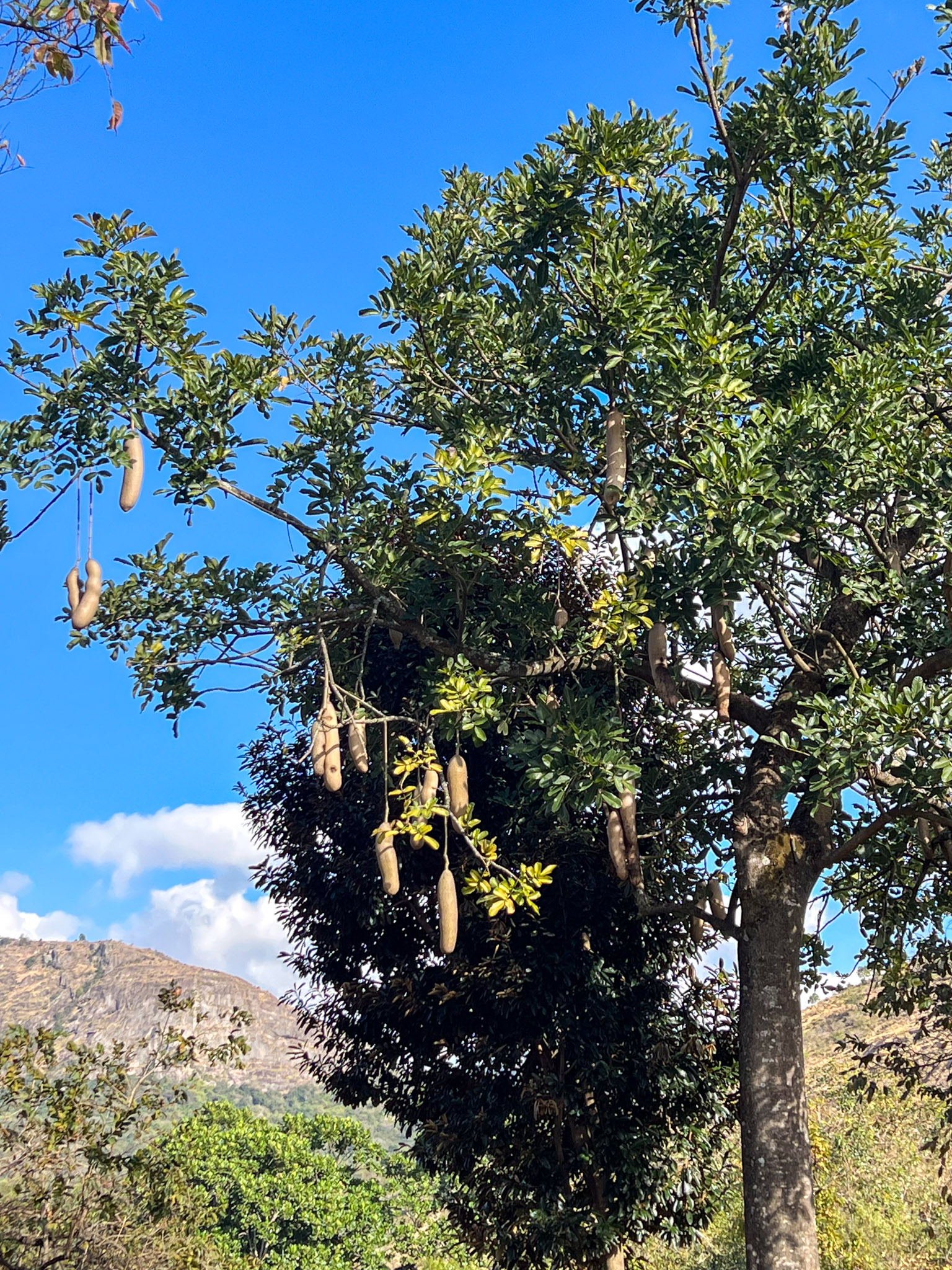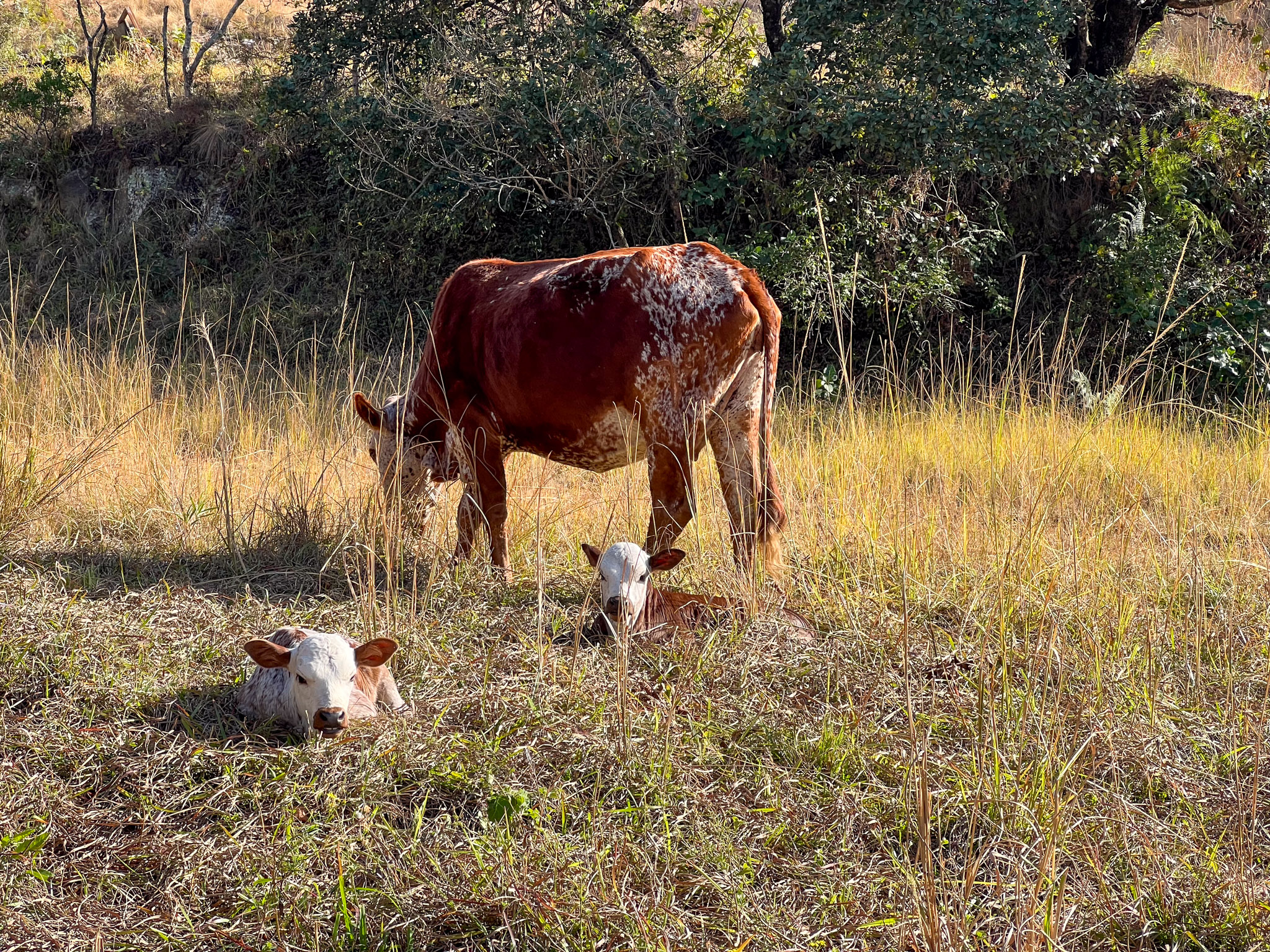 En attendant, on explore un peu les alentours. Ici, un arbre avec des fruits très bizarres pousse dans la réserve. Un troupeau de vaches avec des petits.
