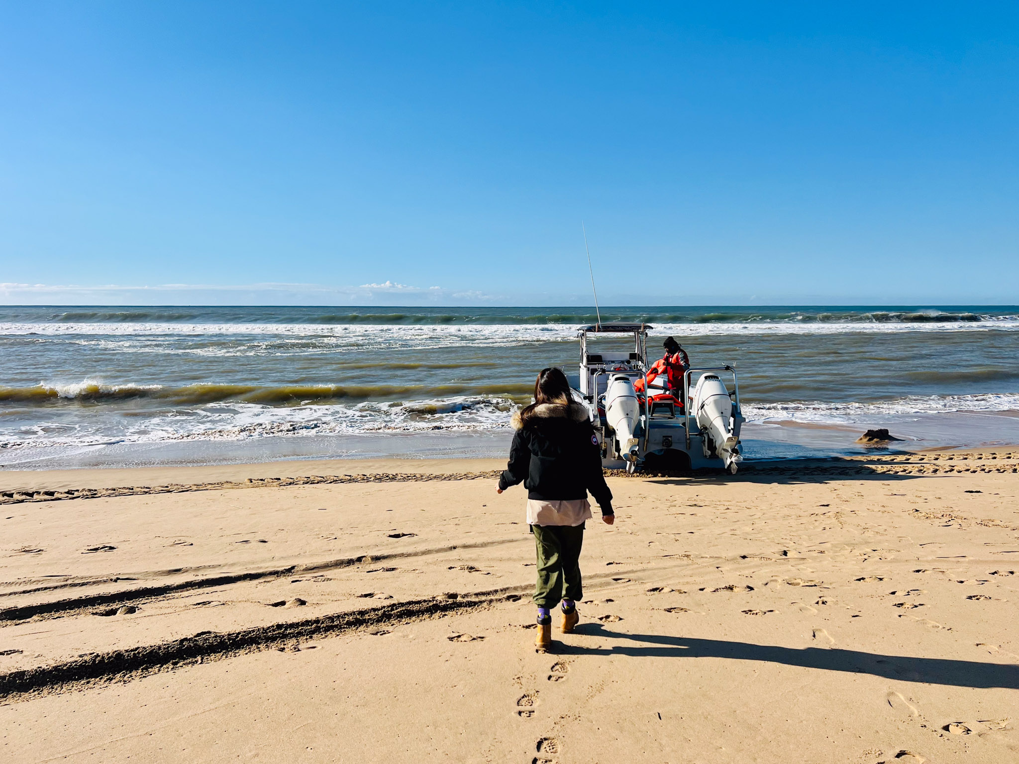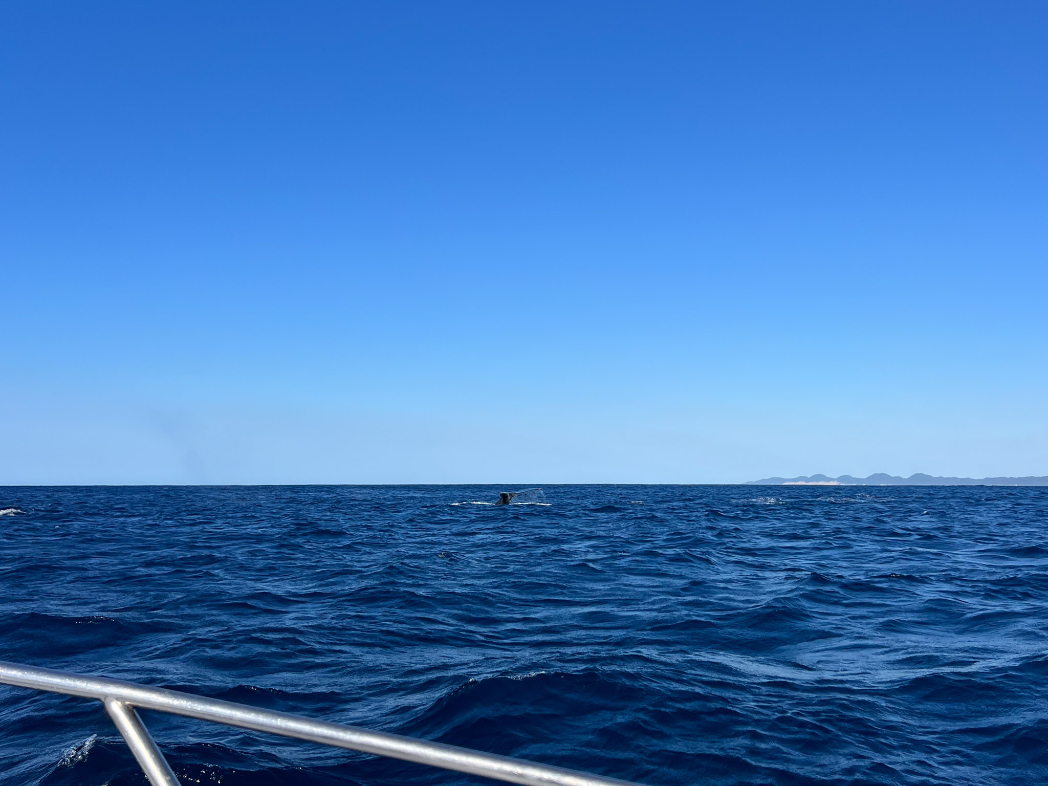 Les vagues sont immenses, ça nous inquiète un peu comment on va traverser cette barrière avec le petit bateau à moteur de l’agence. Pour ne pas nous rassurer, le capitaine nous fournit des ponchos à mettre sous le gilet de sauvetage et il nous garantit que l’on sera complètement mouillé sans aucun doute. Il demande à mettre tous les objets électroniques à l’abri sous les sièges et nous explique que pour passer les vagues il va devoir mettre pleins gaz au moment opportun. Ça secoue vraiment et il faut vraiment s’accrocher mais on passe sans encombre de l’autre côté. Maintenant on se met à la recherche des cétacés et nous tombons d’abord sur un groupe de dauphins avant de tomber sur le premier groupe de baleines. Il y en a fait vraiment beaucoup et pendant deux heures on va naviguer au milieu des différents groupes dans l’espoir de tomber sur un spécimen plus joueur qui voudra sauter devant nous. Malheureusement nous ne verrons surtout le dos des baleines, parfois leur queue, et aussi leurs nageoires comme si elles nous saluaient.