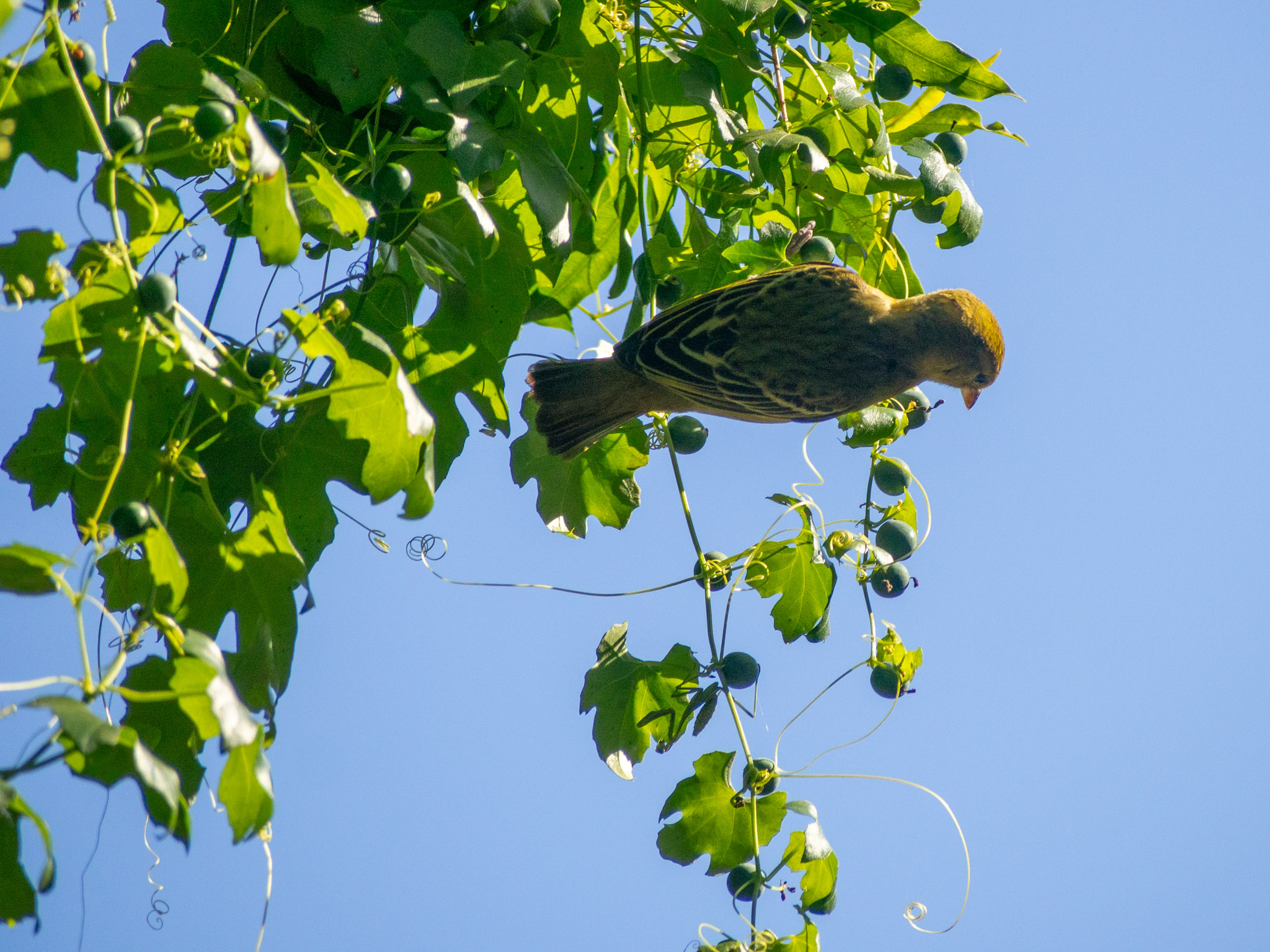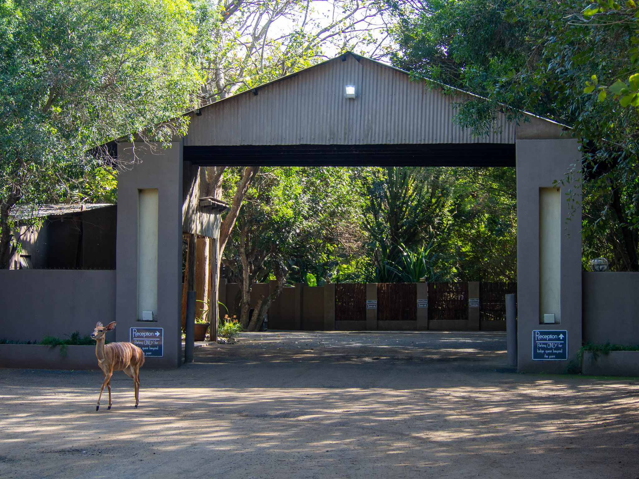 Sur le parking du lodge qui donne sur une réserve naturelle, il y a des impalas, des kudus et de beaux oiseaux jaunes dans les arbres.