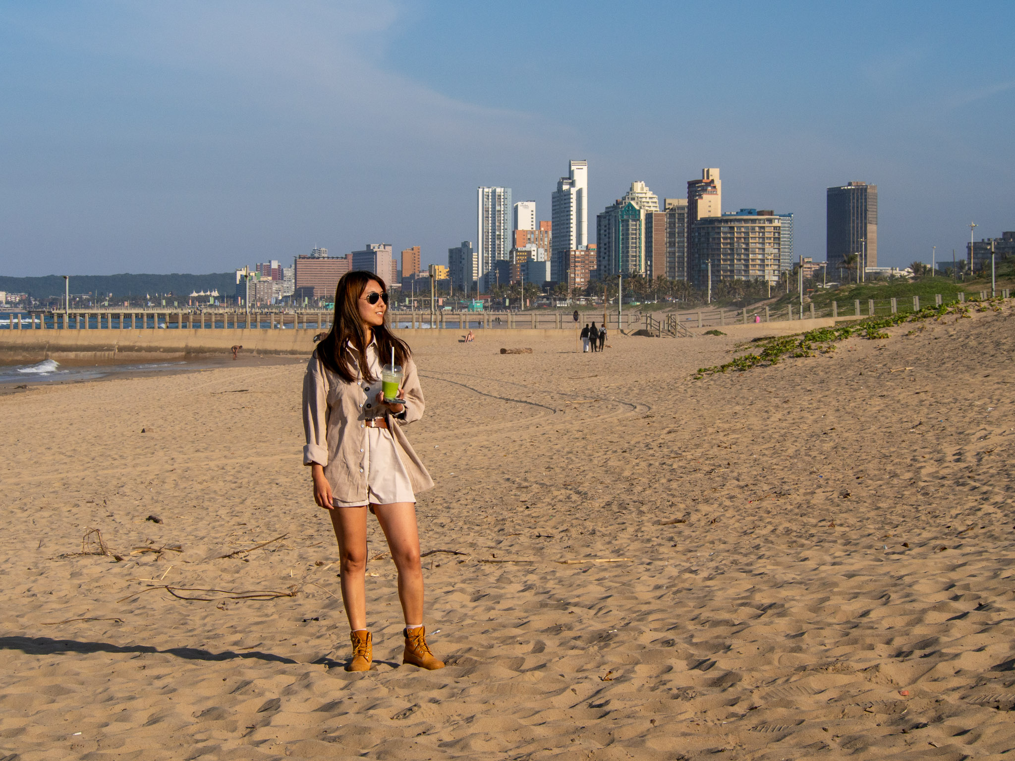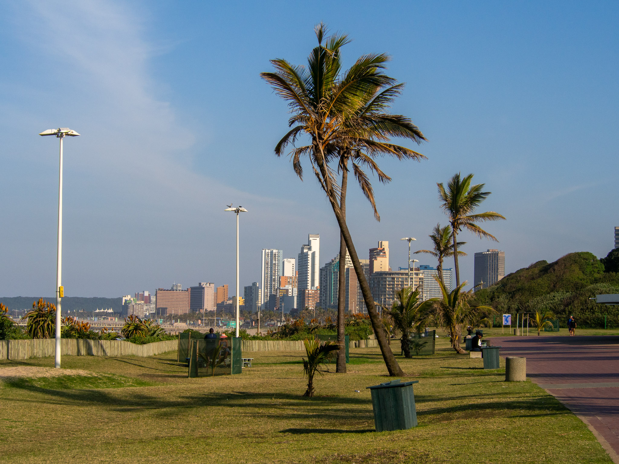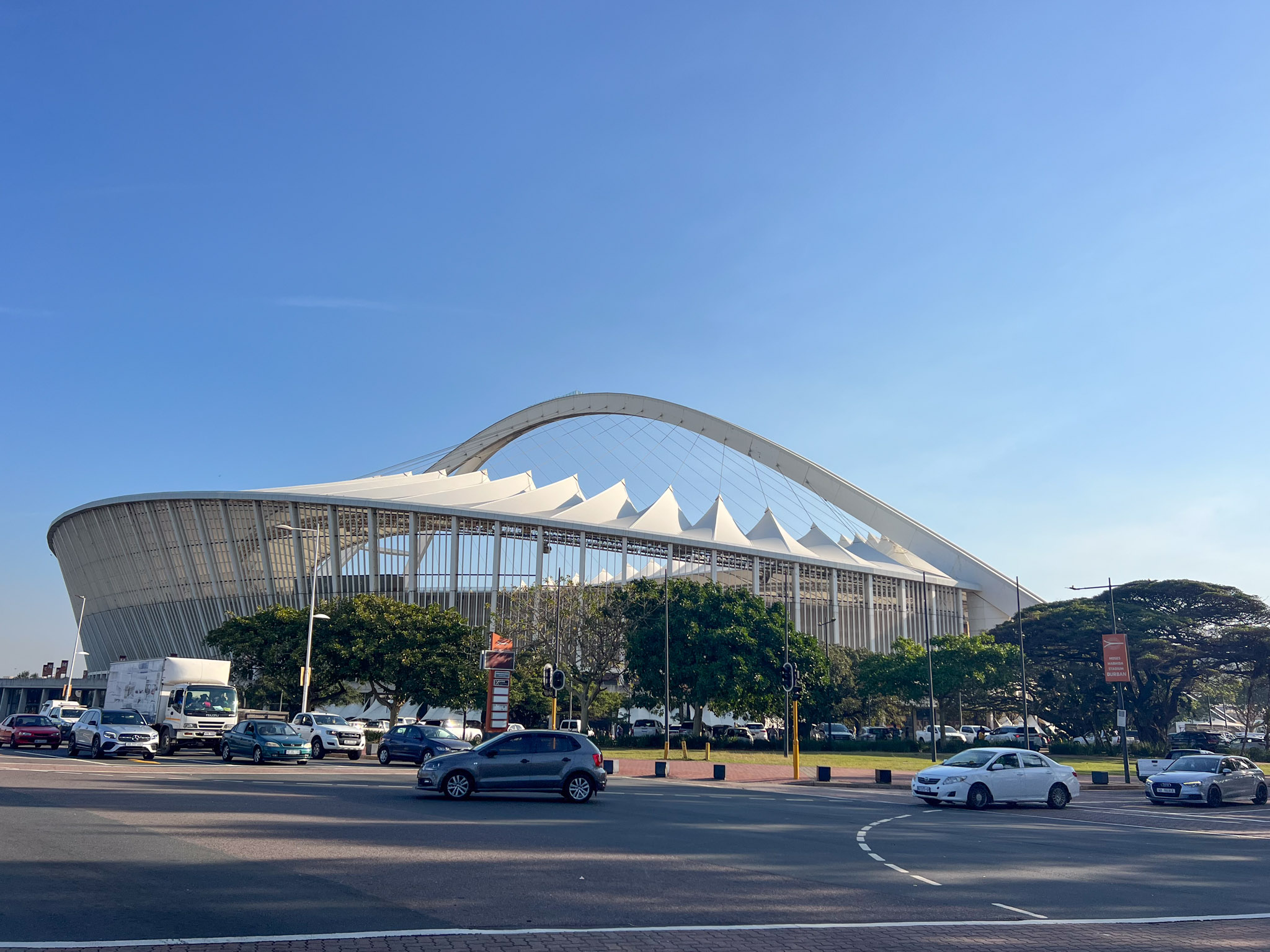 Il faut plus de 5h de route pour rejoindre notre destination du soir. Après un passage assez difficile avec beaucoup de camions à doubler jusqu’au port de Richard's Bay, nous entrons enfin sur une vraie autoroute beaucoup plus sereine, si ce n’est la longue attente aux péages car quasiment personne, nous y compris, ne semble encore avoir adopté le telebadge en Afrique du Sud. D’ailleurs il faut noter que les péages ne prennent pas non plus nos cartes de débit françaises et on ne peut pas payer non plus avec Applepay. Ce sera donc le seul moment dans le pays où le cash sera nécessaire. Il faut donc prévoir d’avoir des billets sur soi ou de passer à un ATM, nous en avons vu sur certaines aires de repos. On arrive sans encombre à Durban et on décide de faire une pause. Il y a des bouchons sur le périphérique de la ville, on bifurque par le front de mer, on passe devant le stade qui était rénové pour la coupe du monde.