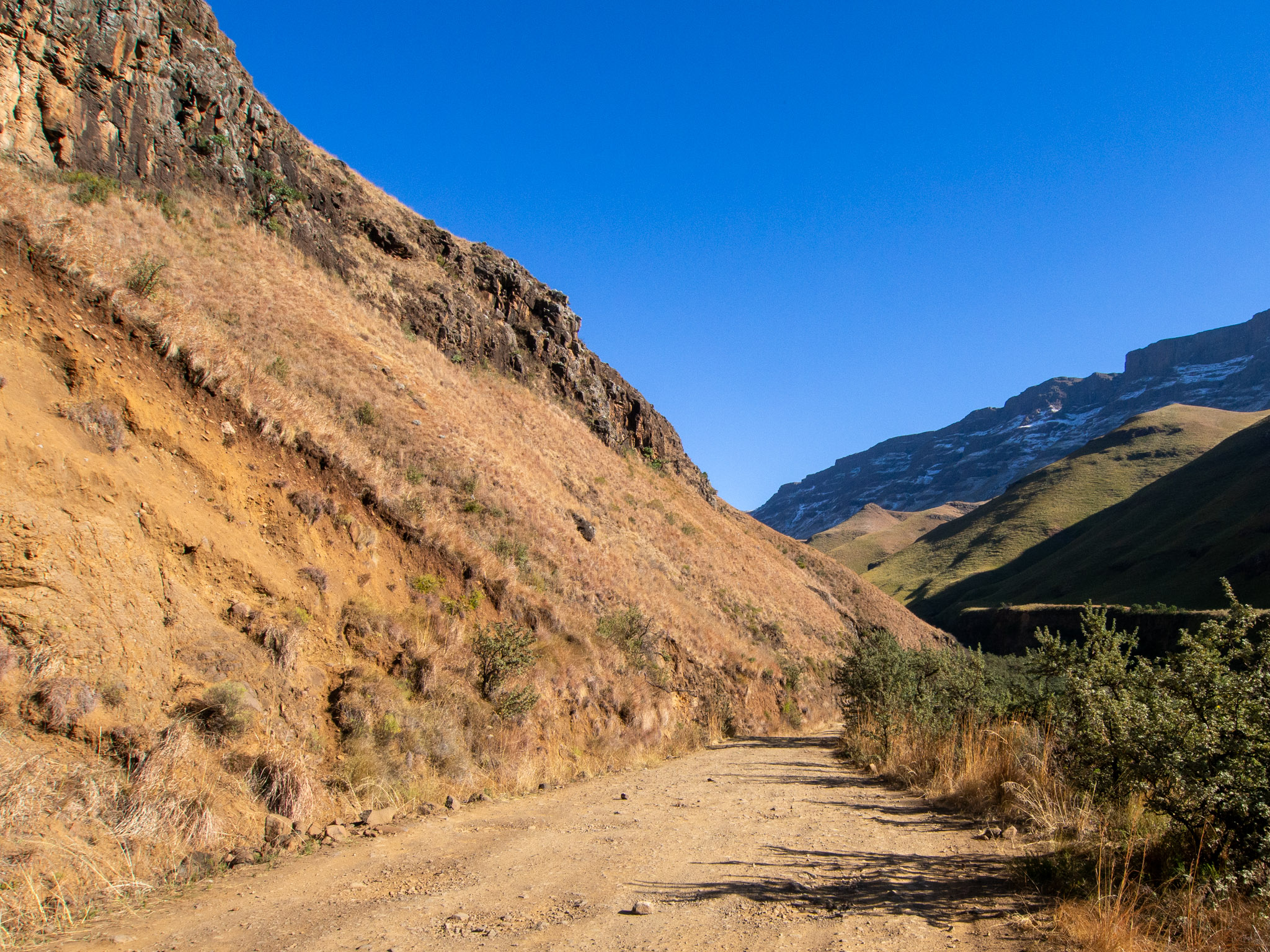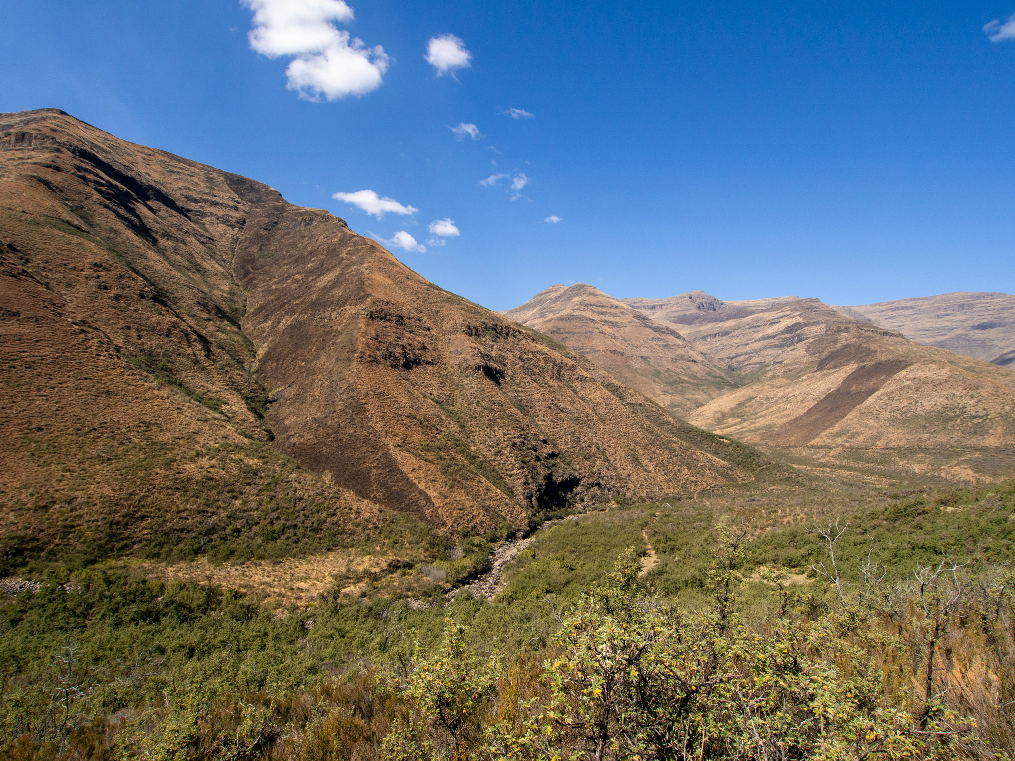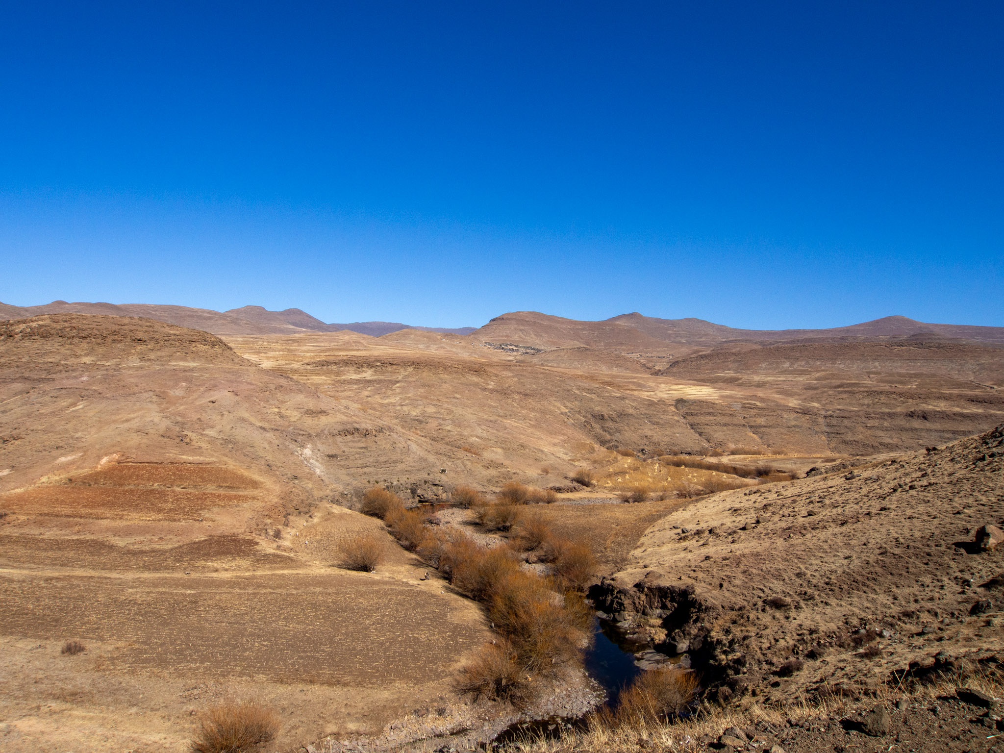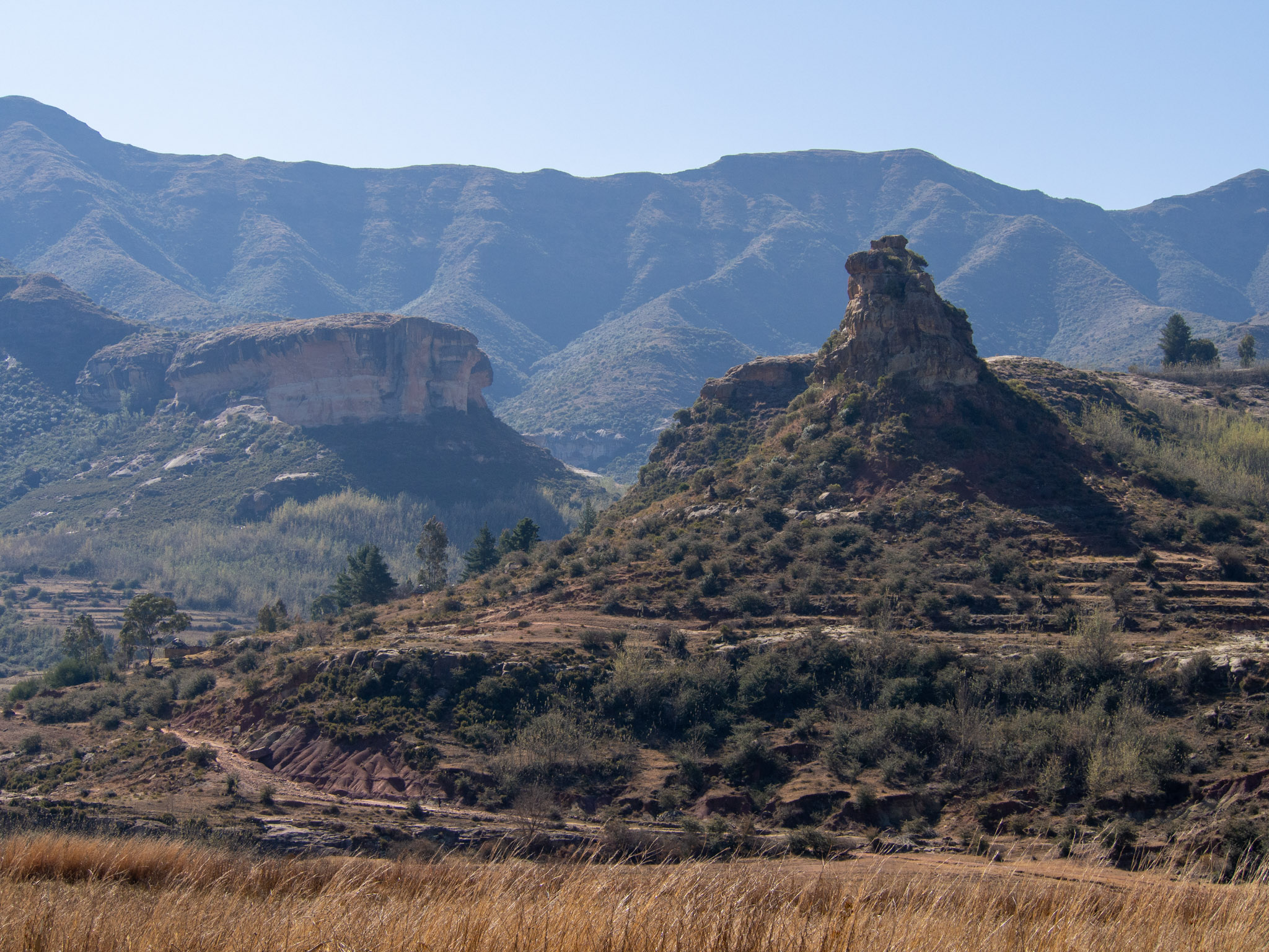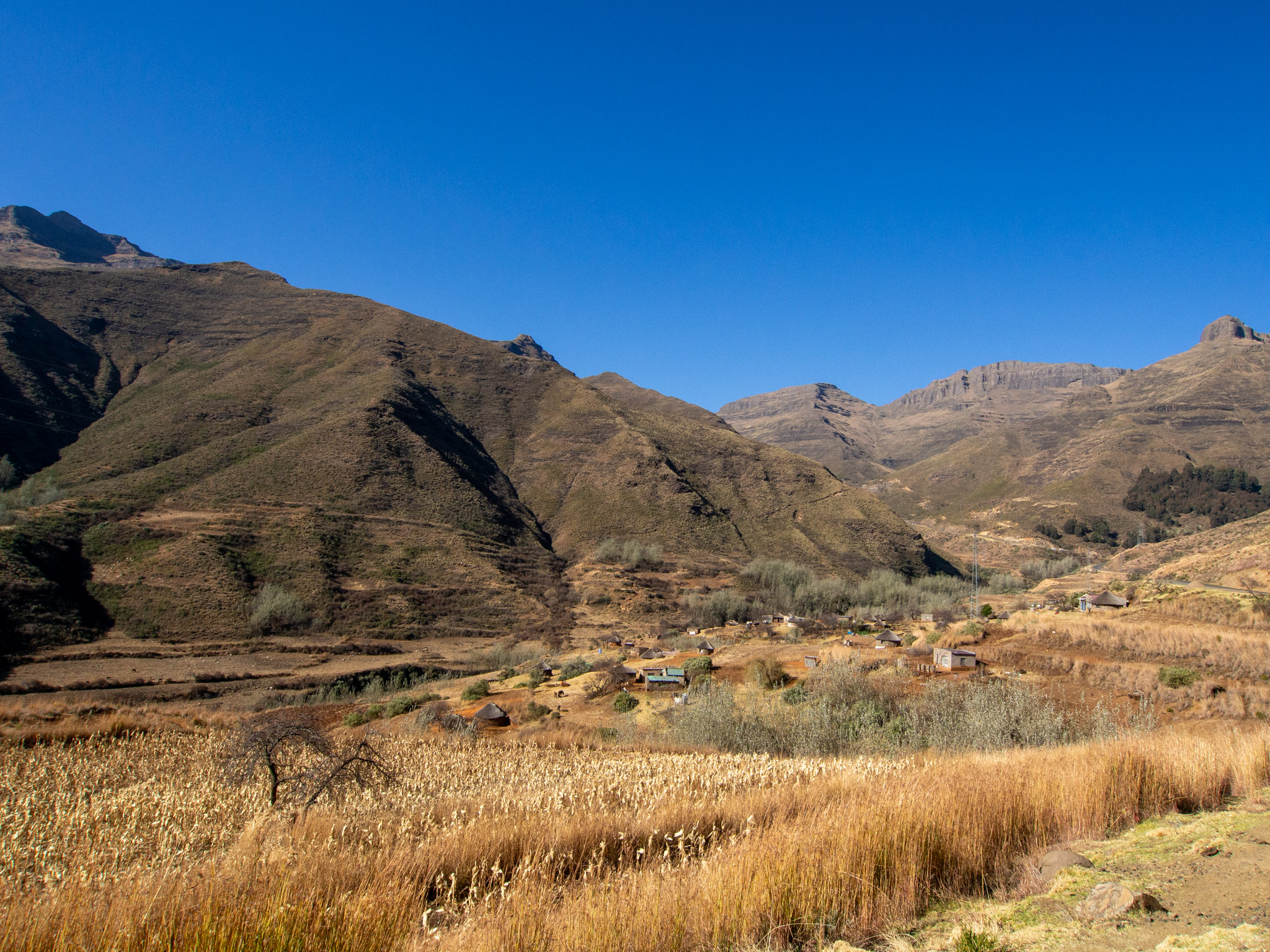 Maintenant on entame la descente pour rejoindre une région plus hospitalière du Lesotho dans les basses terres où se concentre la population. Le paysage est grandiose avec des montagnes acérées.