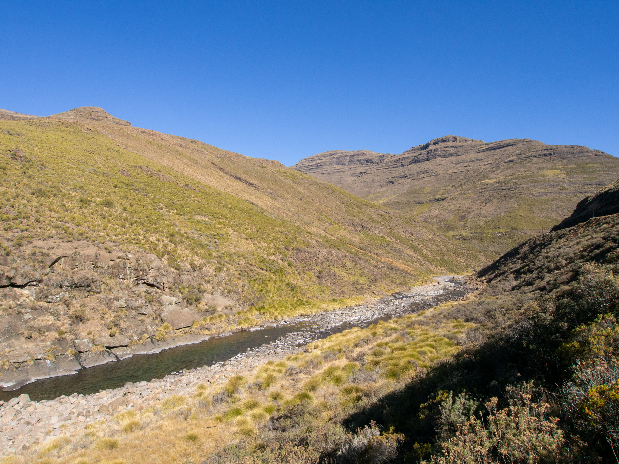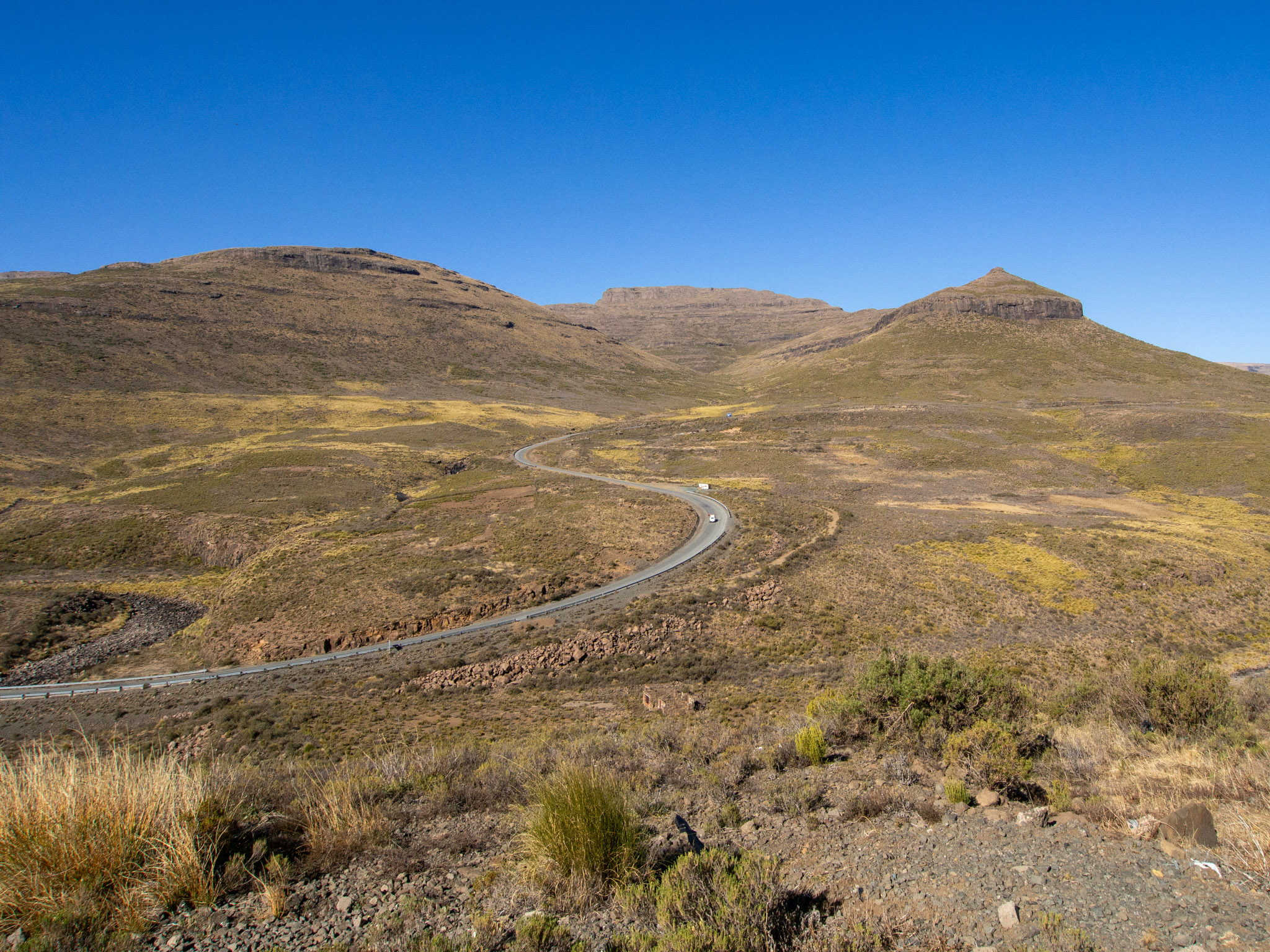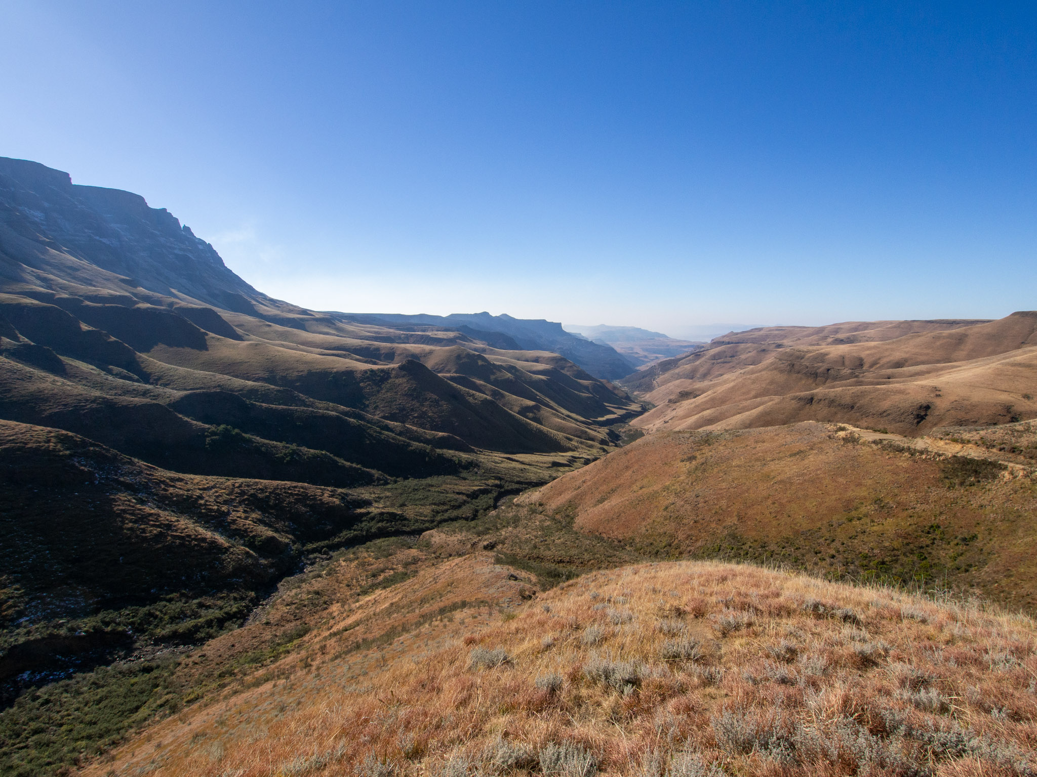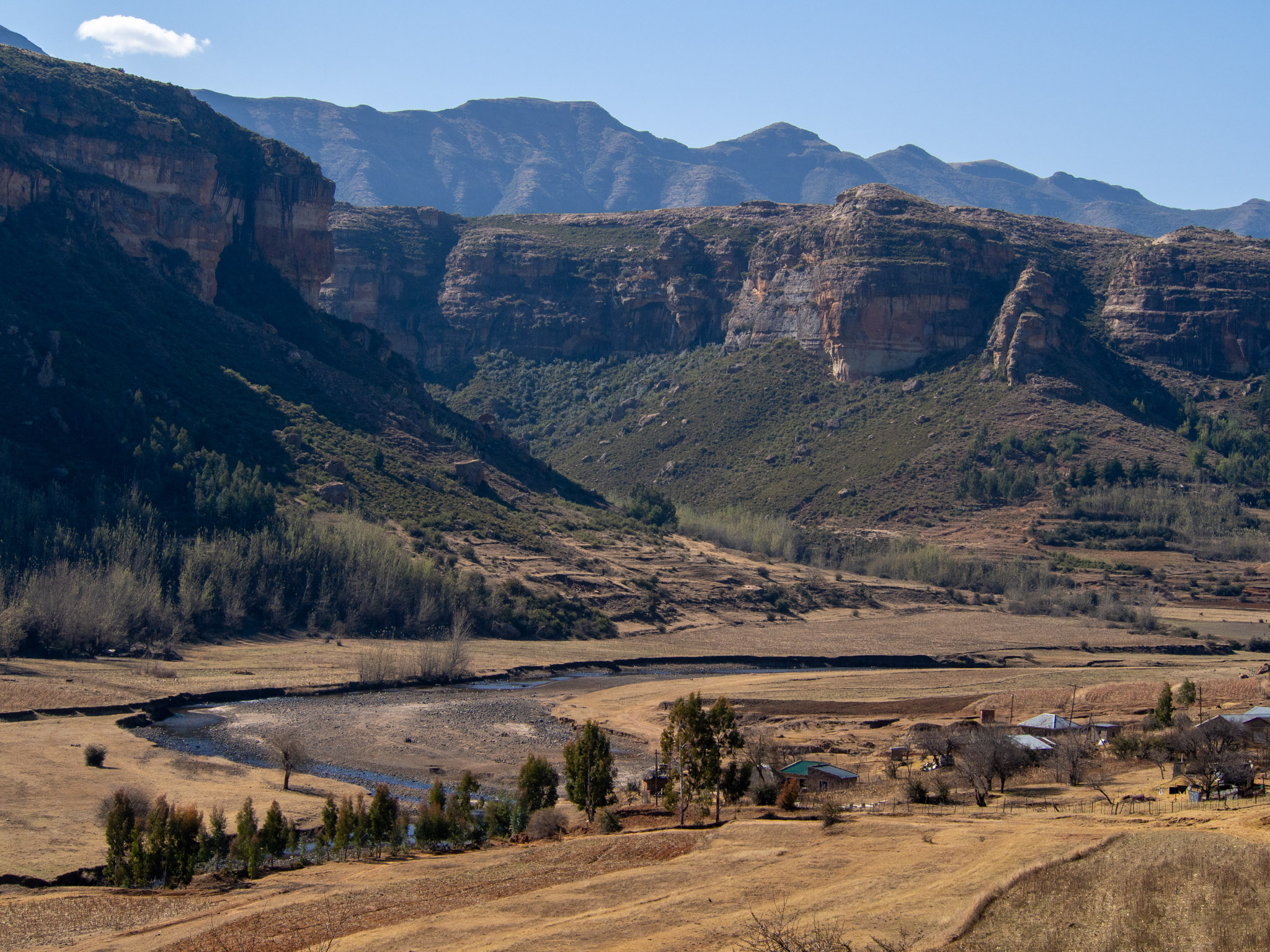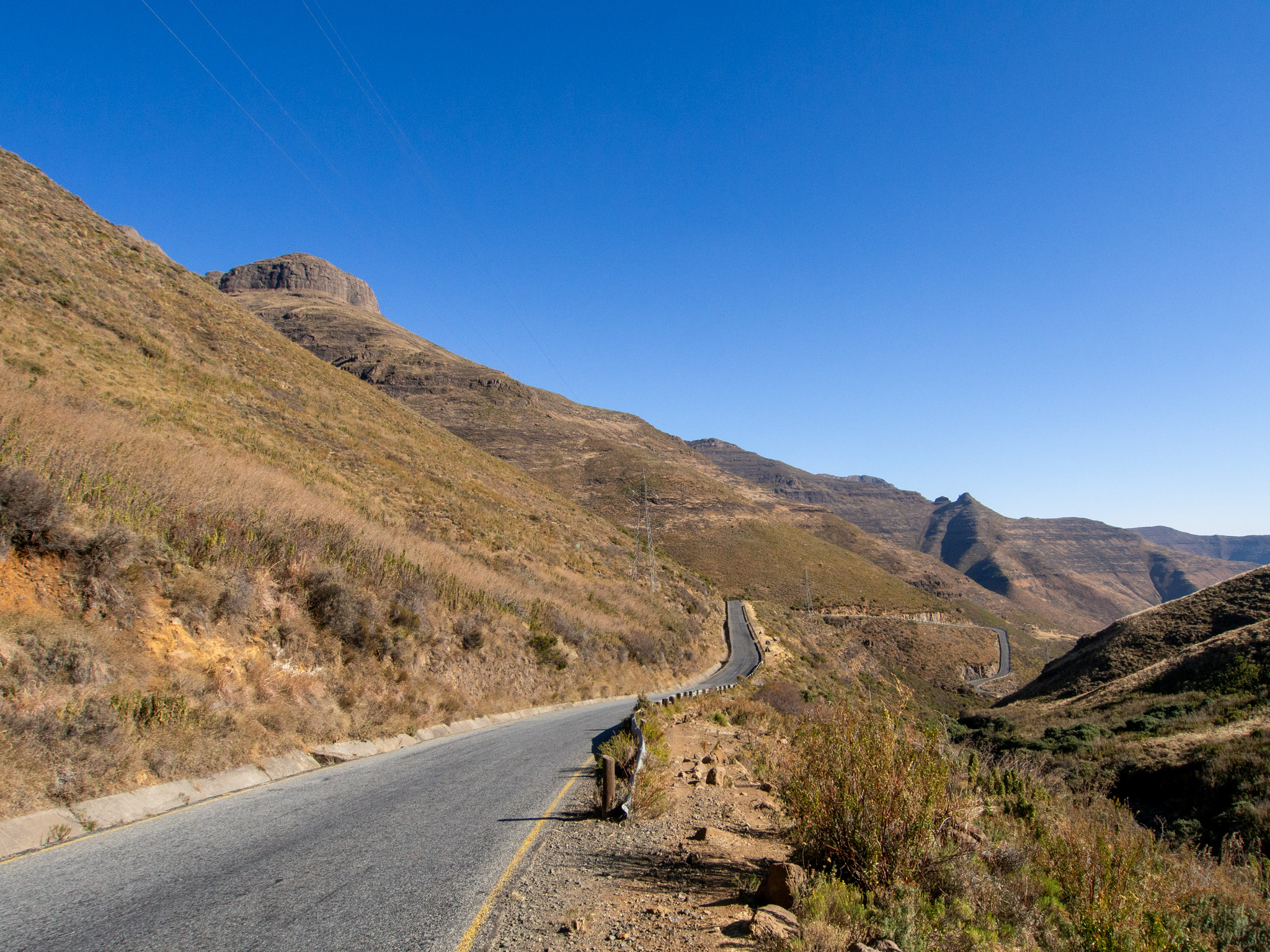 Maintenant on entame la descente pour rejoindre une région plus hospitalière du Lesotho dans les basses terres où se concentre la population. Le paysage est grandiose avec des montagnes acérées.