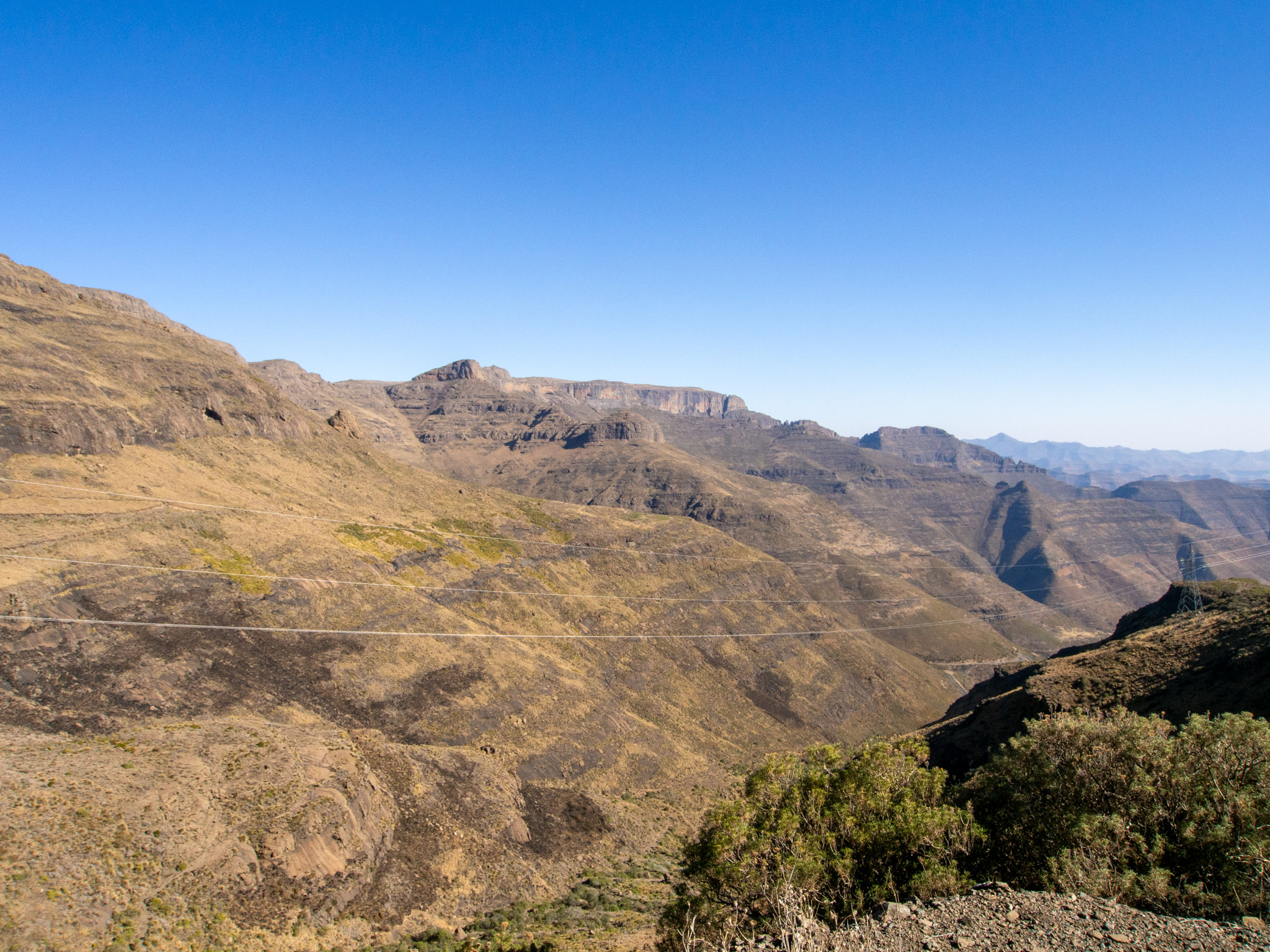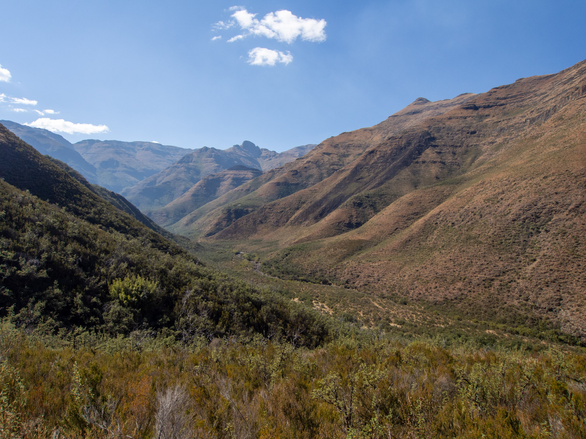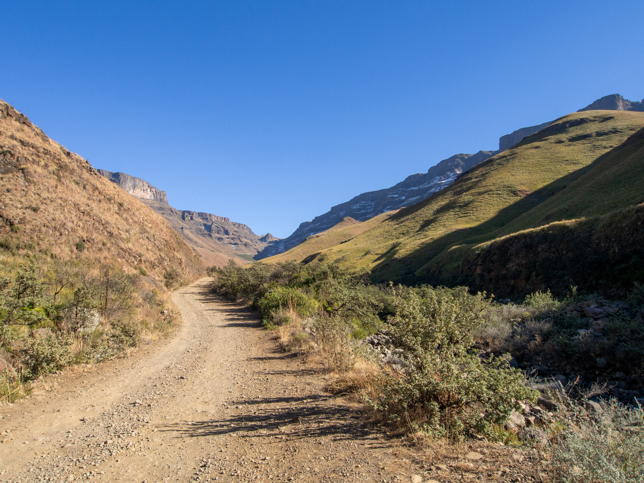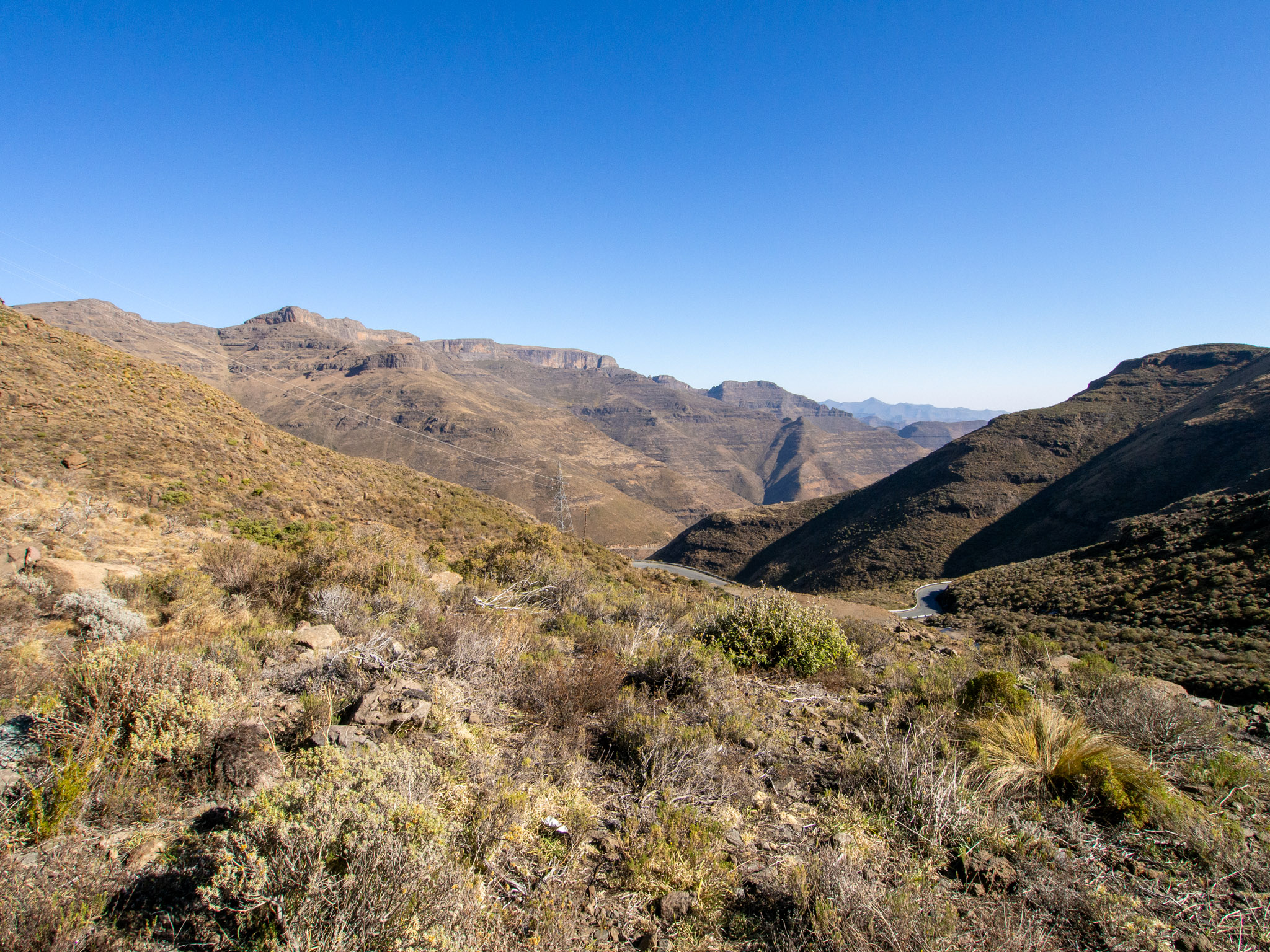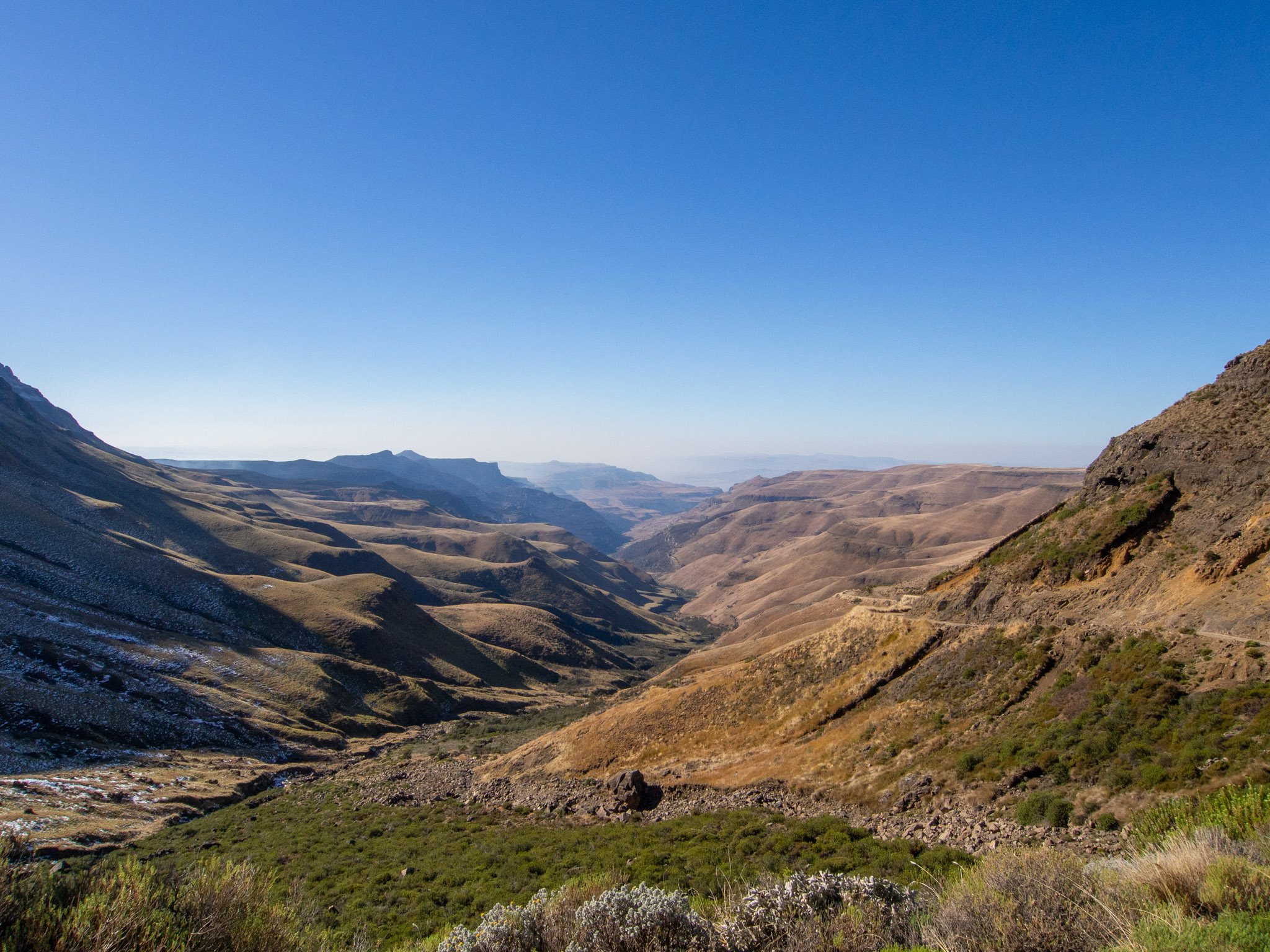 Maintenant on entame la descente pour rejoindre une région plus hospitalière du Lesotho dans les basses terres où se concentre la population. Le paysage est grandiose avec des montagnes acérées.