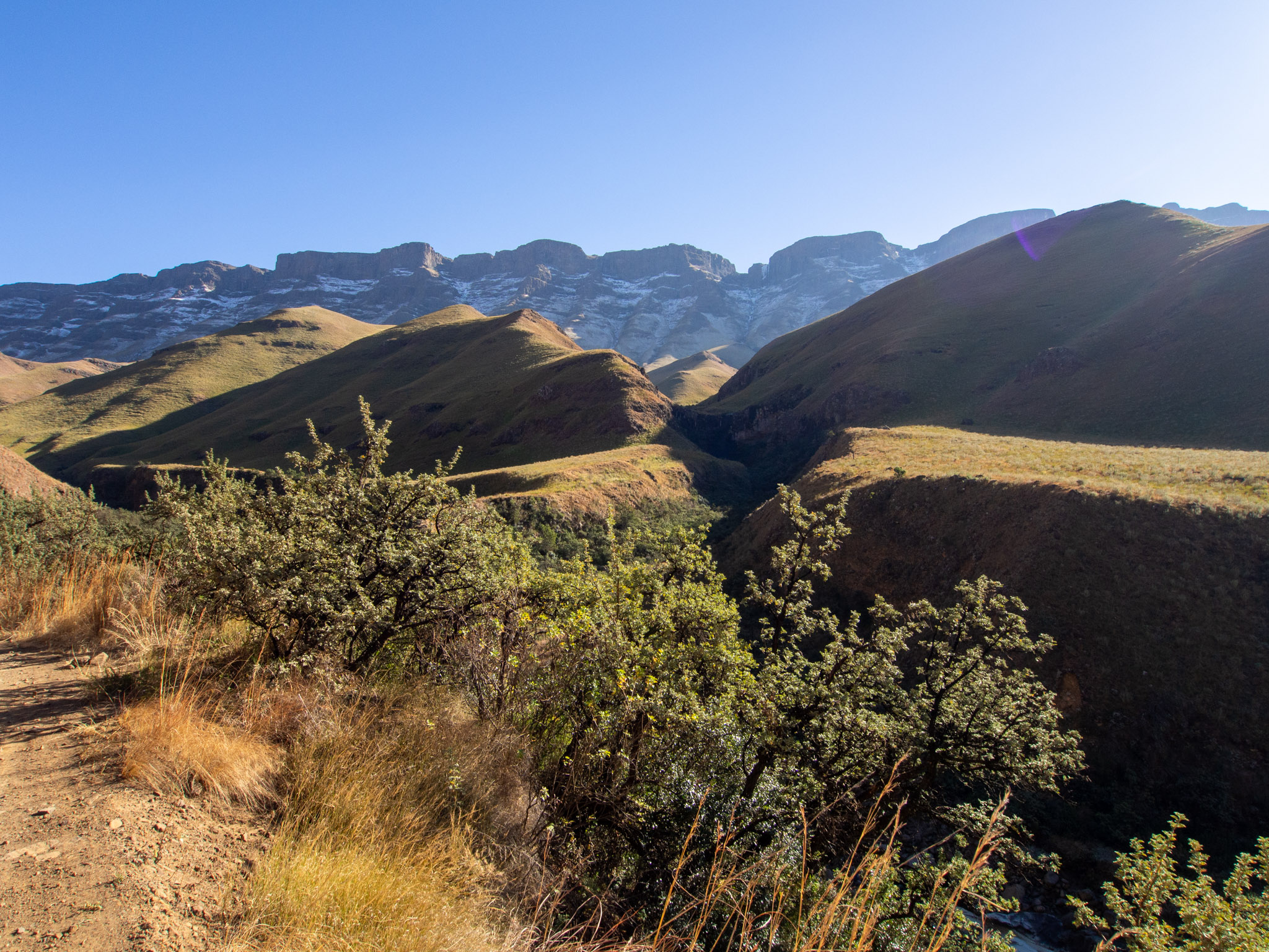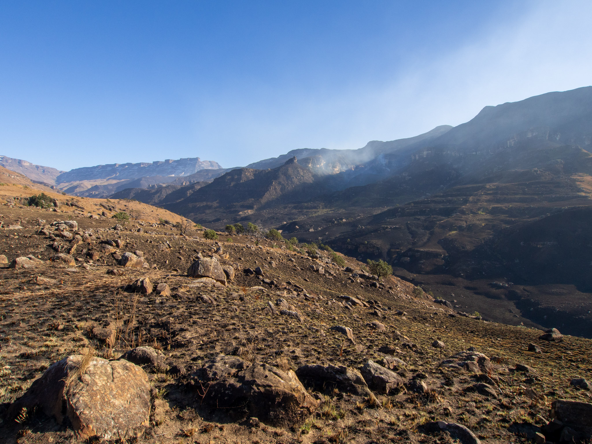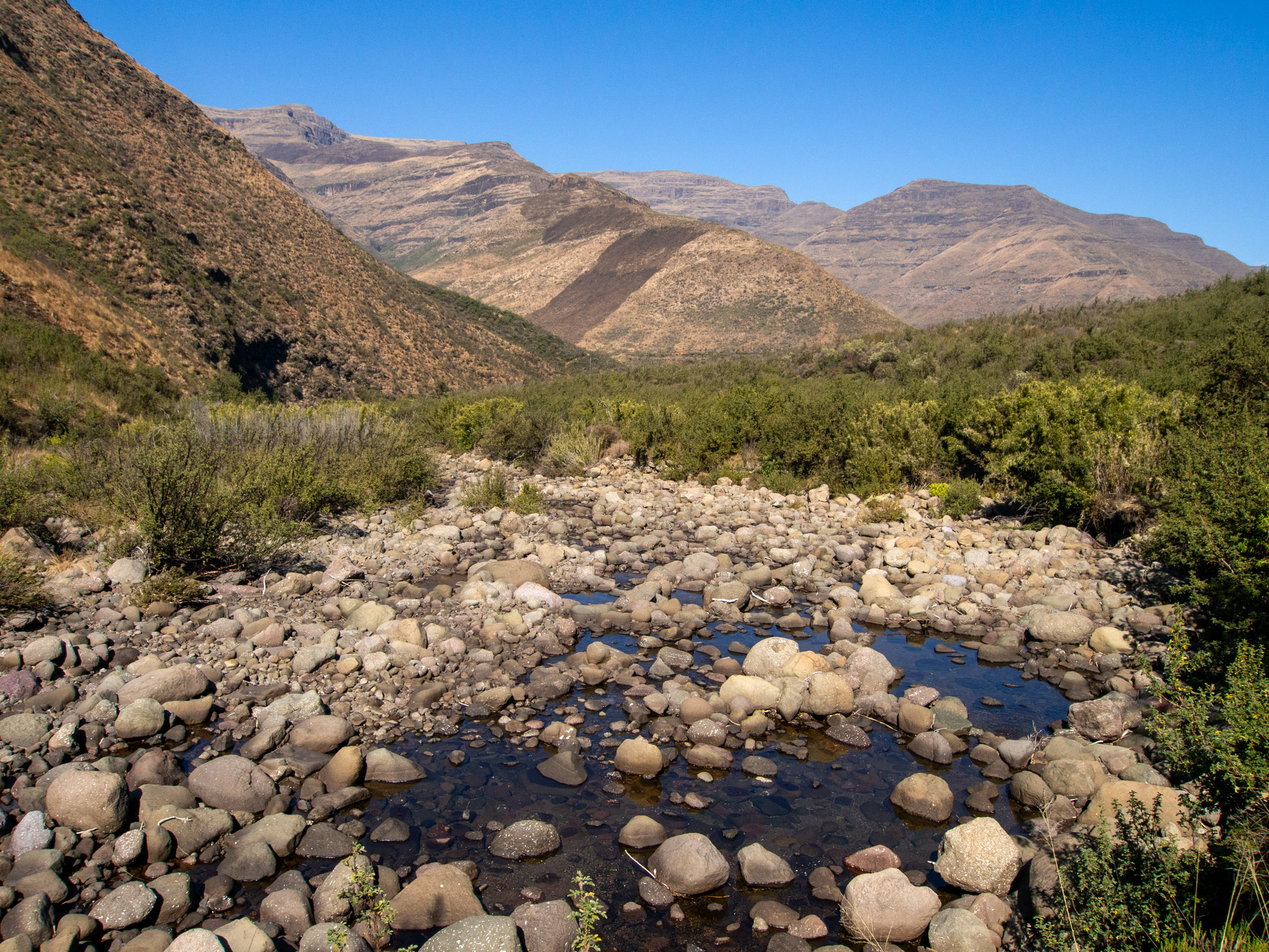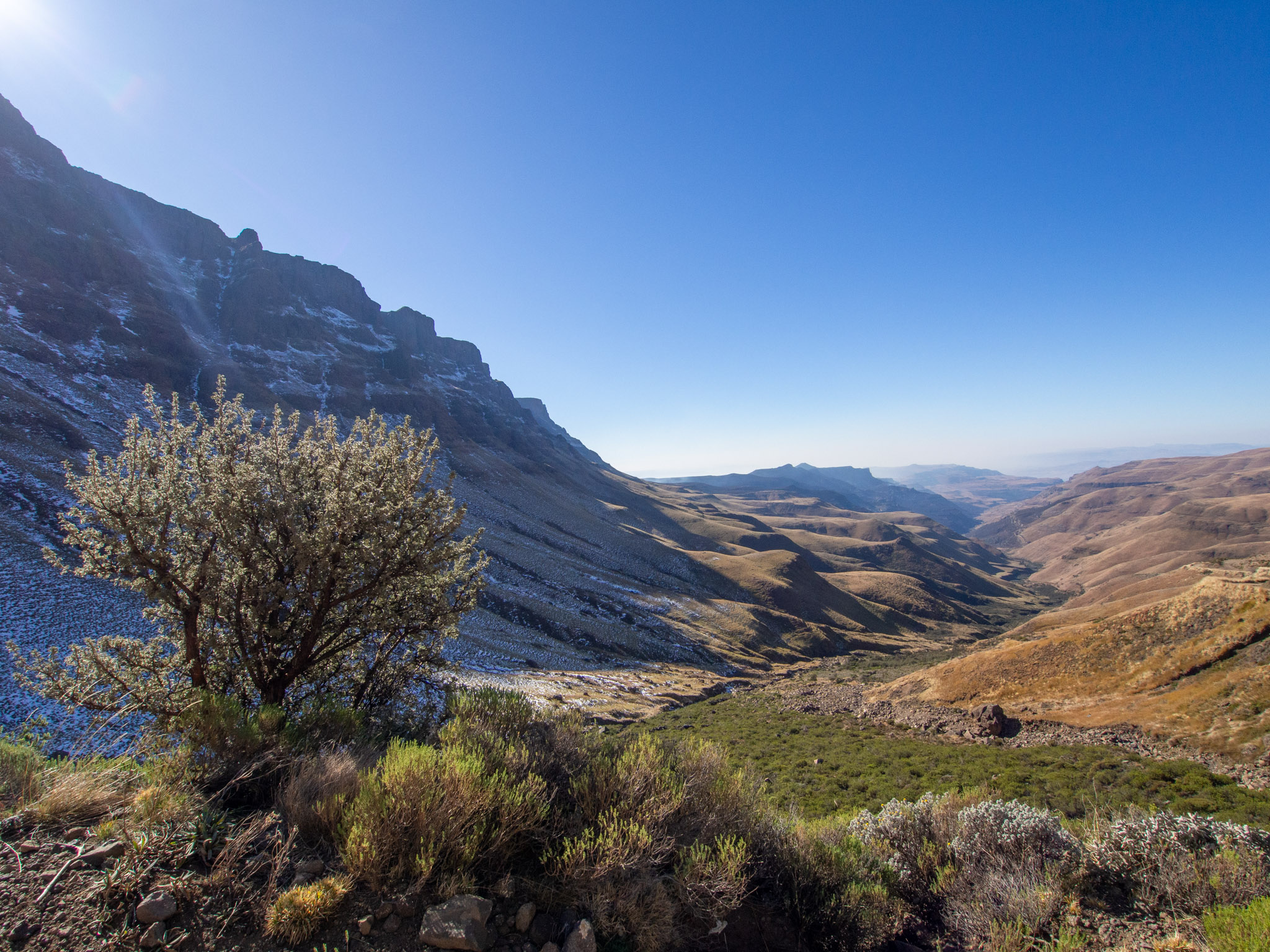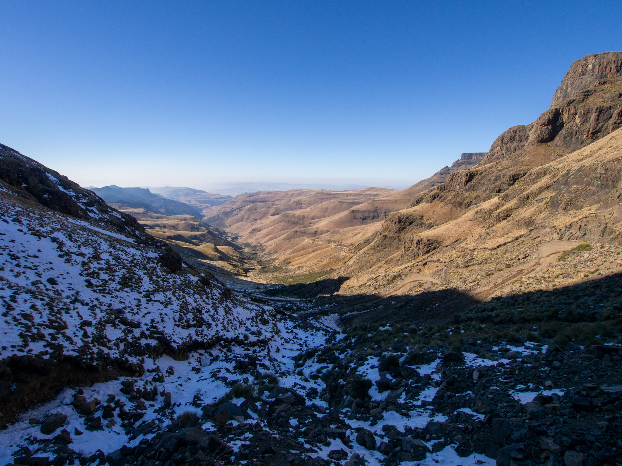 Maintenant on entame la descente pour rejoindre une région plus hospitalière du Lesotho dans les basses terres où se concentre la population. Le paysage est grandiose avec des montagnes acérées.
