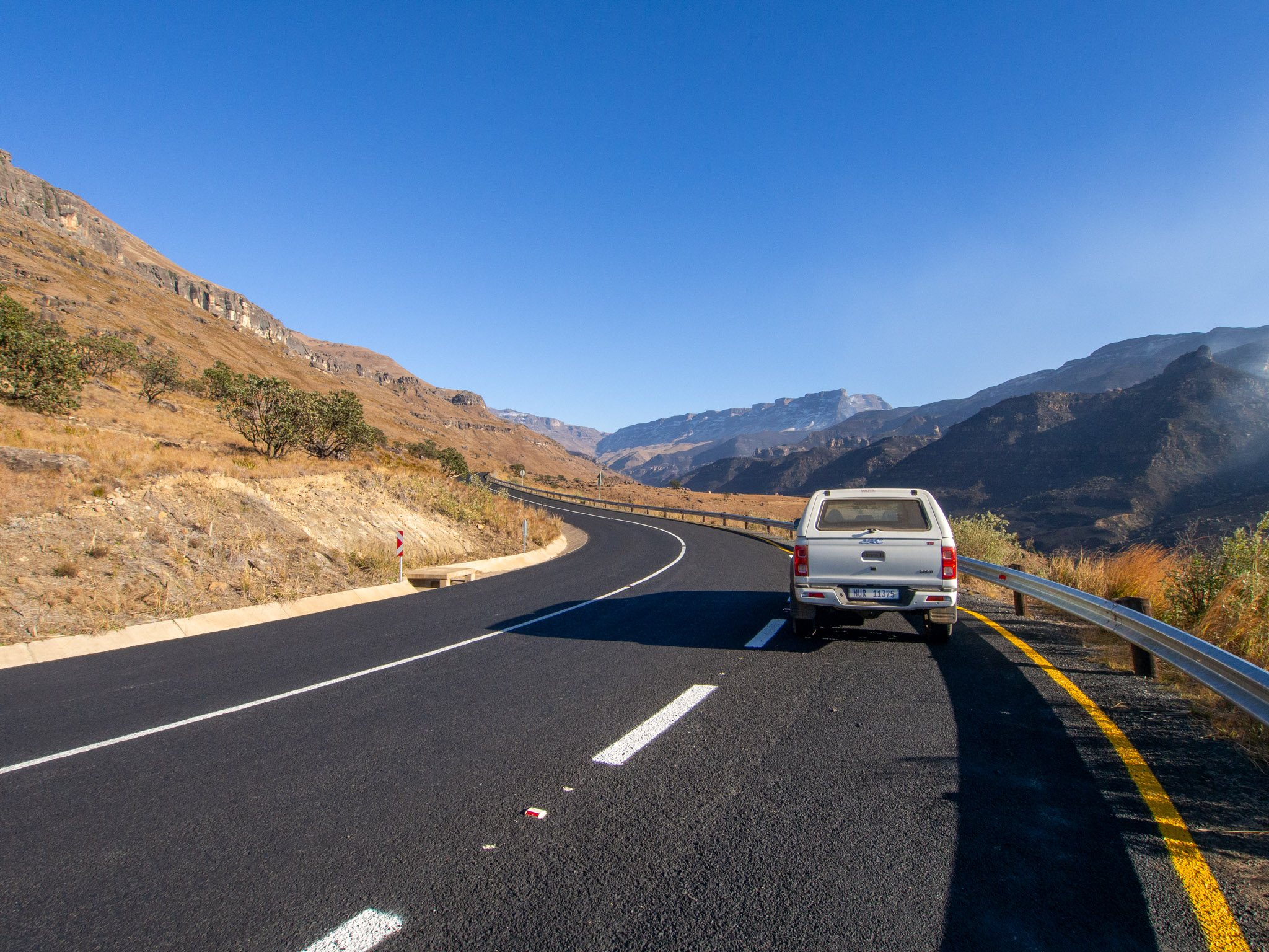Les vagues sont immenses et l’eau semble très claire. On a une vue sur la skyline de Durban, et même le stade qui avait accueilli des matchs de la coupe du monde. Après, on ne peut pas dire que l’ambiance soit très festive sur cette promenade, je ne sais pas comment l’exprimer mais l’endroit ne donne pas envie de se poser. Après avoir fini notre encas, on reprend la voiture et on traverse Durban pour rejoindre l’autoroute. Comme dans une ville américaine, on sort très rapidement du centre ville grâce aux larges voies de circulation. L’autoroute est par contre infernale, elle monte et descend avec le relief et le trafic est extrêmement chargé de camions qui doublent partout et peinent à monter les côtes, il y a des travaux et les voitures vont à une vitesse élevée. C’est la principale autoroute du pays fait la liaison entre Durban et Johannesburg. Un long moment de tension sur 70km, quand on arrive enfin à la sortie direction le Drakensberg, on se dit que l’on a rarement conduit une route aussi dangereuse, malgré mes dix années d’expérience de conduite en Chine. On arrive finalement à la nuit tombée à notre hôtel, le Sani Pass Resort. L’endroit est très agréable, la chambre est toute équipée, c’est parfait après cette journée de route, il y règne une ambiance montagnarde très différente de Ste Lucia. Dans la salle de restaurant, une grande cheminée réchauffe la pièce, il fait 4 degrés dehors. Demain on se lève tôt pour attaquer une des routes les plus emblématiques du Sud de l’Afrique. Je suis impatient de m’y confronter. Lorsque je vérifie les papiers que l’agence de location m’a envoyé pour passer la frontière, je me rends compte que la lettre de cross border mentionne Swaziland et non pas Lesotho. J’avais pour tant appeler la veille pour demander cette lettre en mentionnant précisément nos plans et ils m’avait confirmé qu’il n’y aurait pas de problème. Comme le document n’était pas arrivé le matin, j’avais rappelé plusieurs fois depuis la voiture pour avoir ce papier. Donc c’est seulement le soir vers 8h que je reçois le précieux sésame et me rends compte du problème. Je crains de ne pas pouvoir passer ma frontière et être refoulé aux pieds du Sani Pass par les gardes frontière sans ce document. Je n’y ai jamais été donc je ne sais pas et je préfère insister pour tout avoir en ordre. Je rappelle l’agence pour avoir une nouvelle lettre mais c’est très compliqué, ils me renvoient d’un service à l’autre, je passerai une dizaine de coups de téléphone, la personne que j’arrive à joindre me promet une réponse au plus tôt et qu’il me rappellera. Il envoie même un e-mail interne à ses collègues tout en mettant en copie, je refais un e-mail derrière pour rappeler qu’il me faut le document au plus tôt car je compte passer la frontière en début de matinée. On me dit de patienter. Lorsque j’éteins le téléphone, je n’ai toujours rien reçu. Après une petite nuit de repos, je me réveille et vérifie ma boîte mail et toujours rien non plus. Pendant que ma copine se prépare, j’essaye de rappeler mais personne ne répond. Finalement on prend la décision d’y aller quand même, d’avisée sur place et si on a un problème avec les gardes frontières, on appellera avec eux directement l’agence. On s’engage donc sur la route du Sani Pass qui est très roulante jusqu’à la frontière.