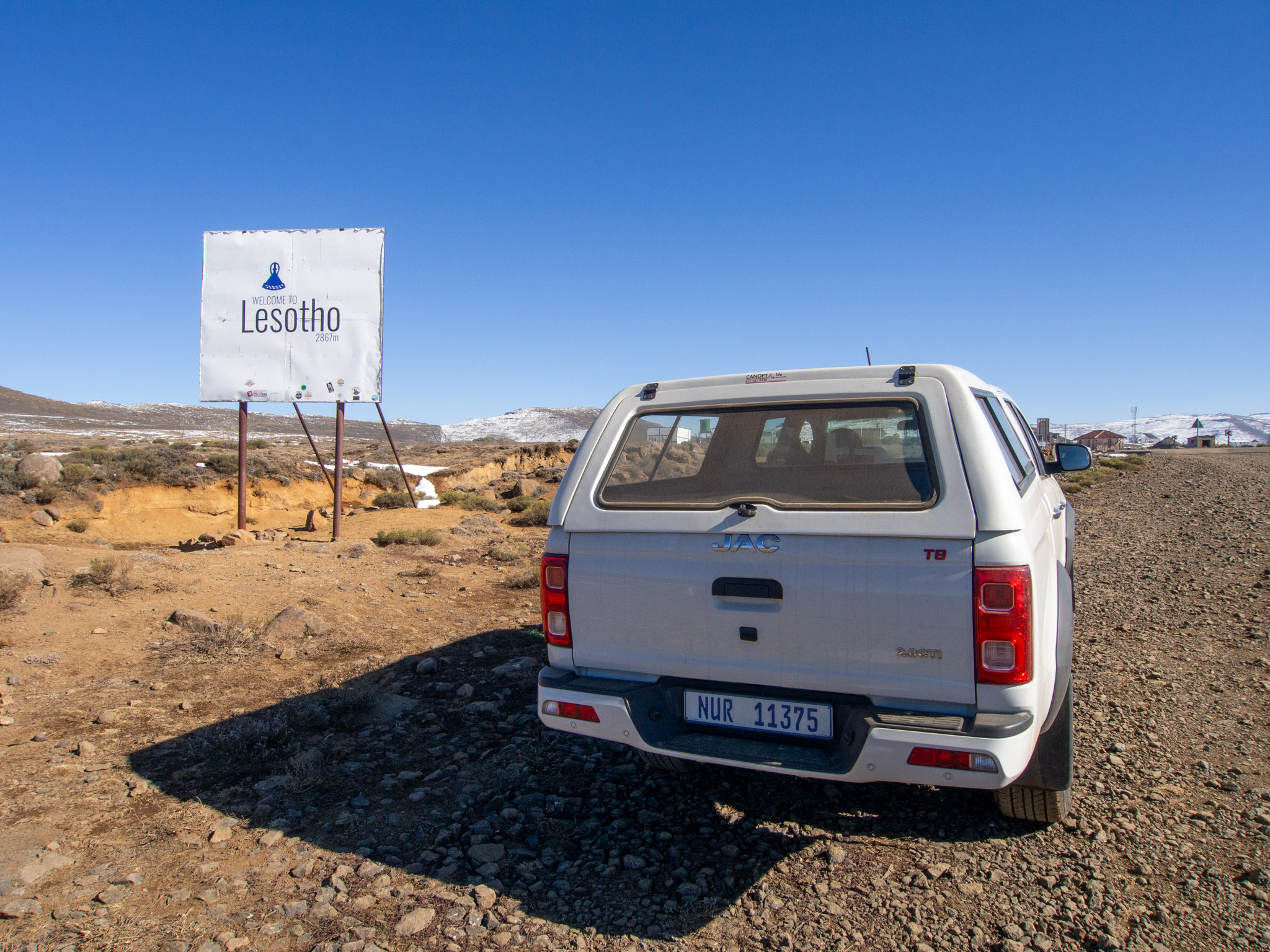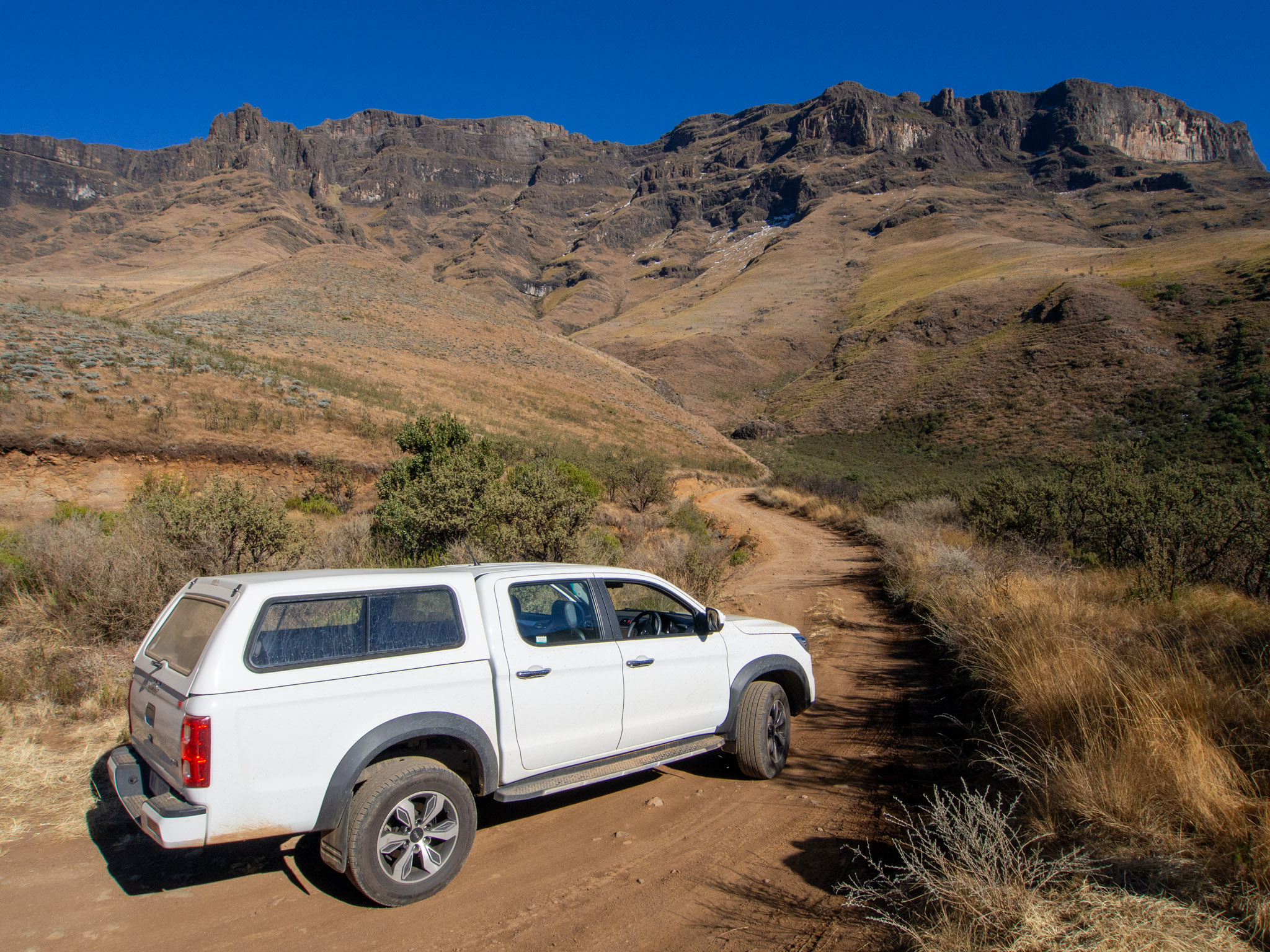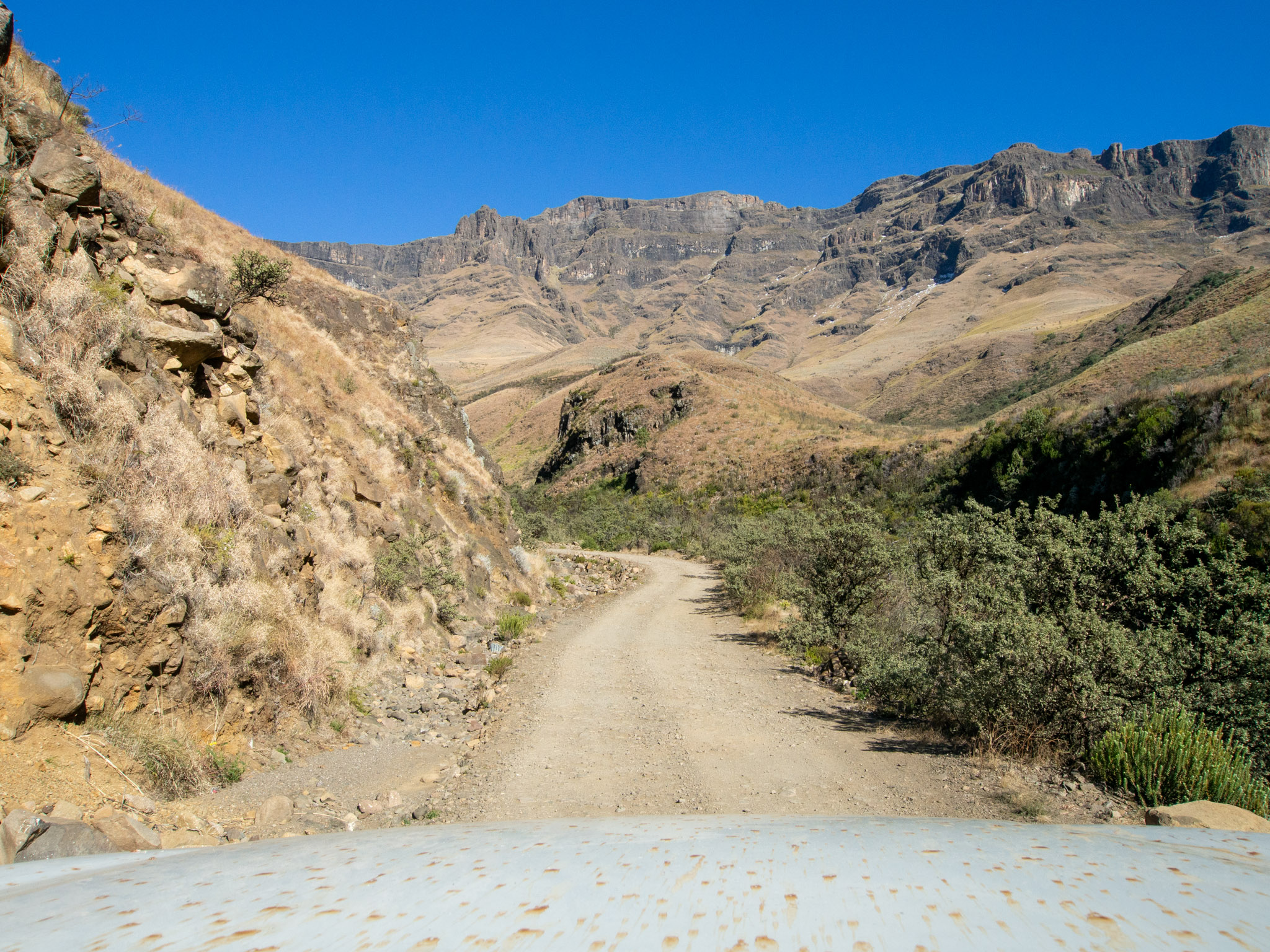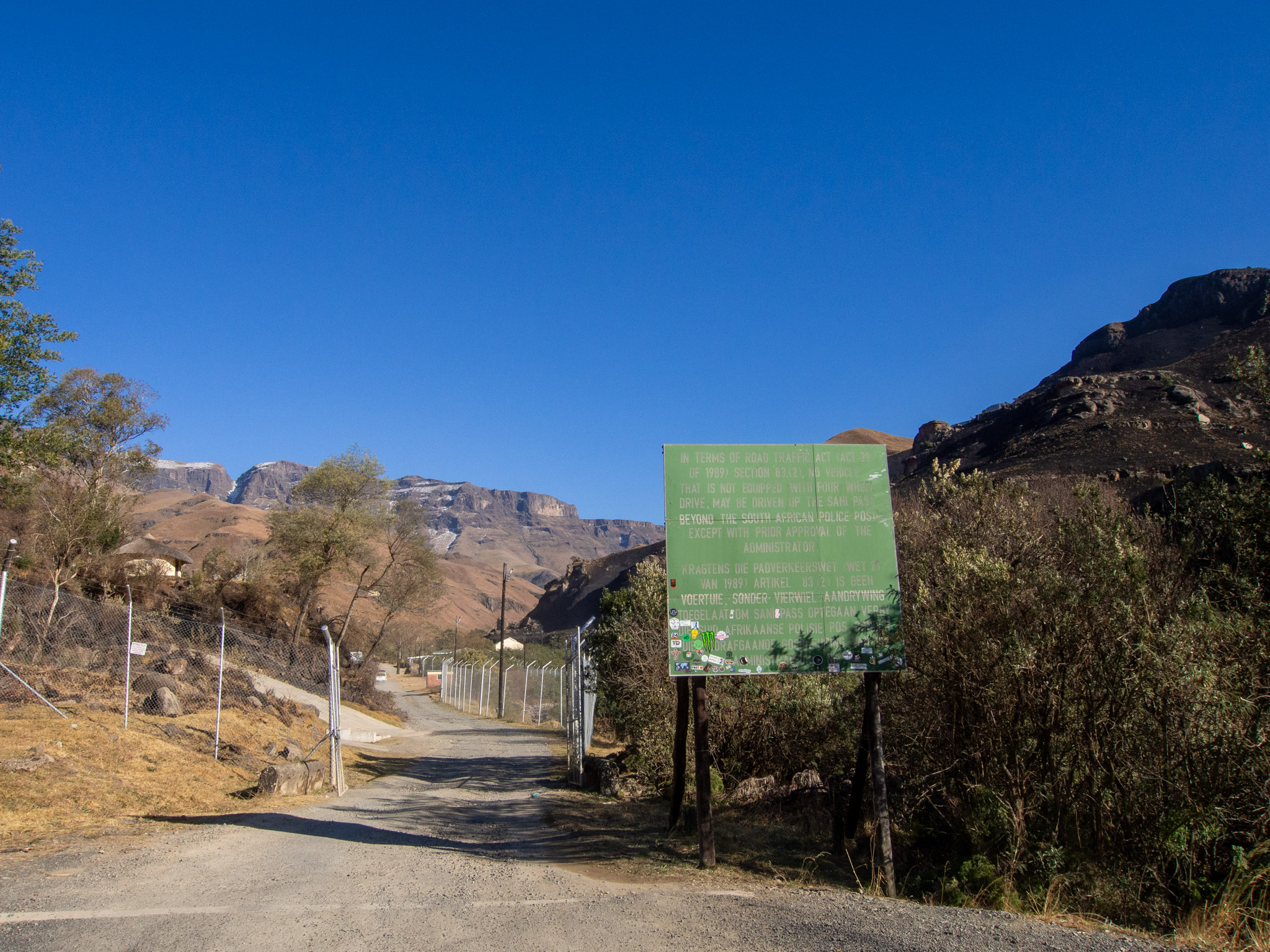 Lorsque l’on se gare devant la petite maisonnette au pied de la piste, il y a déjà une autre voiture. Un gros pickup japonais avec deux allemands. Lorsque vient notre tour, on nous demande notre modèle de véhicule, le numéro de la plaque d’immatriculation et nos passeports. Rien de plus concernant la voiture. Finalement tous ces appels téléphoniques pour rien. Par contre, l’agent tique sur le passeport de ma copine. Il trouve un problème avec le visa pour l’Afrique du Sud qui est selon lui périmé. Il nous dit que l’on a légalement pas le droit d’être ici. Et que la personne au poste frontière du Swaziland n’aurait pas dû nous laisser entrer. Moment d’incompréhension. On essaye de comprendre ce qu’il veut dire par la. Finalement, c’est parce qu’il a confondu le chiffre « 7 » et « 1 » ou l’inverse dans la date d’autorisation maximale sur le territoire écrit à la main sur le talon. Tout rentre dans l’ordre et on peut donc passer. Ca y est, on s’engage sur la fameuse piste qui va nous emmener au royaume des montagnes, tout la haut. En effet le pays est enfermé au cœur d’une chaîne de montagne qui culmine à plus de 3200m est très inaccessible. On peut voir notre d destination, ce col à 2876 mètres que l’on va atteindre après un voyage épique de 8 kilomètres sur une piste très exigeante.