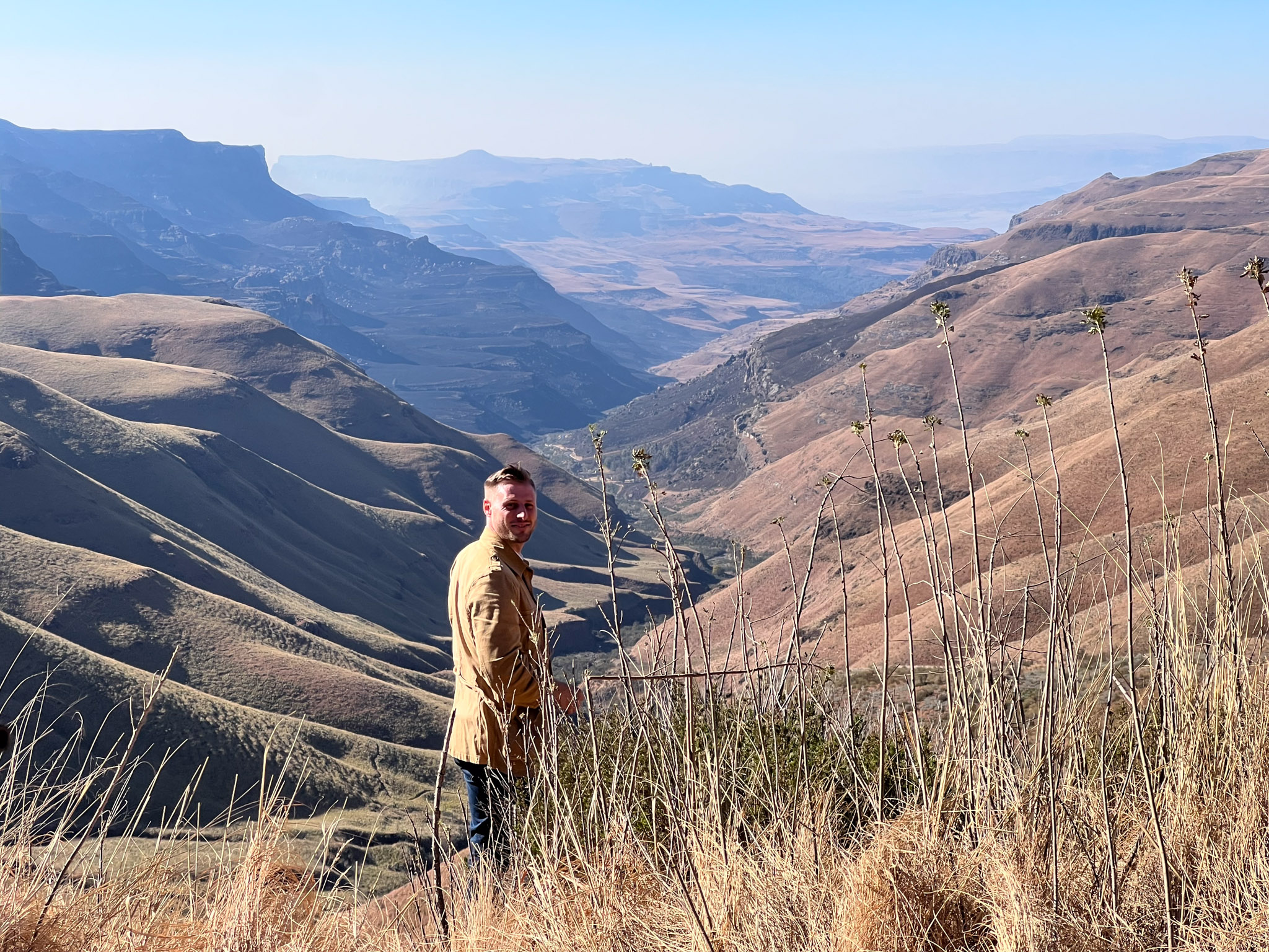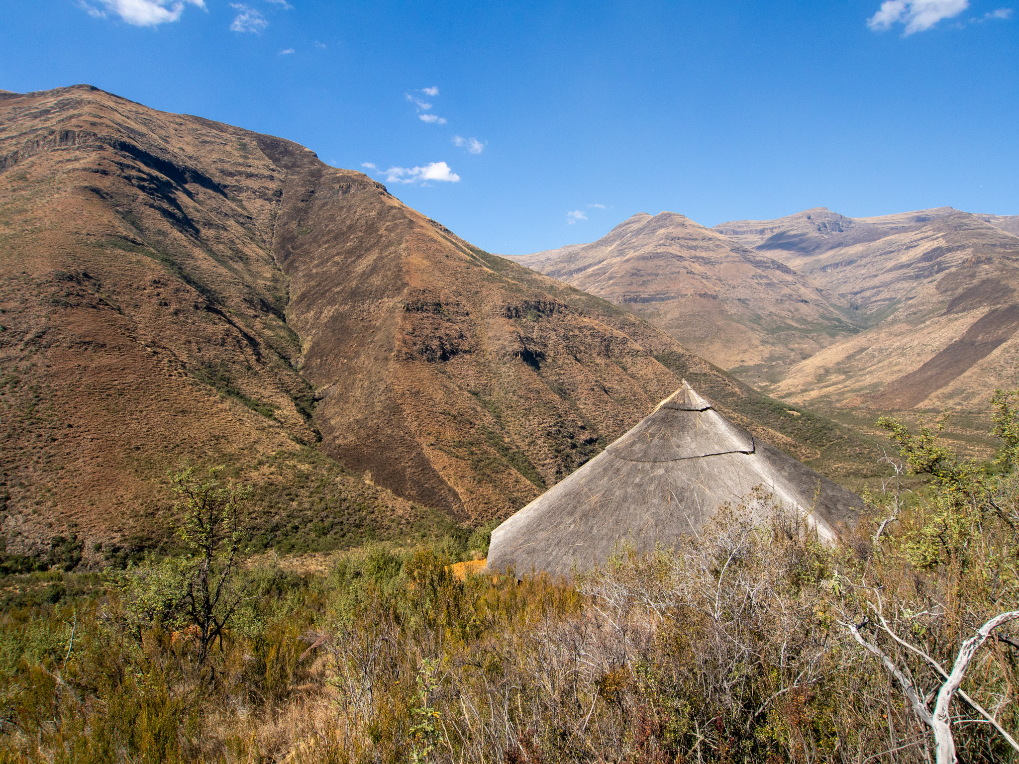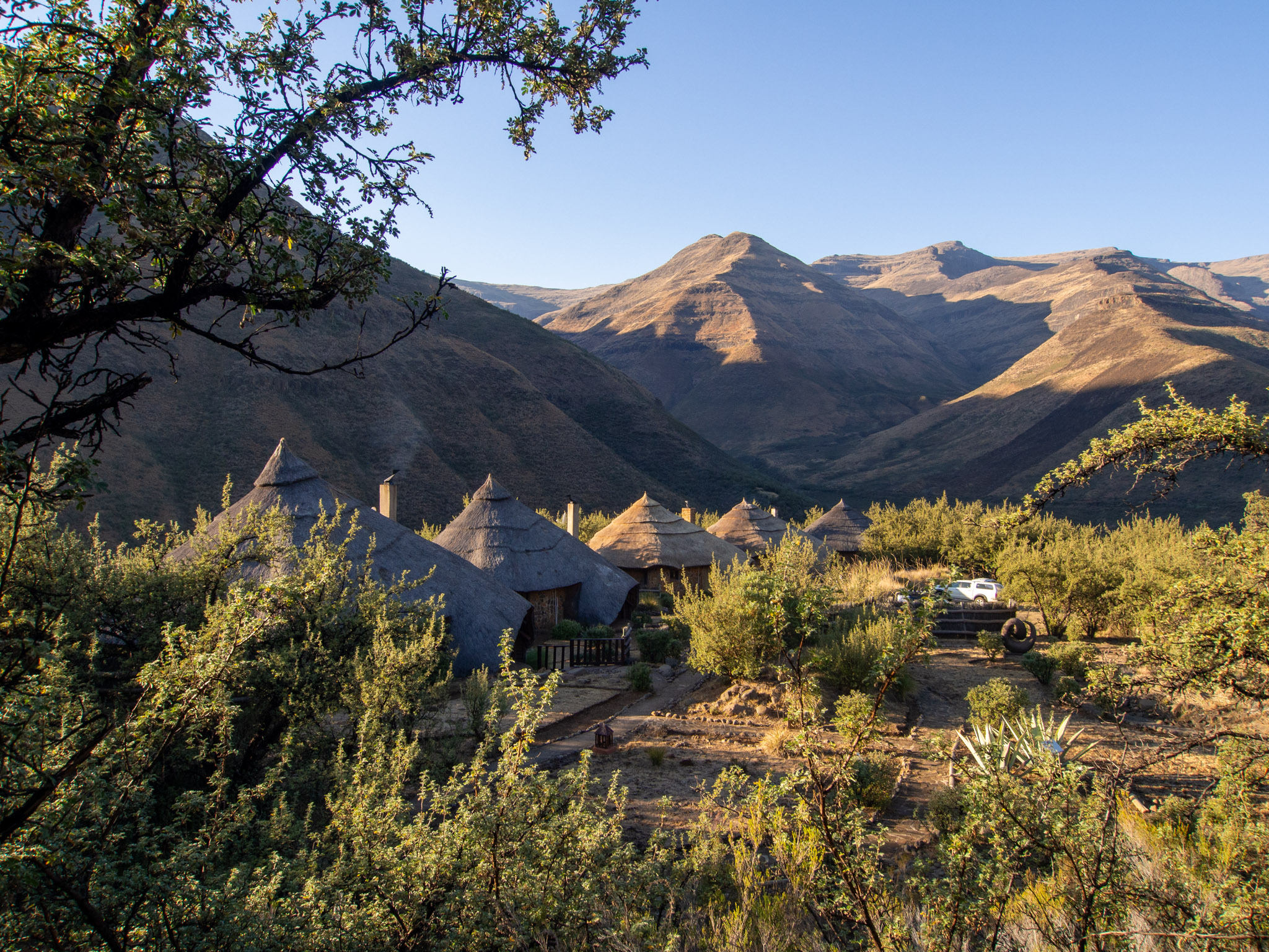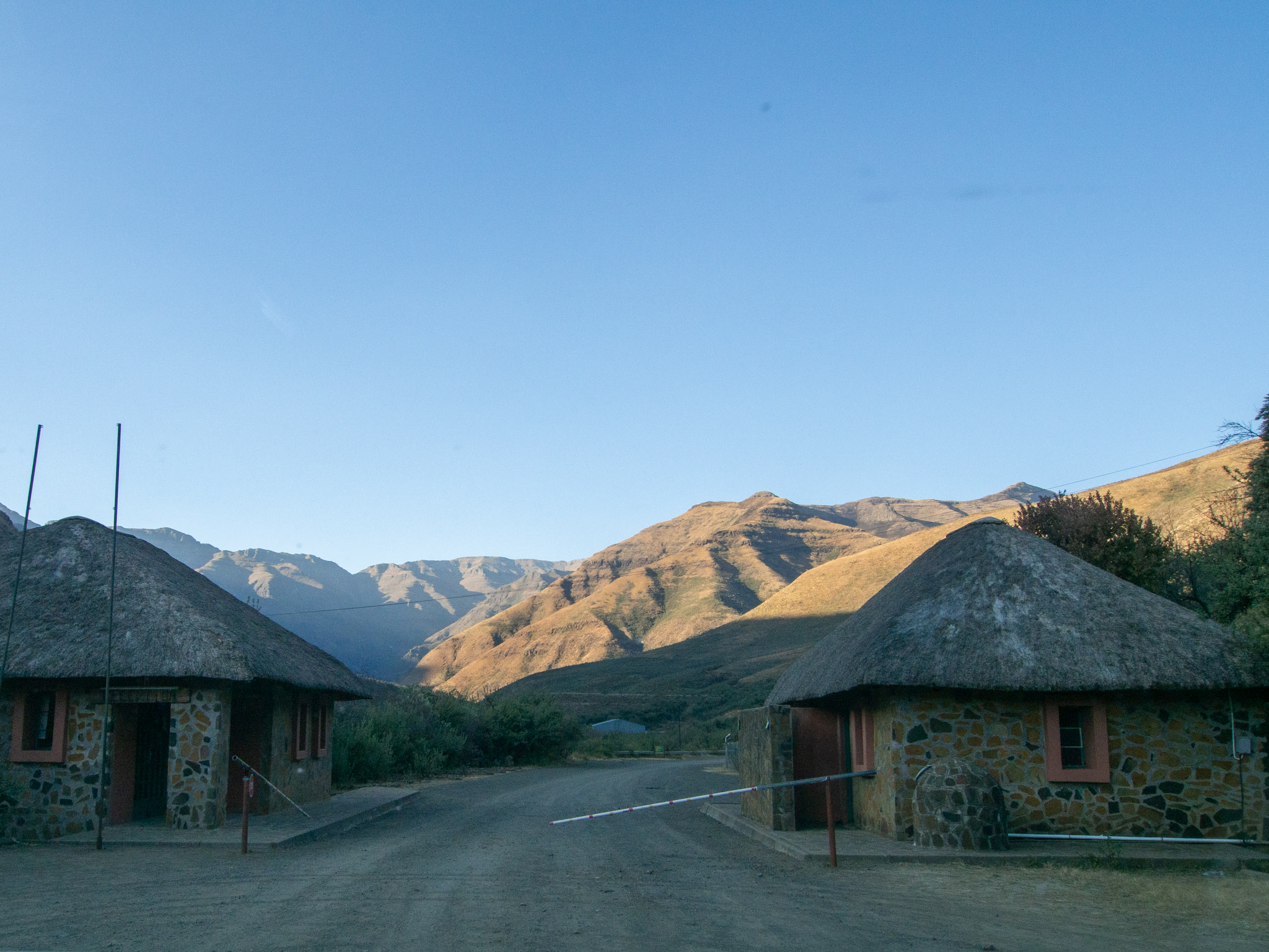 L’altitude plus basse et la proximité avec l’Afrique du Sud doit aider au développement local. Mais c’est encore très rural avec beaucoup d’enfants qui gardent le bétail sur le bord des routes. Certains nous font un signe de la main, et malheureusement d’autres font le signe de l’argent ou tendent la main pour que l’on donne quelque chose. Concernant les adultes, il y a plusieurs spécificités que l’on remarque. Déjà la plupart des hommes portent une épaisse couverture sur eux. Ensuite, ils ont presque tous une cagoule sur la tête, on ne voit quasiment pas le visage des gens. Et ce n’est pas une exception mais la grande majorité. Mais pas les femmes qui elles sont habillées bien plus normalement. Par contre plus personne ne porte le chapeau traditionnel du Lesotho, un chapeau de paille pointu qui est l’emblème du pays et que l’on retrouve même sur le drapeau. On arrive en fin de journée au lodge de Madiba, le seul hôtel cinq étoiles du Lesotho, perdu tout au fond d’une route et niché au cœur des montagnes dégarnies typiques du Drakensberg.