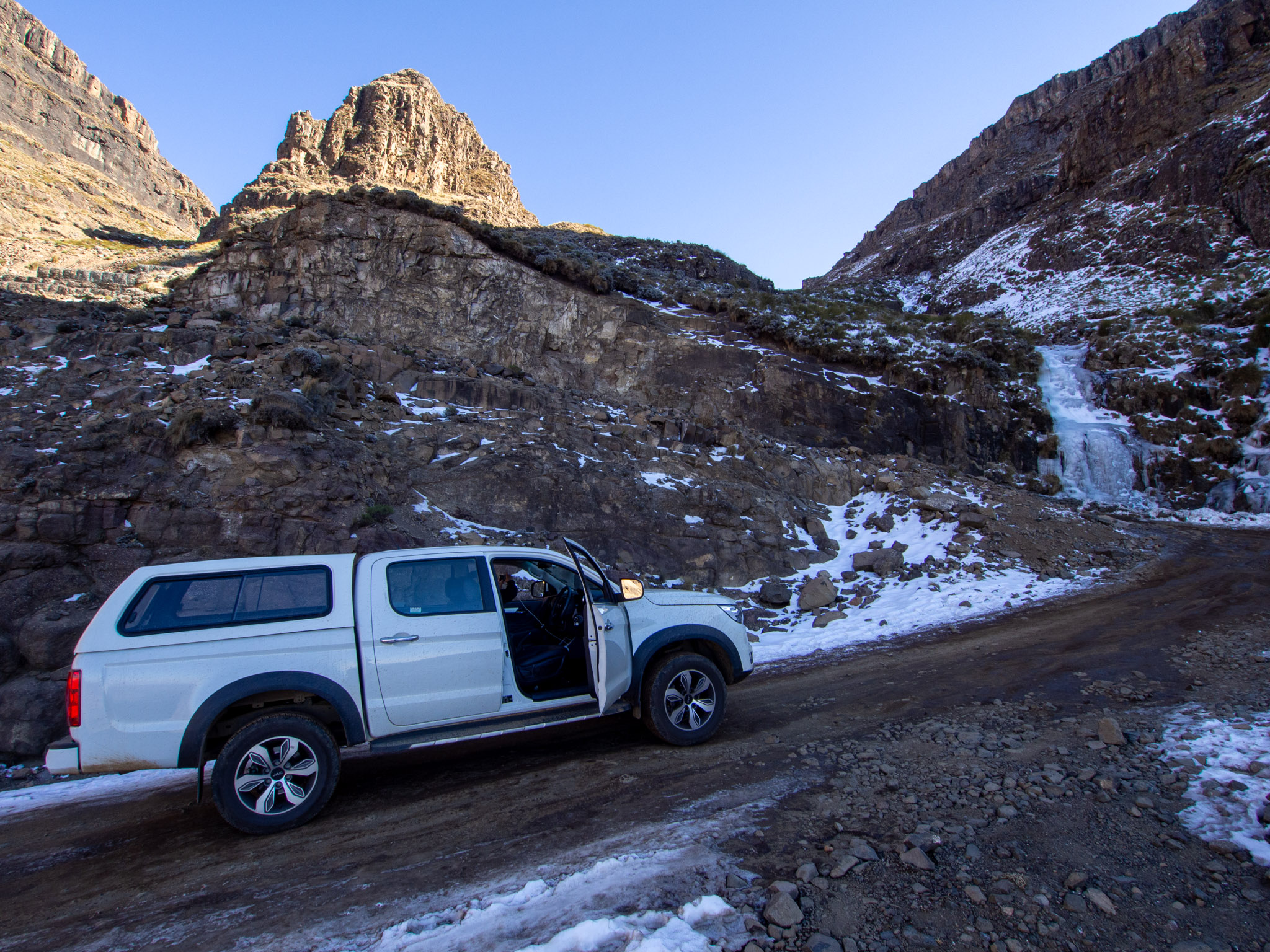 A un moment donné, on passe devant une cascade glacée, le vent souffle très fort en rafale, le temps est extrême. La voiture passe avec énormément de difficulté mais y arrive jusqu’à un moment où non ça ne passe pas, il y a une grosse Pierre qui dépasse ce qui rend la route encore plus raide et il y a de grosses plaques de glace. On est bloqué, je laisse la voiture reculer un peu en arrière histoire de retenter en passant sur le bord du chemin où c’est moins raide. Je recule et la voiture ne veut pas freiner, je vois ma copine qui commence à vraiment avoir peur. Elle veut crier de peur. Je lui dis qu’il faut me faire confiance ce, le 4x4 a juste besoin de trouver une zone d’adhérence suffisante pour passer l’obstacle qui n’est pas insurmontable si on passe sur la droite au bord. Elle me fait comme confiance même si elle est effrayée. Elle a eu très peur que la voiture continue de glisser en arrière jusque dans la falaise. La deuxième fois, on y va en prenant suffisamment de puissance et passant au bord a droite et ça passe, non sans difficulté. Le reste de la montée sera moins difficile et surtout on prend assez d’élan pour éviter de se retrouver dans la même situation inconfortable. Ça bouge dans tous les sens, la route est extrêmement mauvaise mais on fait tout d’une traite. On arrive sain et sauf tout en haut du col, devant la barrière de la frontière du Lesotho.