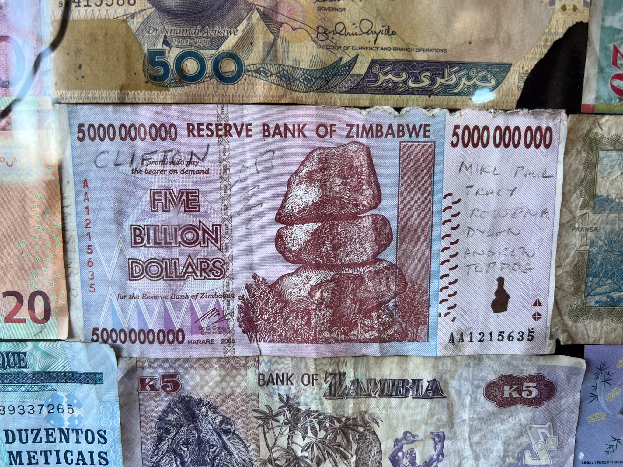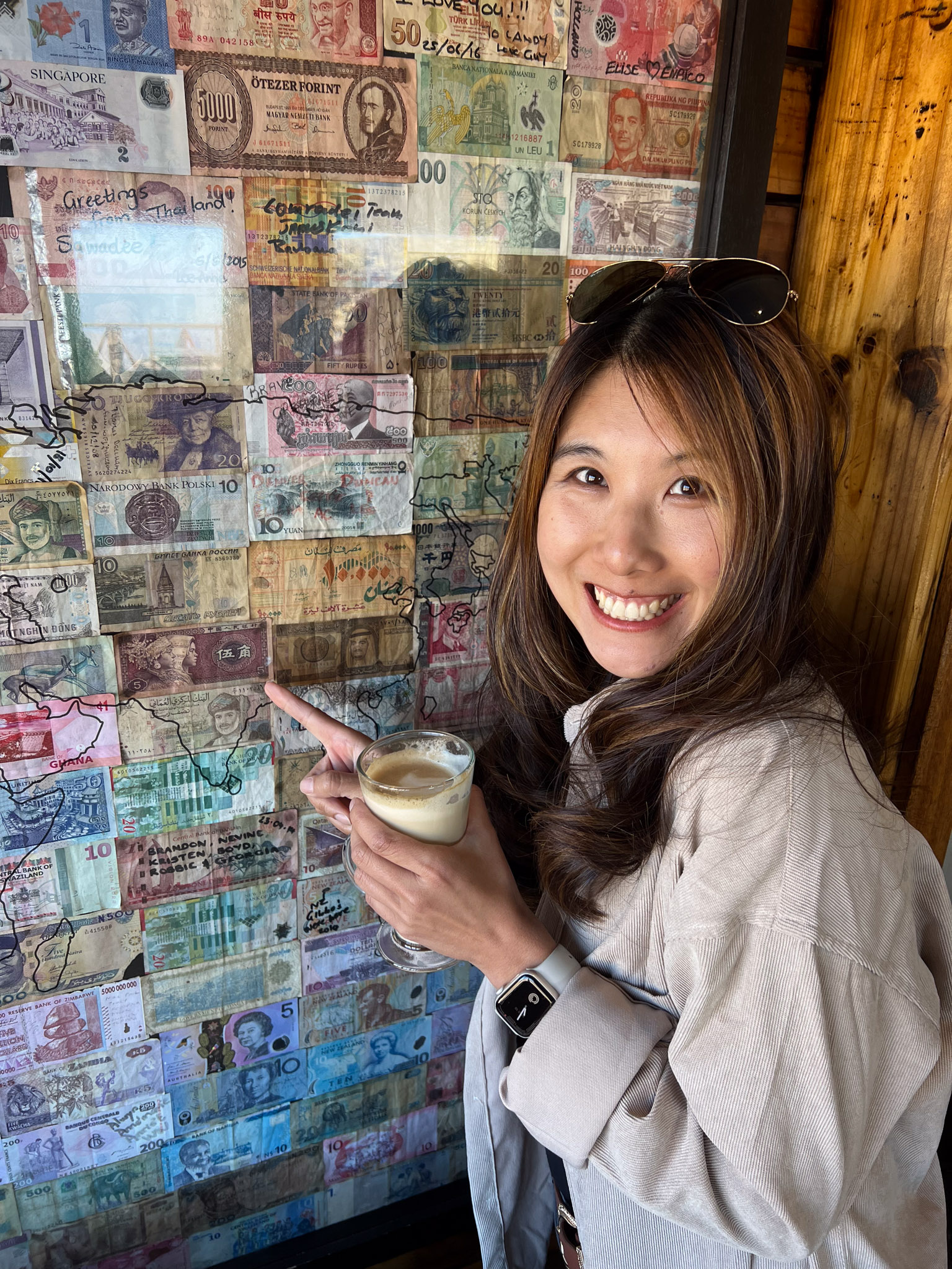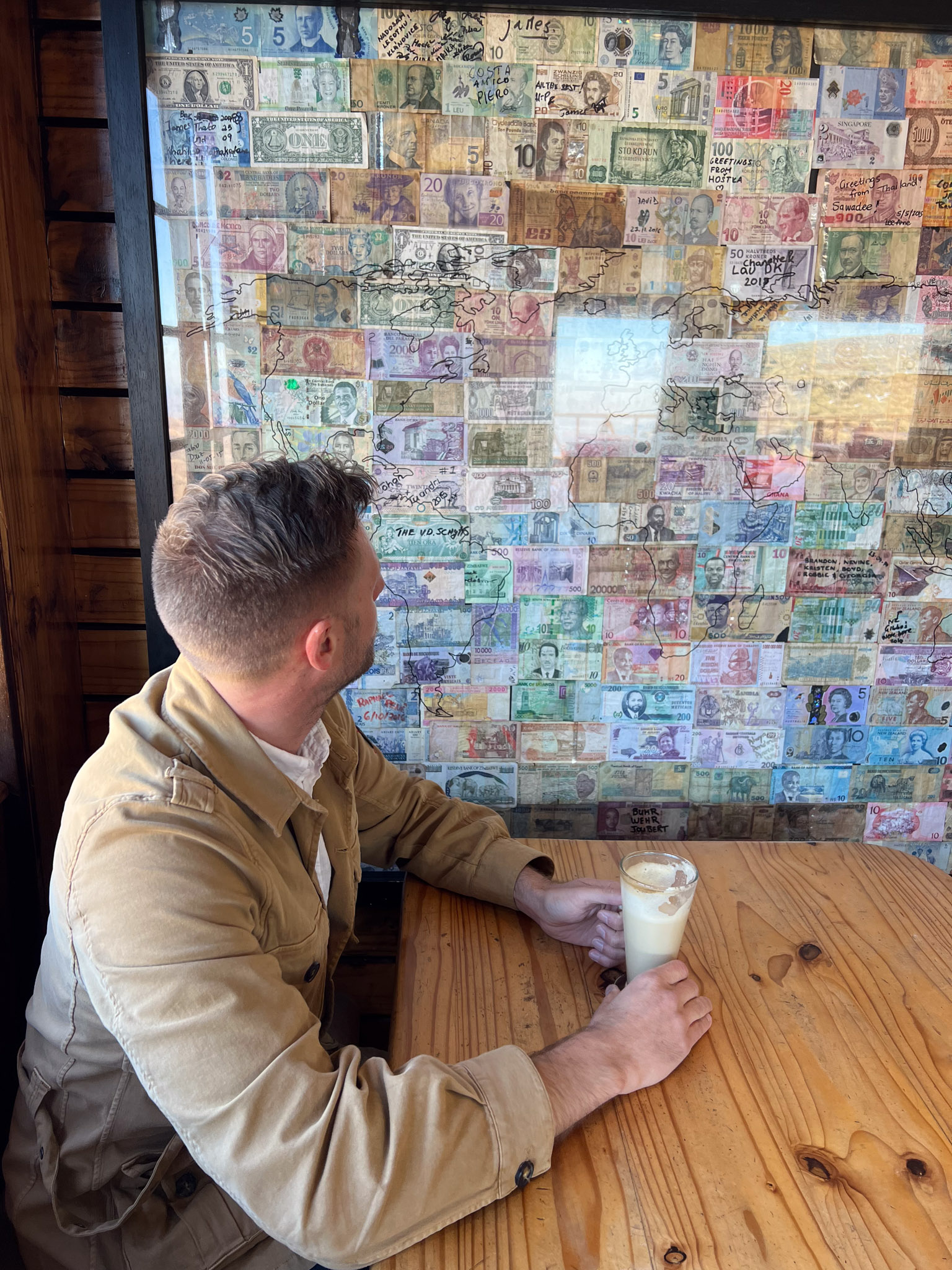 Il y a un panneau avec tous les billets du monde entier déposé par les voyageurs.