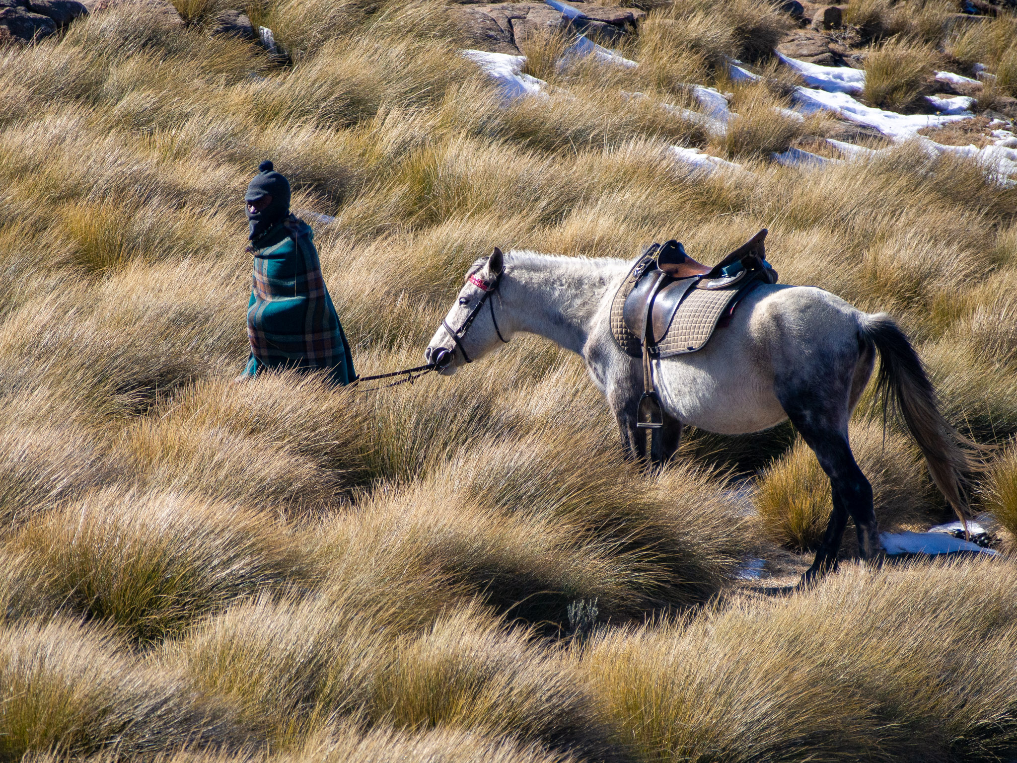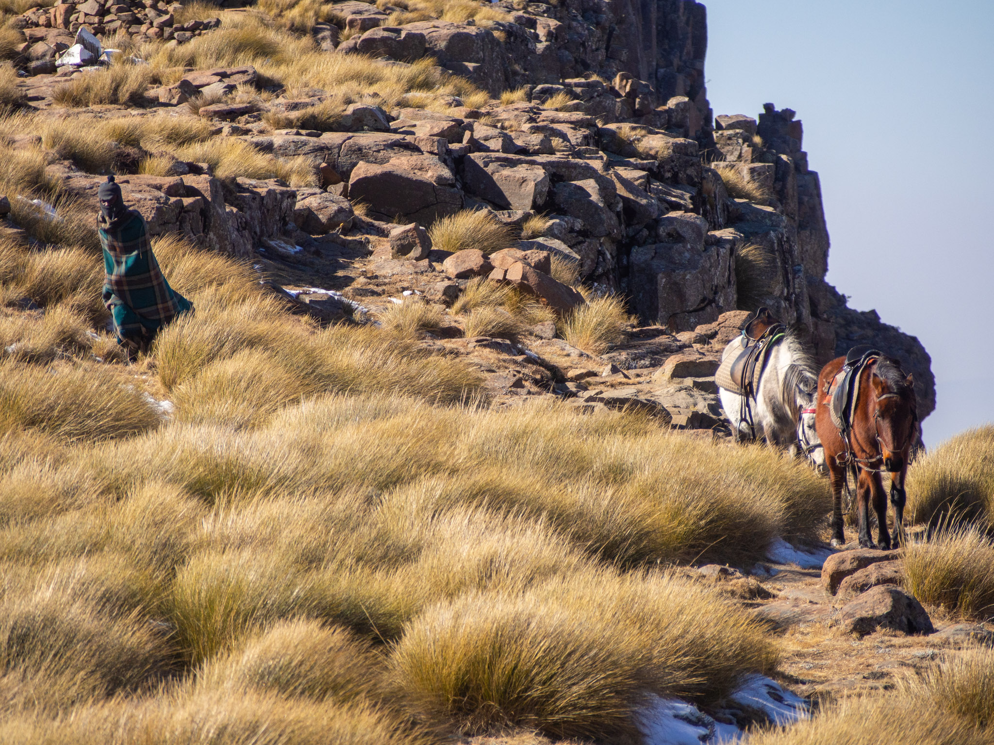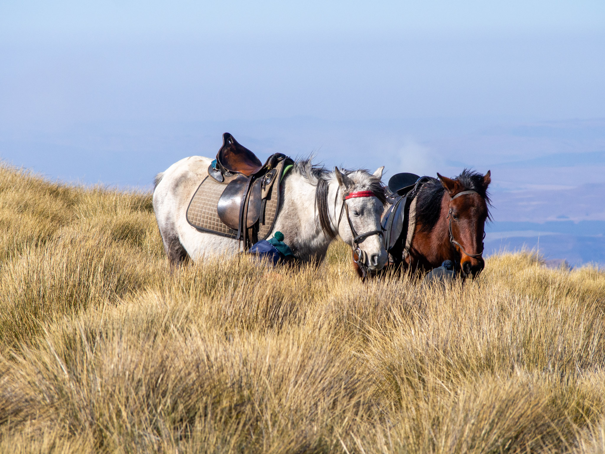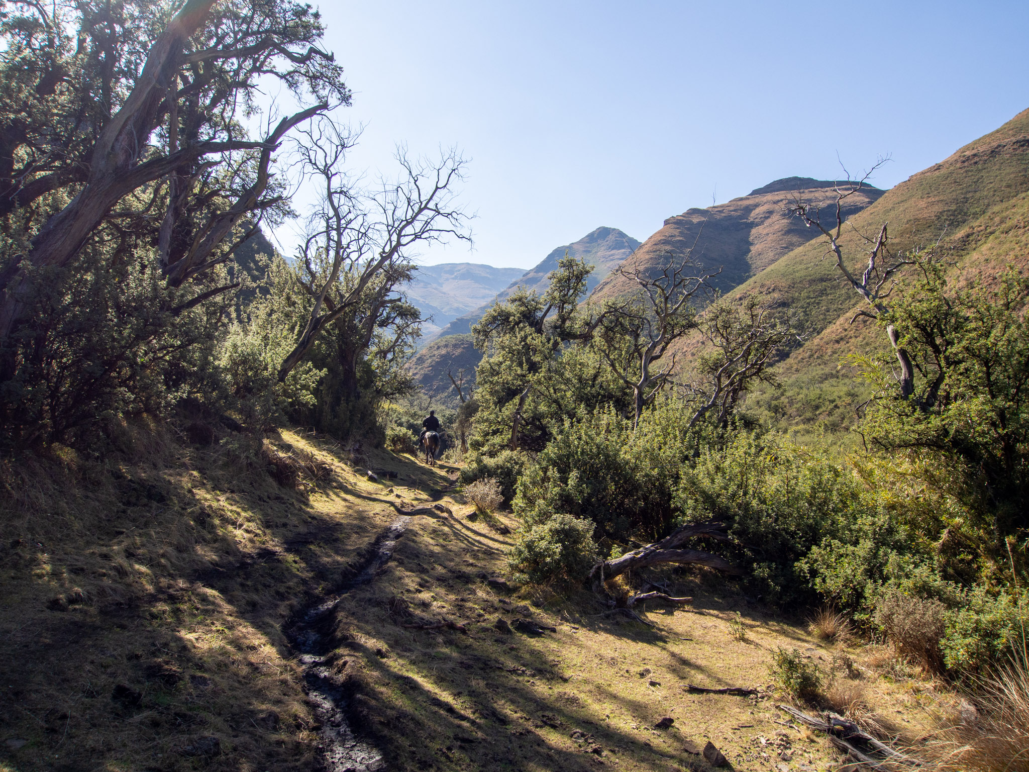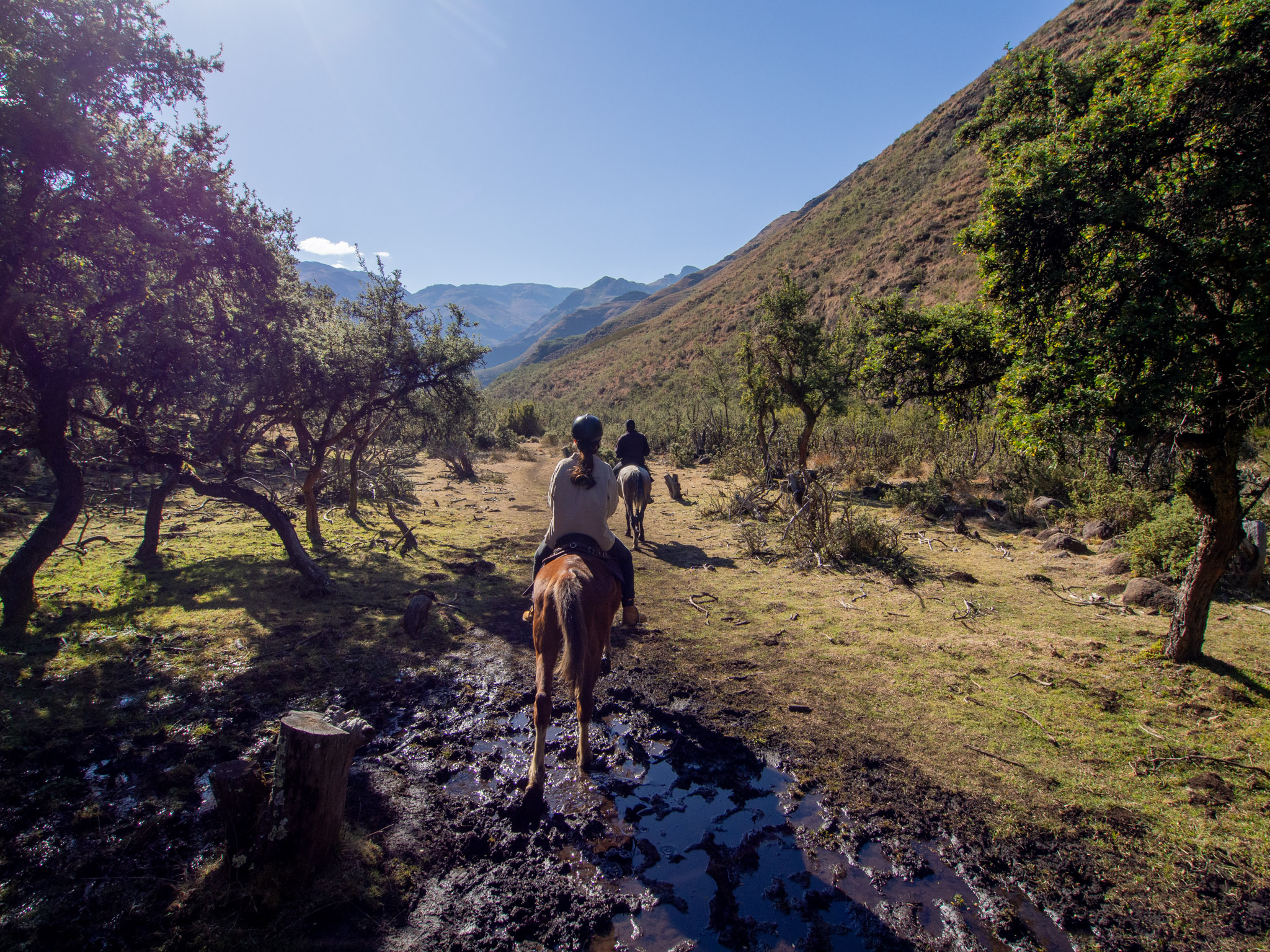 Après le petit déjeuner on part avec l’écurie du lodge pour une promenade à cheval dans les environs. Nous ne sommes pas très habiles à cheval, mais notre guide nous explique les fondamentaux. En fait, ces équidés ne sont pas techniquement des chevaux malgré leur taille, ce sont des poneys du Lesotho, une race particulière appelée Basuto. Nous montons ces poneys tranquilles mais costauds sur des chemins au milieu de la forêt.