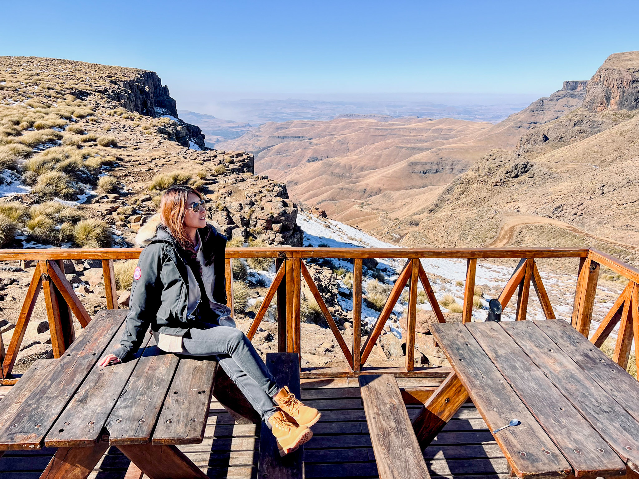Depuis la terrasse, on a une vue sur la route du Sani Pass et on peut voir les véhicules monter avec difficulté.