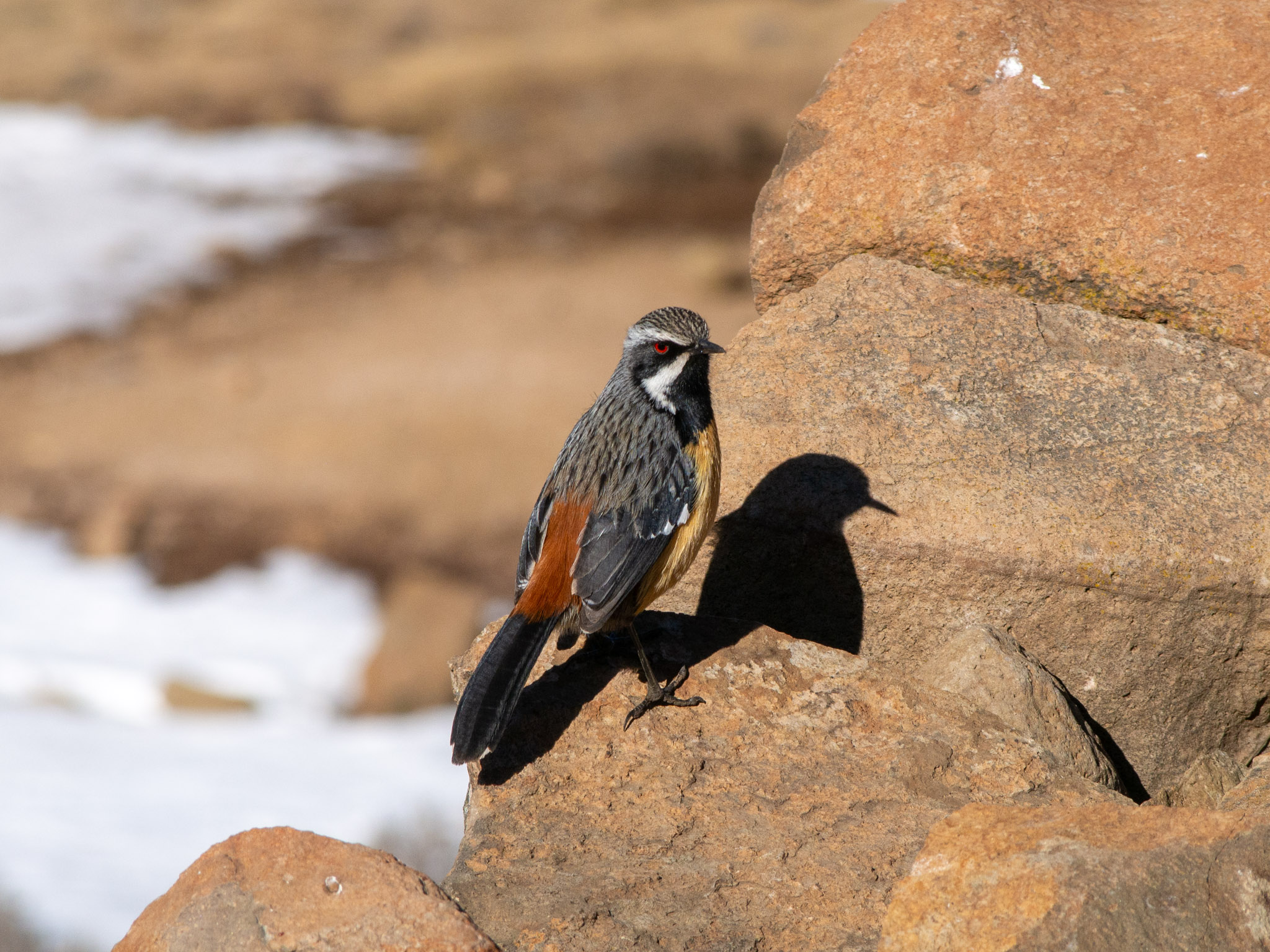 Il y a une faune intéressante au col, on voit un bel oiseau chantant sur les rochers. Un rat sauvage aussi cherche à manger dans la terre.