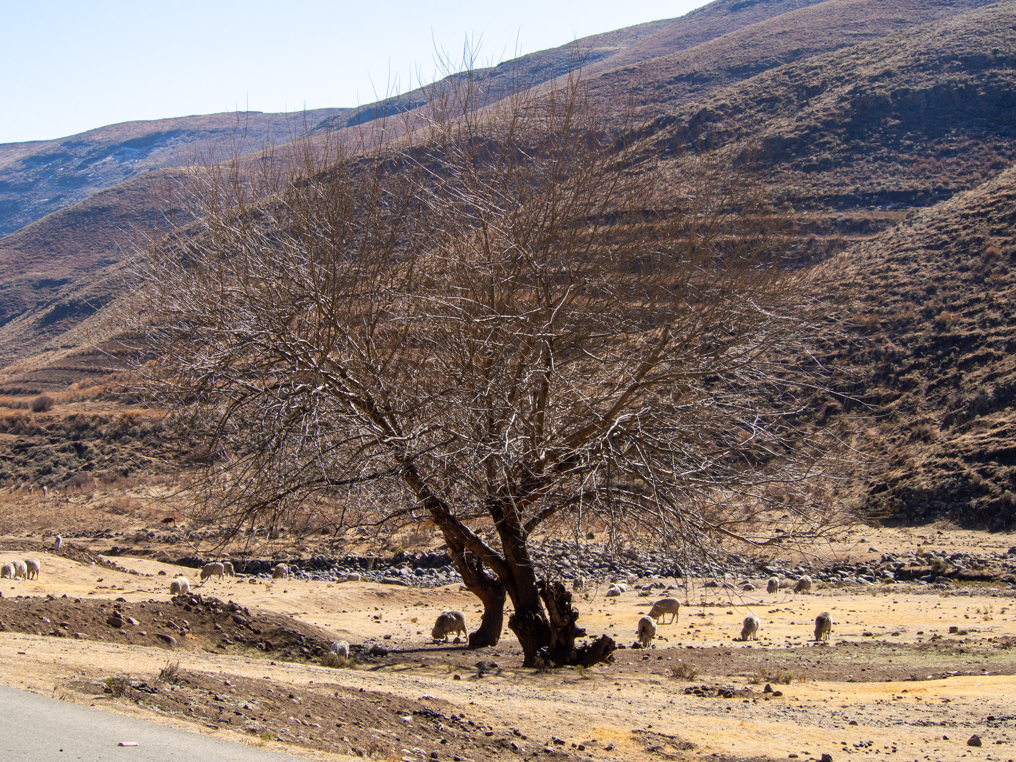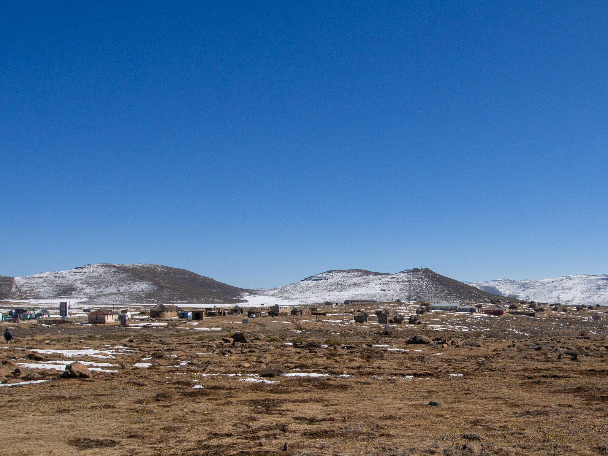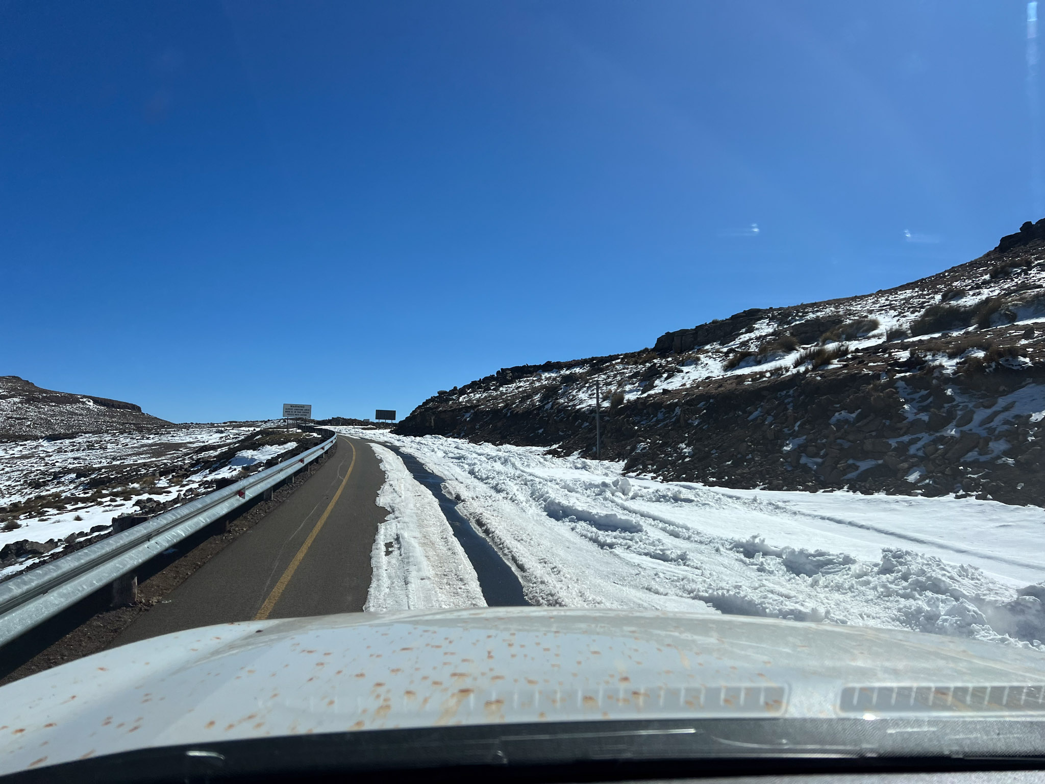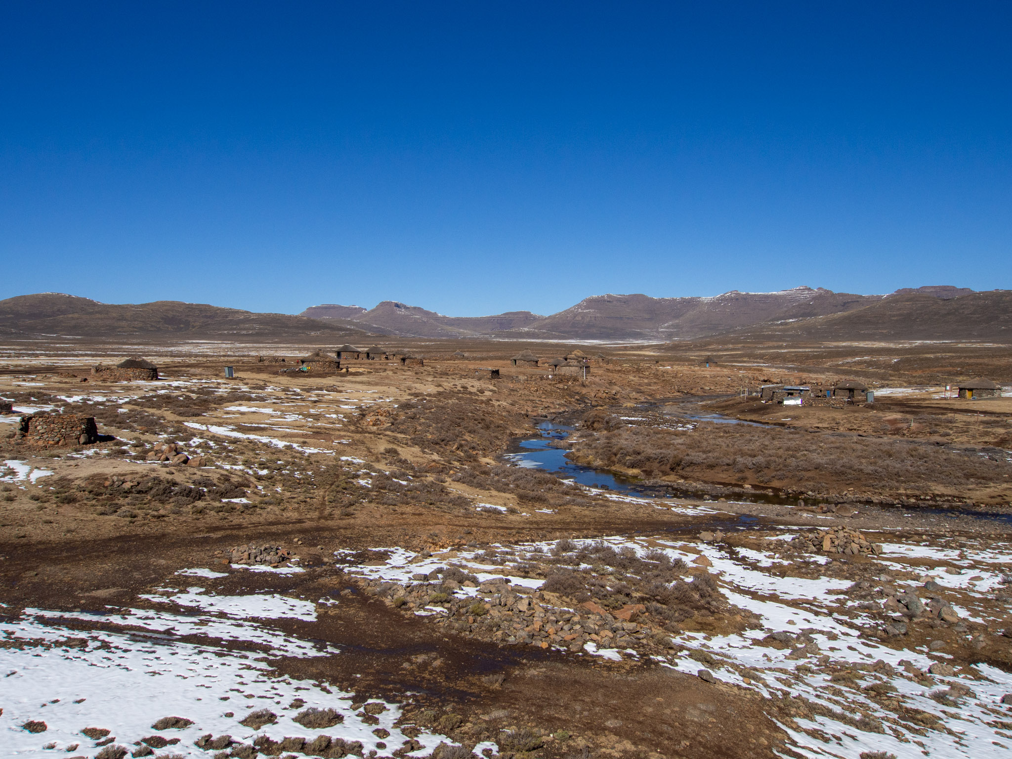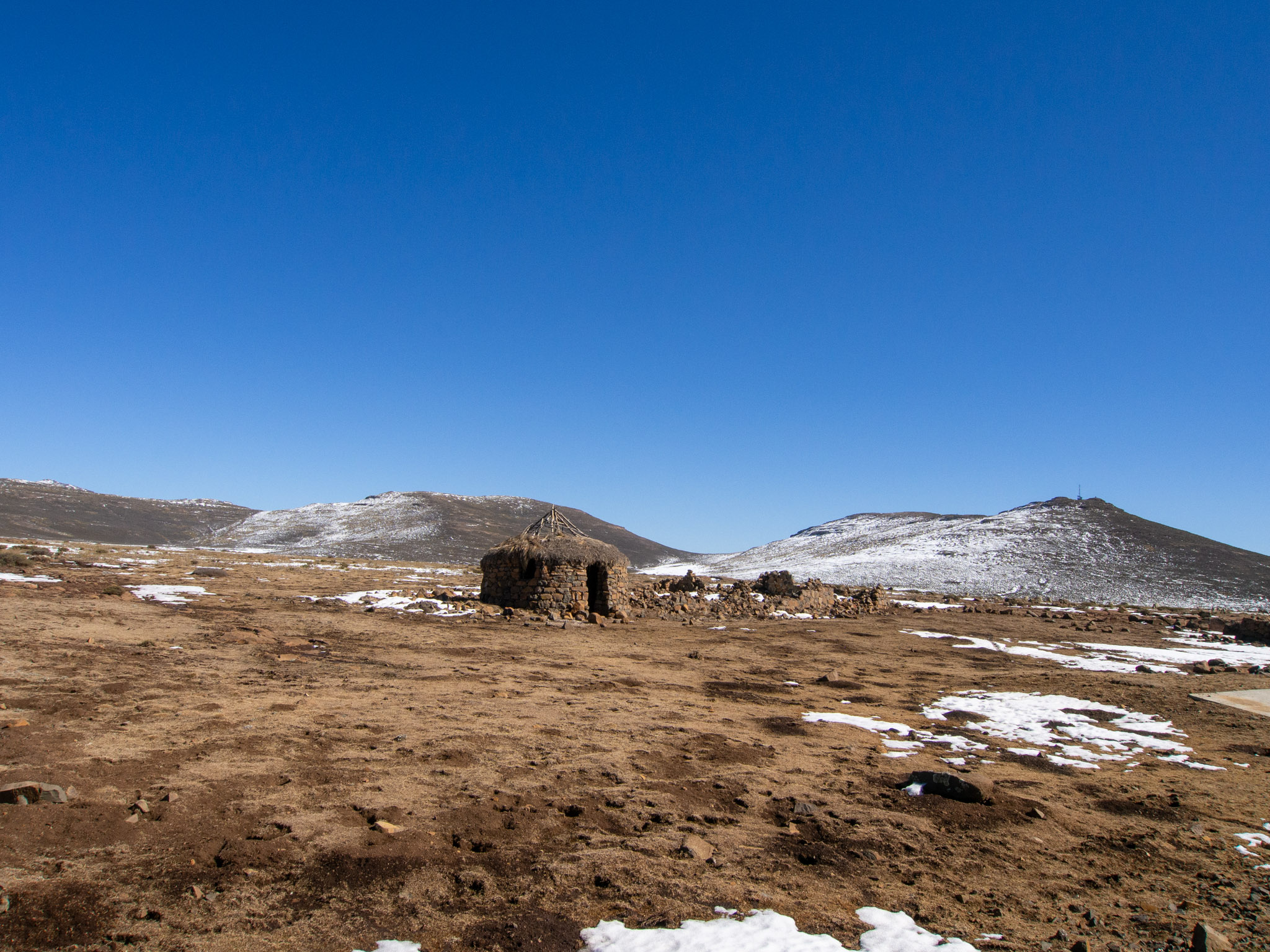 Il y a même un bonhomme de neige mais qui s'écroule malheureusement avec le soleil. On reprend la route qui est maintenant goudronnée. Mais cela ne veut pas dire que nos soucis sont réglés. En arrivant au Lesotho, on a vraiment l’impression d’être arrivé dans un autre monde. L’écart avec le Swaziland ou l’Afrique du Sud est immense. On passe des villages faits de pierres avec des toits de chaume, les gens semblent vivre du pâturage de leur bête et d’économie de subsistance. Il y a peu de voitures, parfois des animaux de trait, beaucoup de gens sont sur les bords des routes.