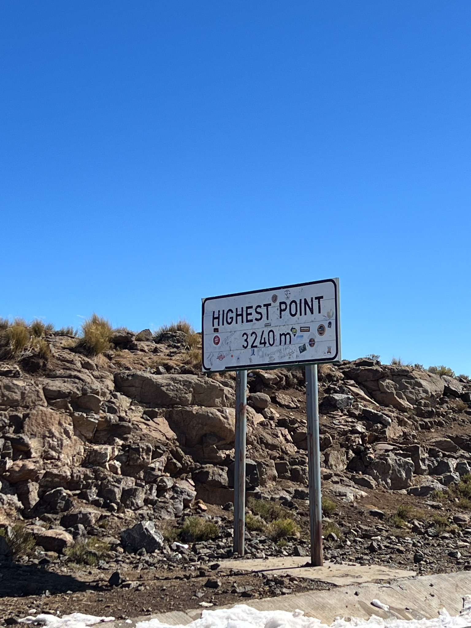 Le passage de la douane du Lesotho est vraiment tranquille. On laisse la voiture devant le portail puis on va au guichet pour donner son passeport. Il faut aussi s’acquitter d’une taxe routière, en liquide seulement mais ils acceptent les Rand sud-africains. Pour payer on entre dans leur petite cahute où un poêle est allumé et réchauffe la pièce. Les agents sont quand même emmitouflés dans de gros manteaux et portent une cagoule, ils nous disent que certains jours peuvent être très froid, on veut bien les croire, dehors dans les endroits à l’ombre la neige n’a pas fondu.
