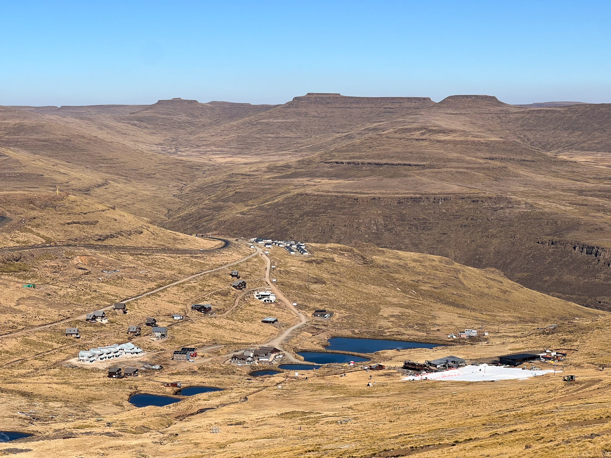 On arrive à la station de ski la plus connue du Sud du continent africain, nommée Afriski bien sûr. On s’attendait à un resort à l’américaine avec des chalets et des rues commerçantes mais rien de tout cela. L’endroit fait beaucoup de peine. Déjà, il faut payer 100 Rand pour entrer au sein du resort. Mais il n’y a pas de neige, ou si peu au pied de l’unique piste et surtout il n’y a personne. La neige a laissé la place à l’herbe jaunie et la pauvre remontée mécanique semble perdue dans ce décor désertique. On a du mal à croire qu’une station de ski puisse exister ici ! La raison de l’absence de neige semble quand même logique, notre hébergeur de Ste Lucia nous avait dit qu’il avait entendu dire qu’à cause des difficultés pour fournir de l’électricité, la station ne pouvait pas produire de neige artificielle et ils avaient préféré annuler la saison. Ceci pourrait donc être une explication plausible au manque de vie dans le coin.