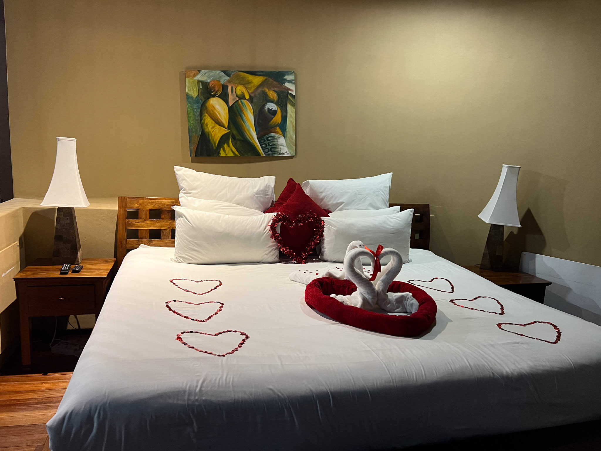 C’est un vrai cocon romantique, et ils sont vraiment très forts. Je ne sais pas si c’est en rapport avec le fait que j’avais précisé dans la réservation que je venais avec ma copine pour un voyage en amoureux mais ils m’ont vraiment pris au mot. Après le dîner pris au restaurant du lodge, on rentre à la case et quelle surprise, le feu a été allumé dans la cheminée, et la chambre est aménagée parfaitement pour une soirée en amoureux. Il y a des cœurs dessinés sur le lit, les serviettes ont été pliées pour faire deux cygnes qui se font un bisou.