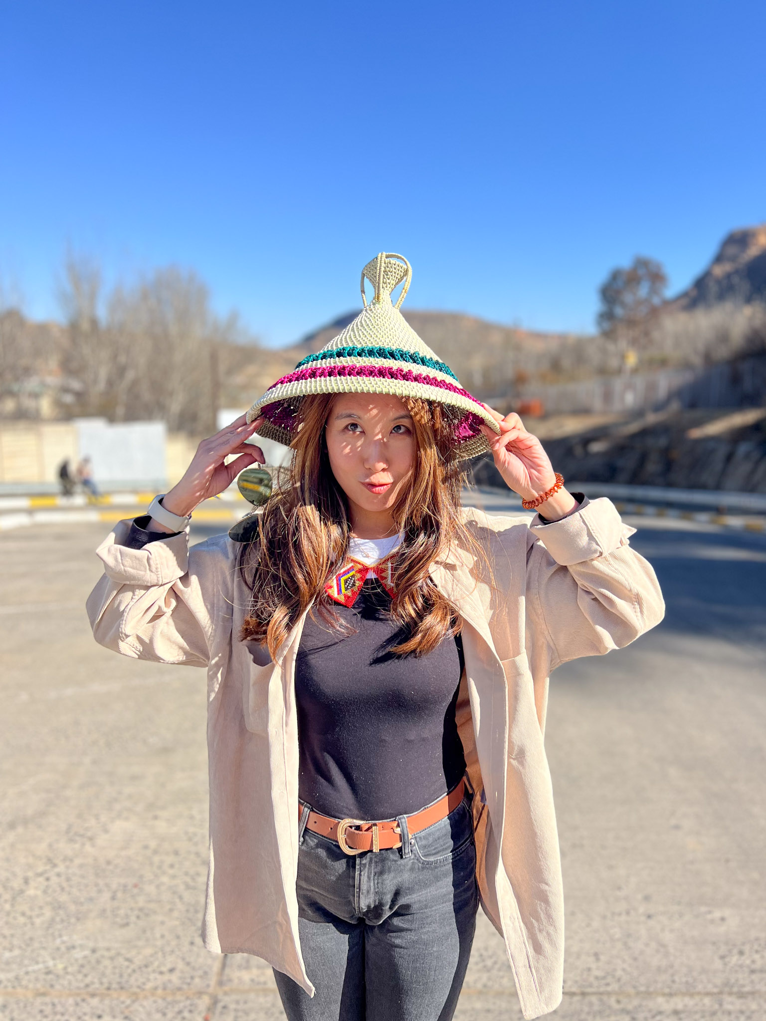 On veut acheter un chapeau du Lesotho mais il n’y a pas de magasin de souvenirs dans ce coin. Elle ne veut pas repartir sans ce symbole du pays. On inspecte toutes les petites échoppes sur le bord de la route dans la petite ville frontalière avant le poste de douane. On est presque décidé à abandonner mais finalement lorsqu’on se gare sur le parking devant la frontière, on voit une vieille dame qui vend des chapeaux aux touristes. On lui achète un exemplaire, ma copine est toute content et le porte immédiatement, puis la vieille dame nous dit que ce poste frontière est drive through il n’y a pas besoin de marcher dans le bâtiment.