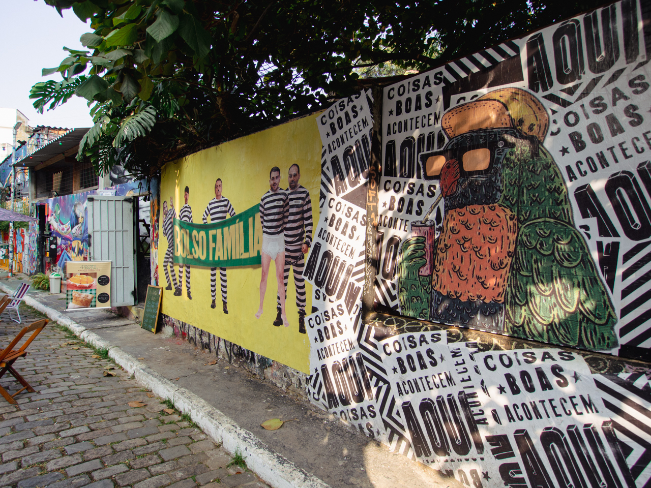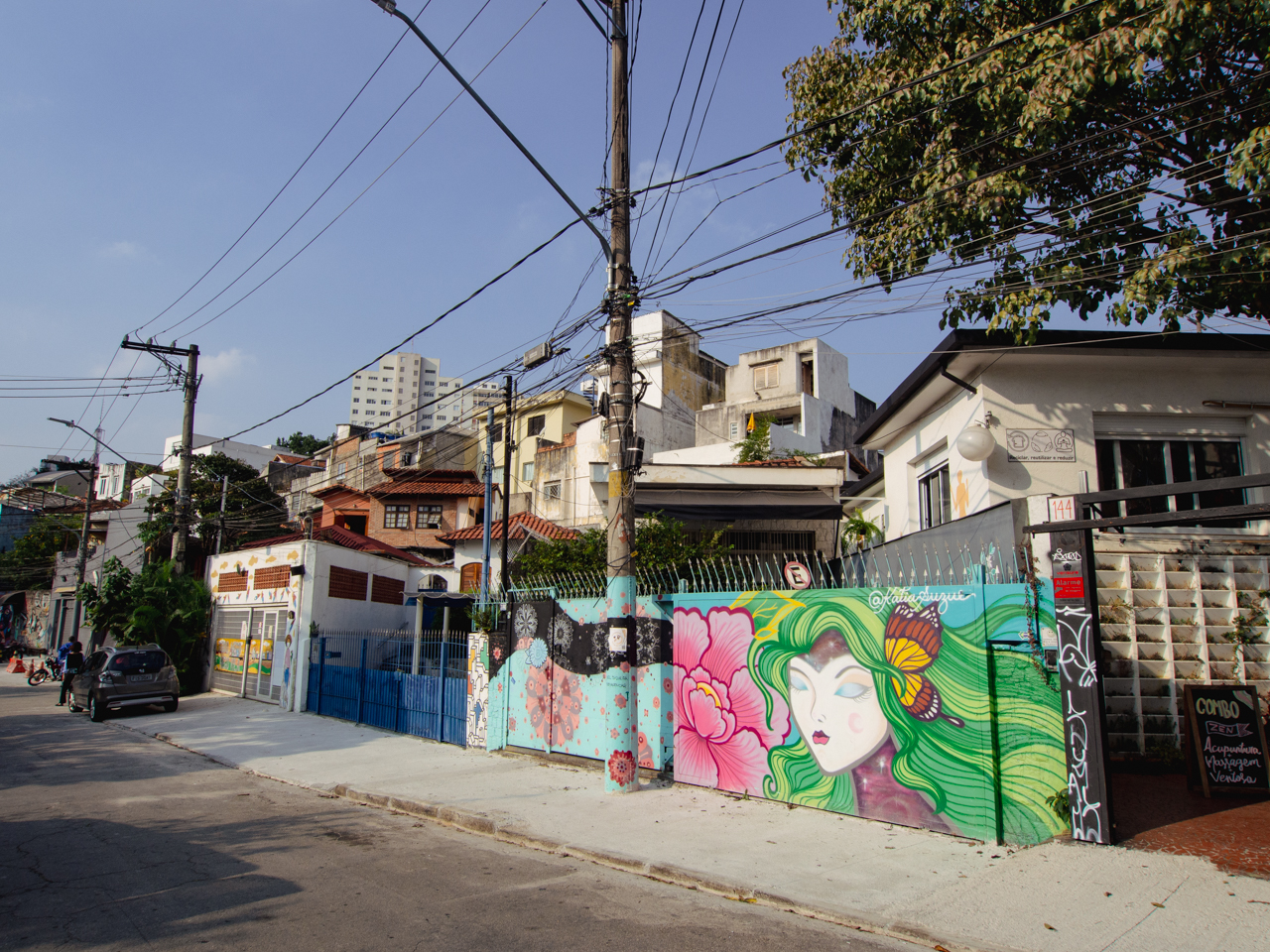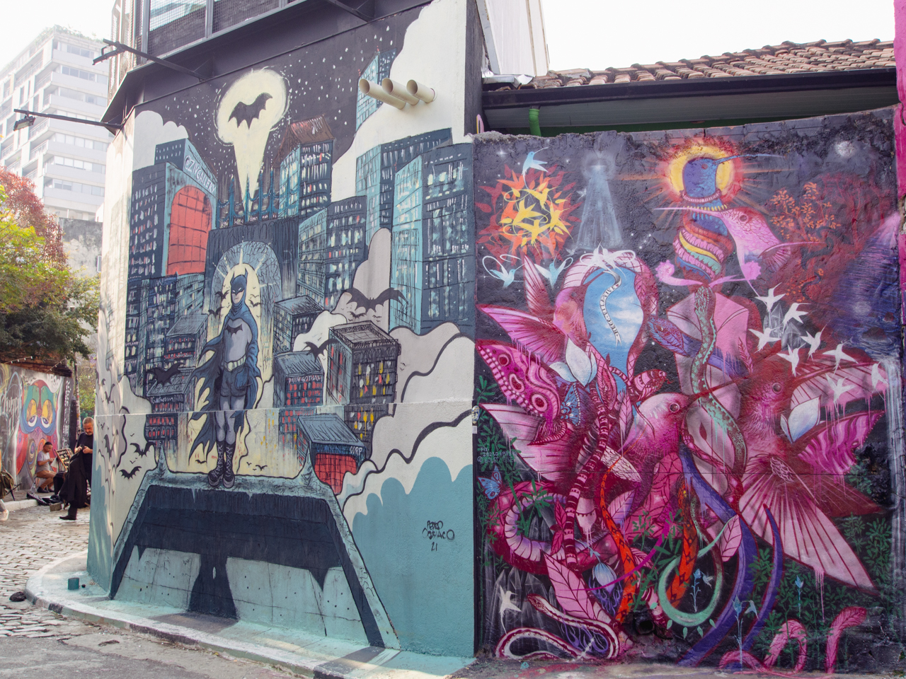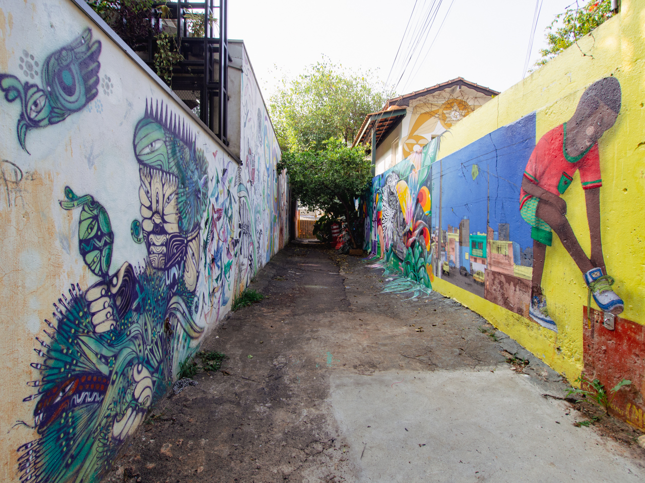 Je rejoins le quartier de Beco de Batman. Le baiser de Batman en français. Ce quartier a été investi par les street artists qui ont peint les murs avec de nombreuses fresques, notamment la fresque la plus connue de Batman qui embrasse à la russe. Cette fresque a aujourd’hui été recouverte par d’autres et le quartier est très agréable, avec une superbe ambiance, entouré de petites maisons sur une colline. C’est un endroit de Sao Paulo avec beaucoup de café et où l’on ne ressent pas cette insécurité comme dans le centre ville. En se promenant au hasard dans le quartier on découvre de nombreuses fresques différentes. Je vous mets ici des photos du quartier: