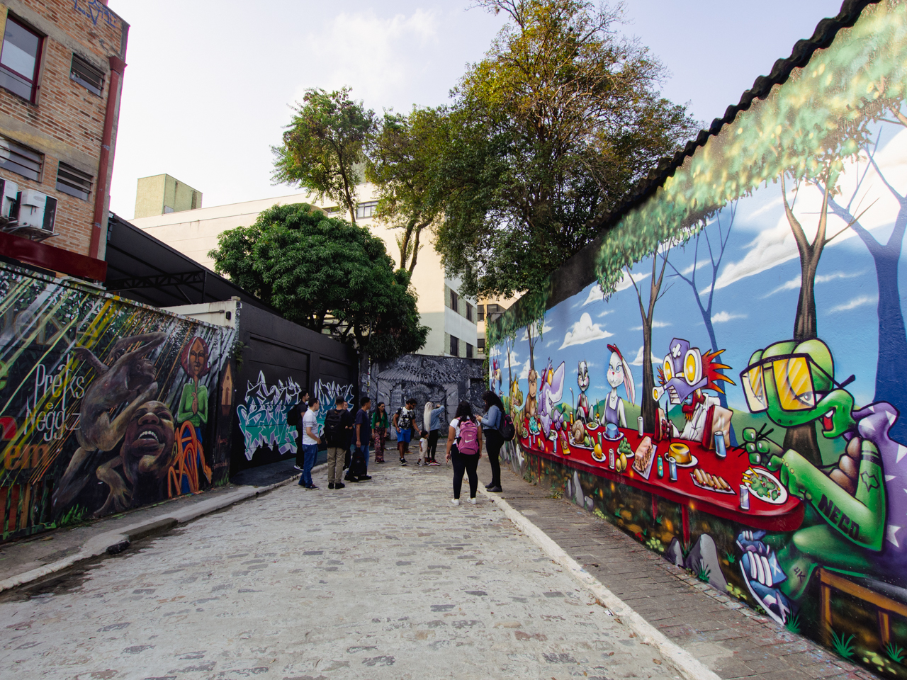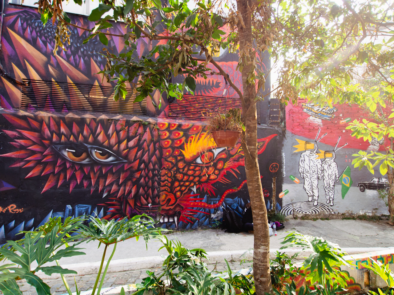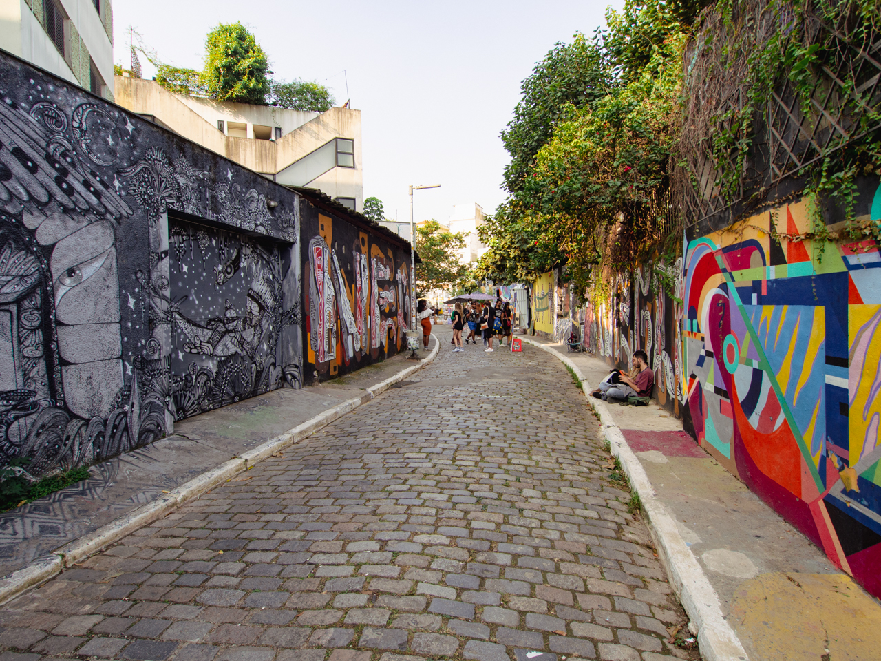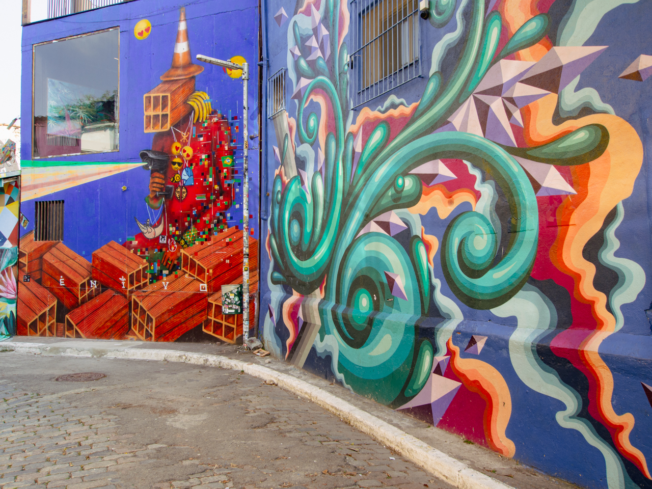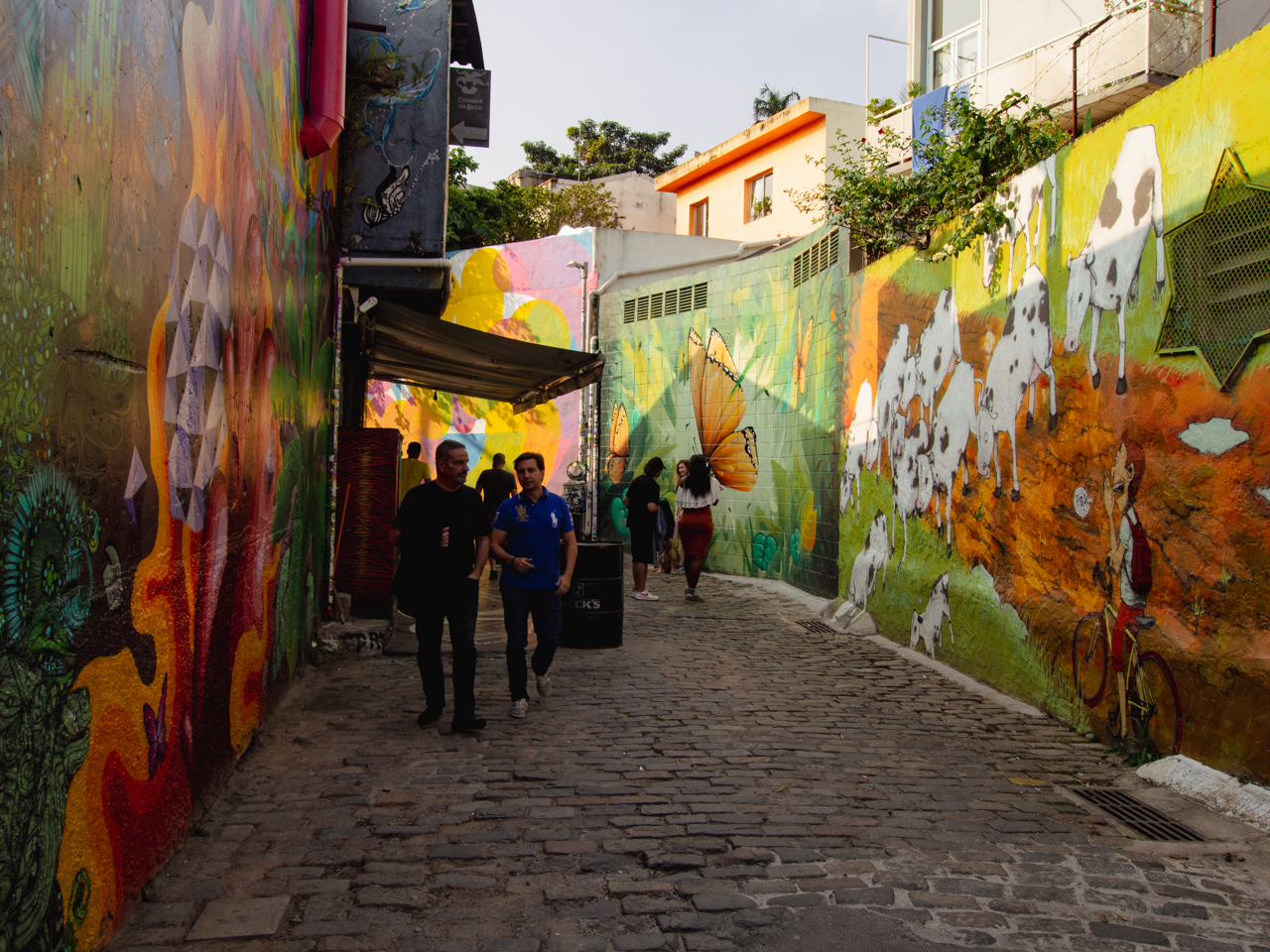 Je rejoins le quartier de Beco de Batman. Le baiser de Batman en français. Ce quartier a été investi par les street artists qui ont peint les murs avec de nombreuses fresques, notamment la fresque la plus connue de Batman qui embrasse à la russe. Cette fresque a aujourd’hui été recouverte par d’autres et le quartier est très agréable, avec une superbe ambiance, entouré de petites maisons sur une colline. C’est un endroit de Sao Paulo avec beaucoup de café et où l’on ne ressent pas cette insécurité comme dans le centre ville. En se promenant au hasard dans le quartier on découvre de nombreuses fresques différentes. Je vous mets ici des photos du quartier: