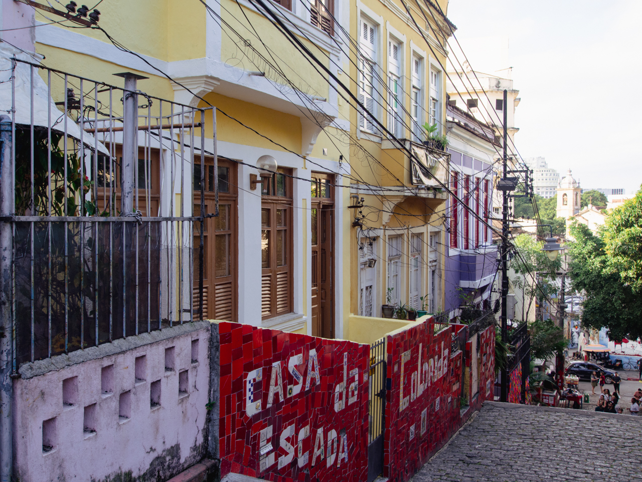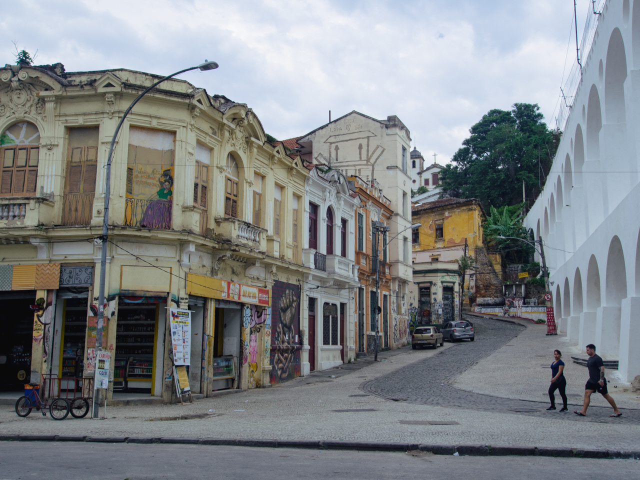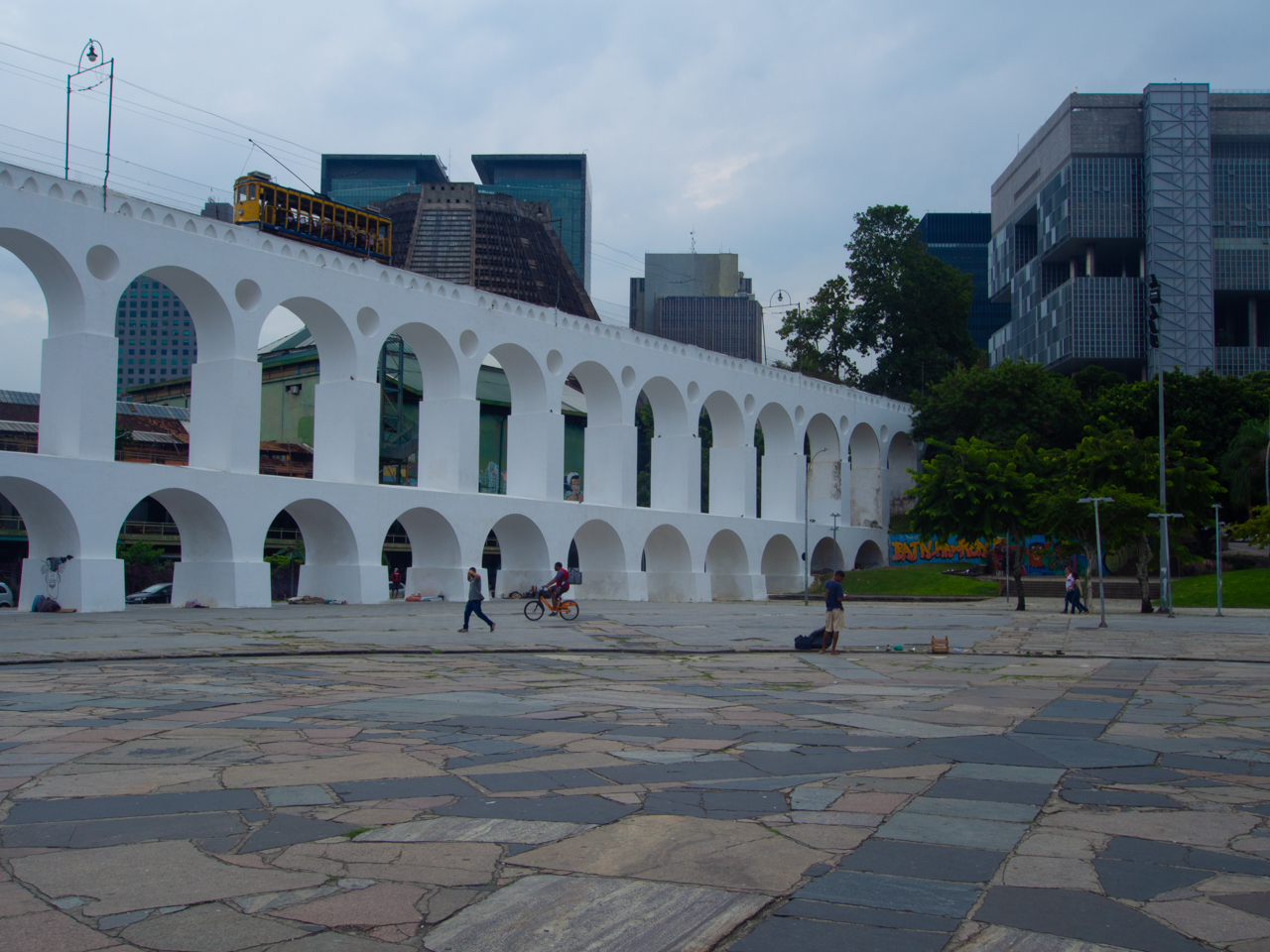 Dans le quartier du Downtown, pas très loin de la cathédrale, on arrive sur une place aérée, d’un côté des immeubles de bureaux en verre, de l’autre des petits bâtiments délabrés. Des hommes pauvres qui semblent avoir dormi sur cette place sont assis l’air hagard. Le tramway passe sur ce pont en forme d’aqueduc et relie le centre ville avec le quartier sur la colline de Santa Teresa.