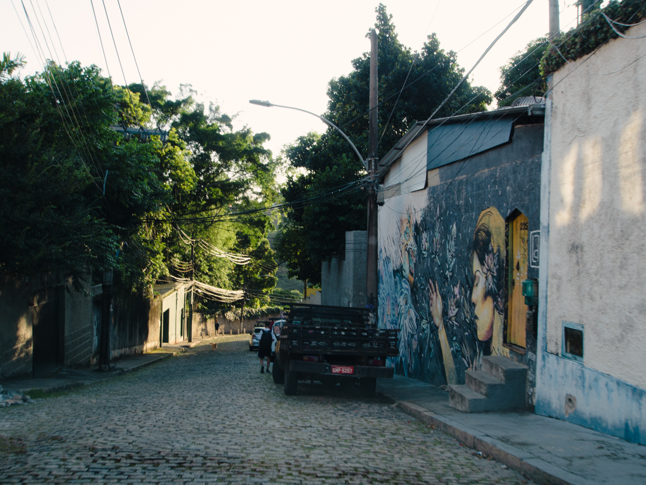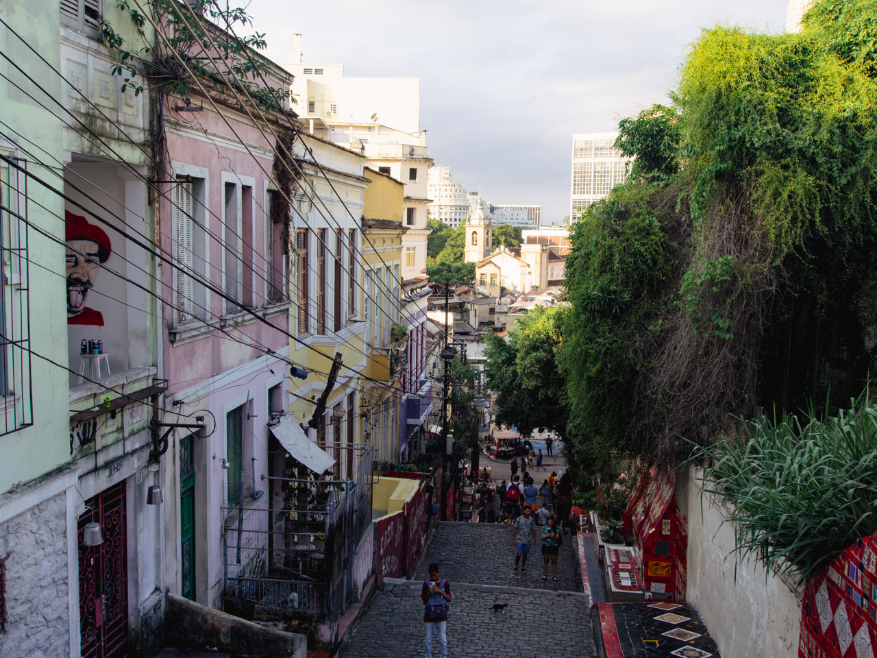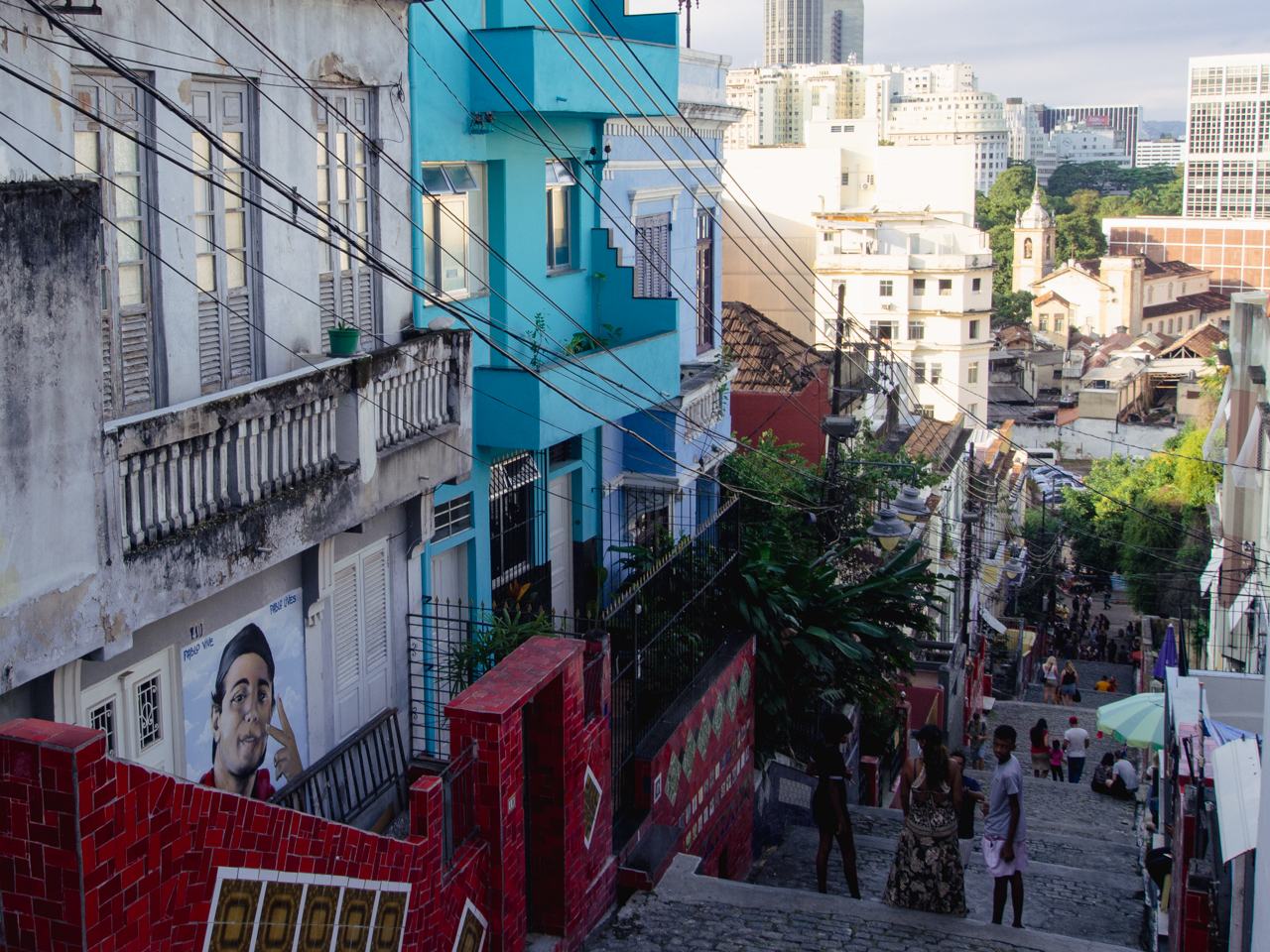 Dans le quartier du Downtown, pas très loin de la cathédrale, on arrive sur une place aérée, d’un côté des immeubles de bureaux en verre, de l’autre des petits bâtiments délabrés. Des hommes pauvres qui semblent avoir dormi sur cette place sont assis l’air hagard. Le tramway passe sur ce pont en forme d’aqueduc et relie le centre ville avec le quartier sur la colline de Santa Teresa.