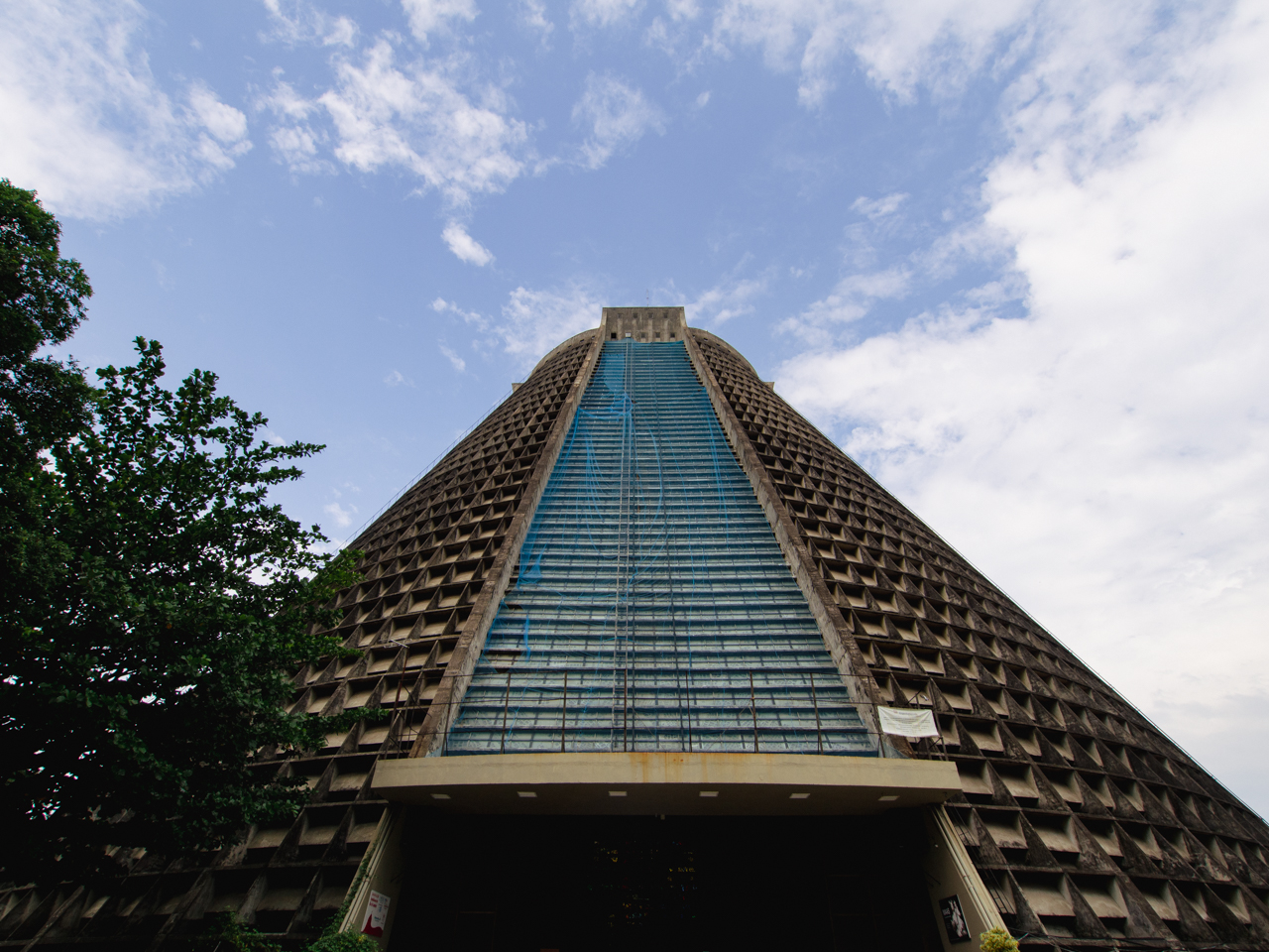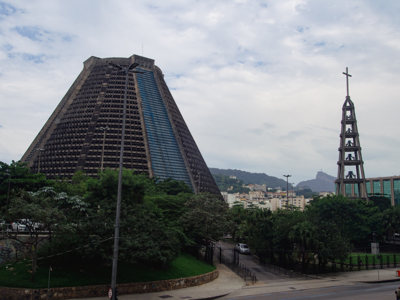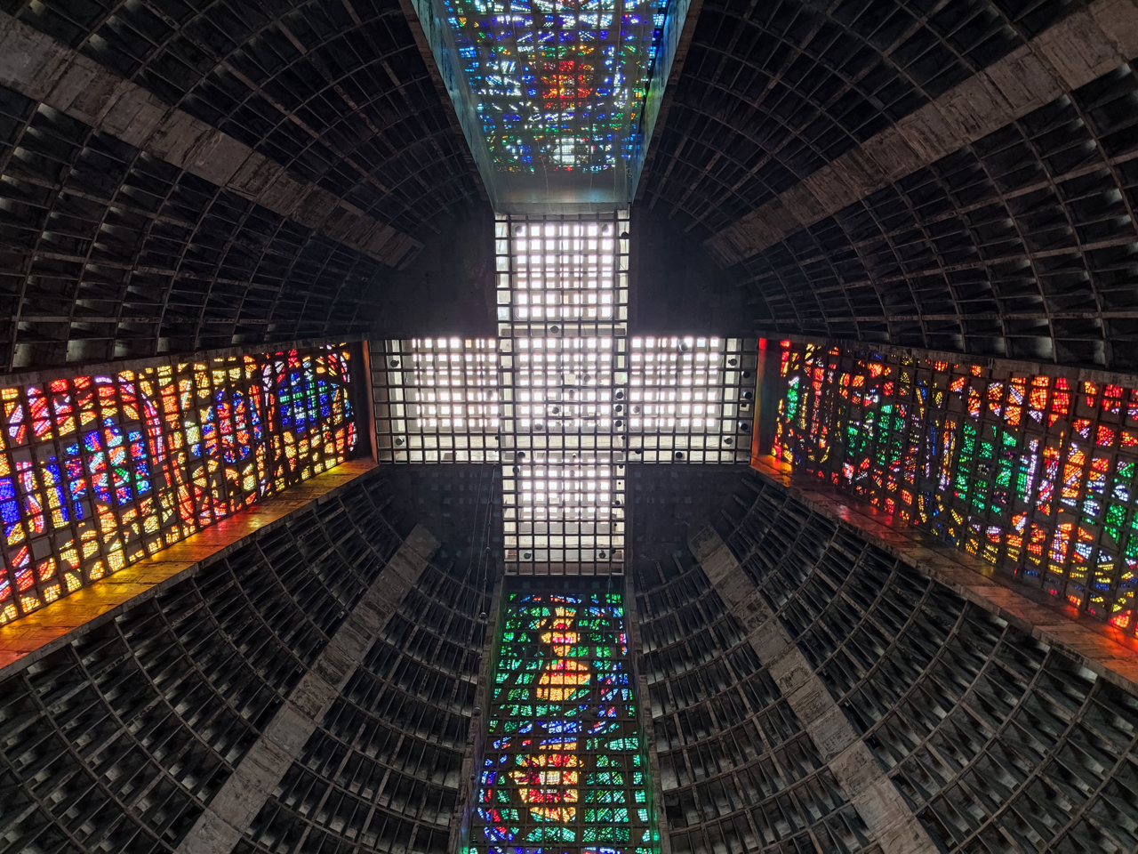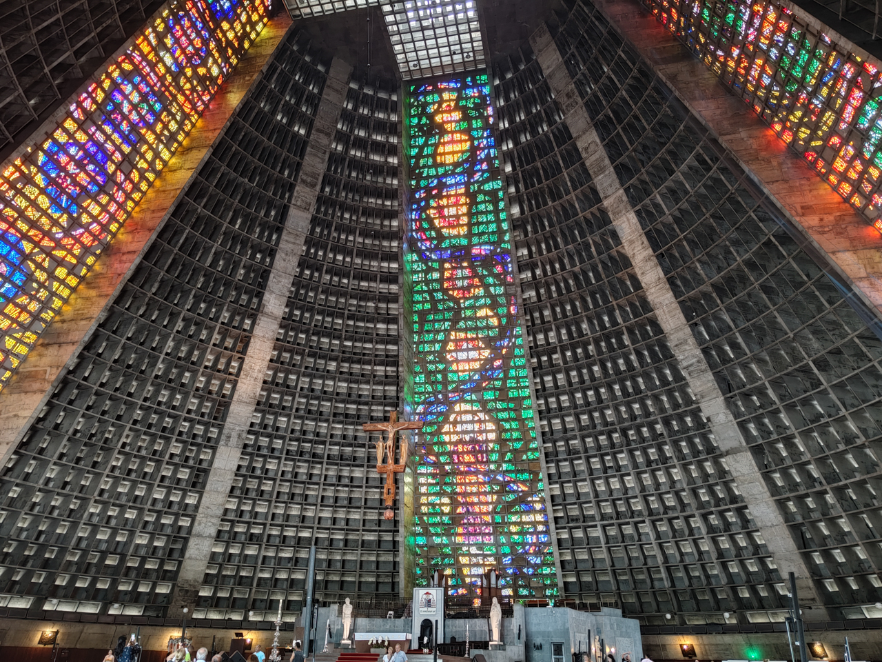 Planté au milieu du centre ville pas très bien réputé de Rio de Janeiro, la cathédrale a une forme vraiment originale qui laisse perplexe. Son architecture est clairement ambitieuse, de l’extérieur son aspect ressemble à une pyramide circulaire en béton noirci par la pollution de la ville. Les alentours font vraiment cour des miracles, étonnamment juste en face de tours de bureaux modernes, une passerelle qui enjambe la route à passer et l’on passe d’un monde à l’autre, de l’extrême pauvreté aux hommes en costume. Surprenant. Cette cathédrale a ses amateurs et ses détracteurs, j’apprécie particulièrement l’audace en tout cas.