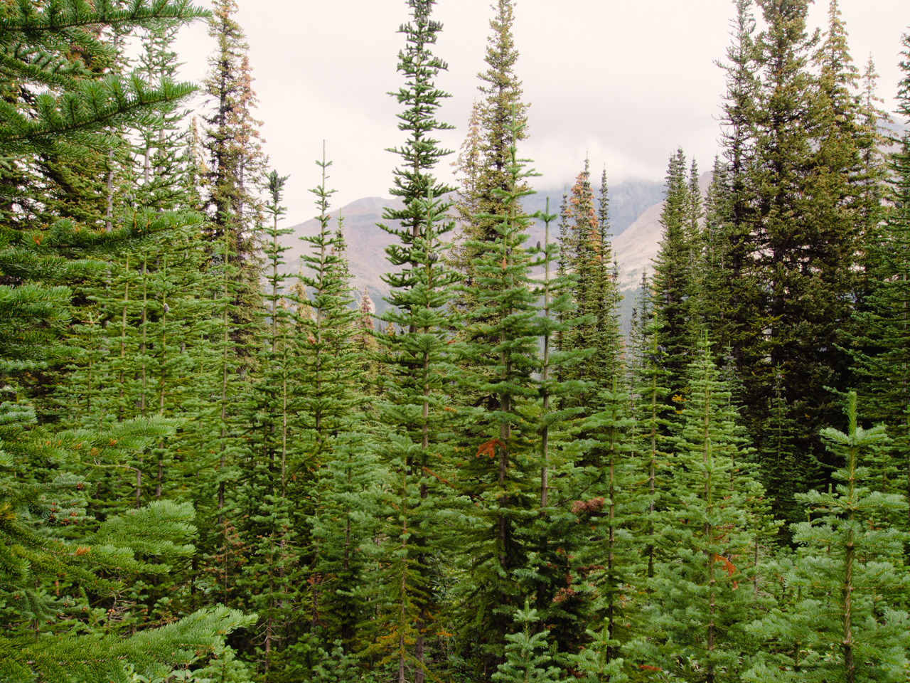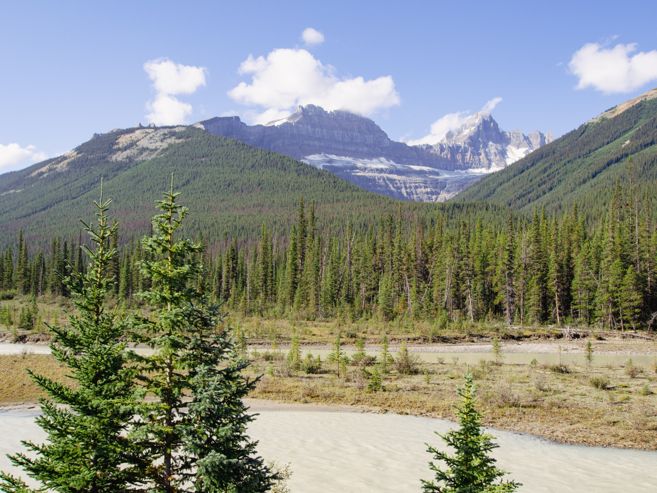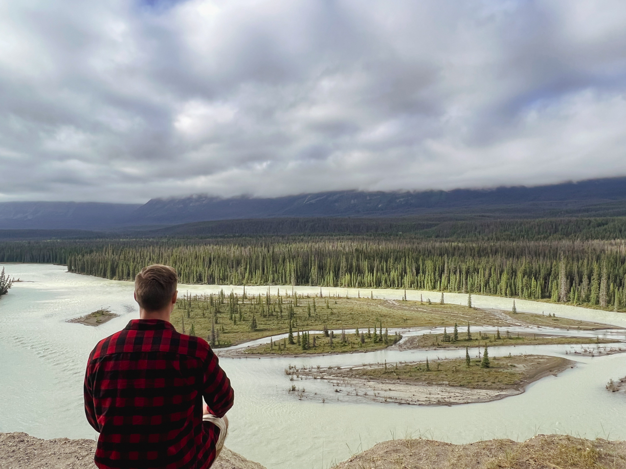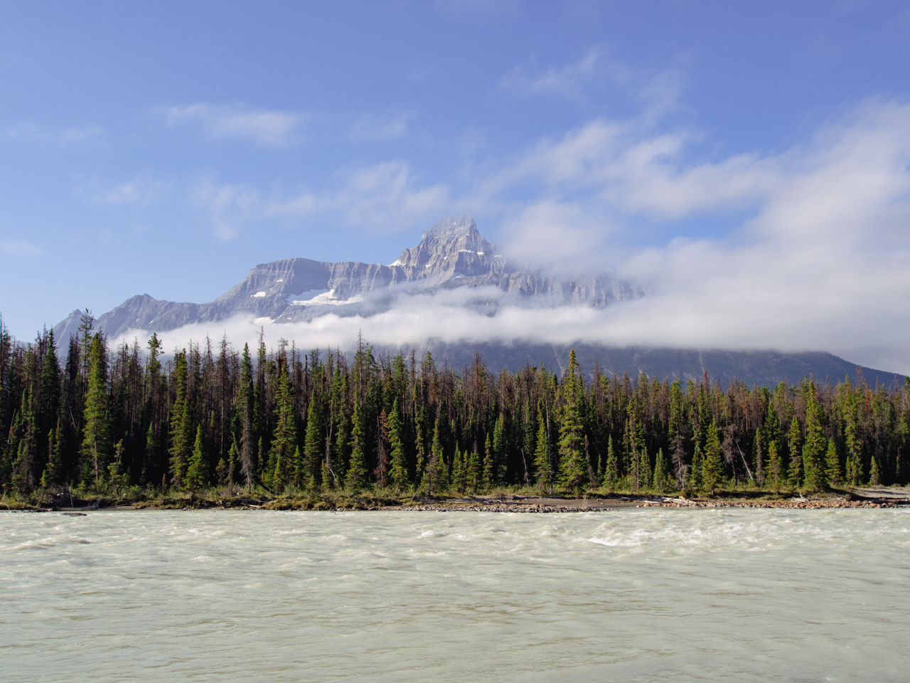 Depuis Jasper, nous partons pour une longue route jusqu’à Banff. Nous partons assez tôt pour profiter pour s’arrêter à tous les points de vue tout au long de la journée. Avec le recul, je pense qu’une journée n’était déjà pas suffisante pour prendre le temps de visiter tous les sites de l’Icefield Parkway, il faudrait pouvoir dormir quelque part mais nous ne voulions pas faire de camping et la seule option était donc d’aller jusqu’à Lake Louise. Le temps est brumeux lorsque l’on quitte la ville dans laquelle nous avons passé plusieurs jours, et nous avions déjà visité les deux plus belles cascades de la région, nous passerons donc ces étapes. Notre premier arrêt sera le Goats & Glacier Lookout, sur le bord de la route, d’ici on domine la rivière et l’immense forêt de sapins.