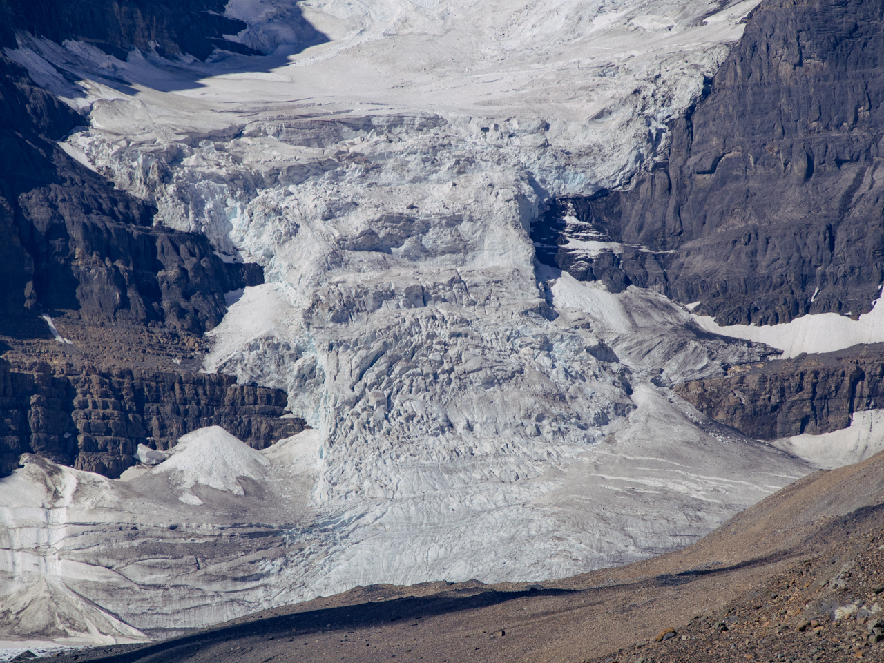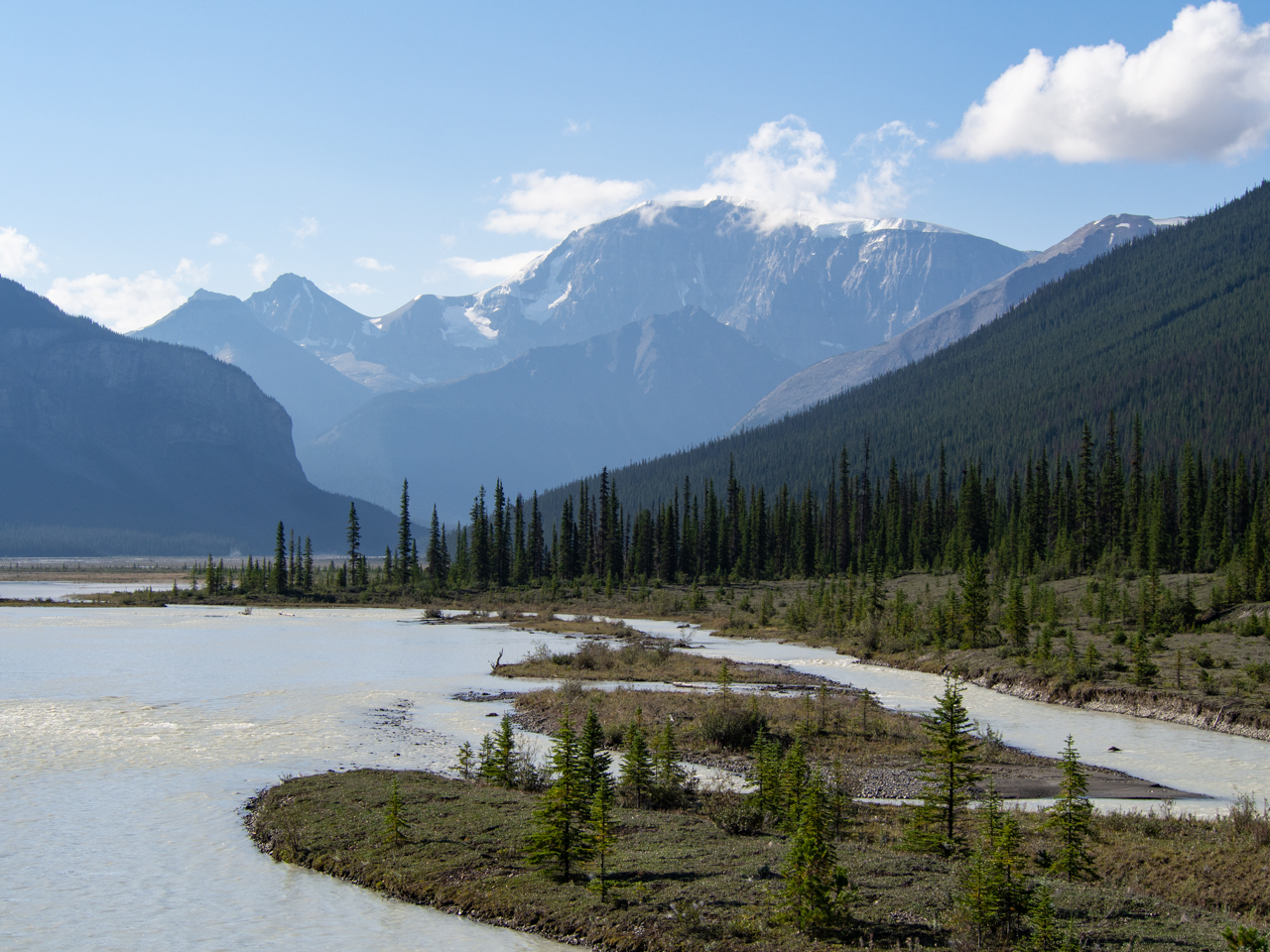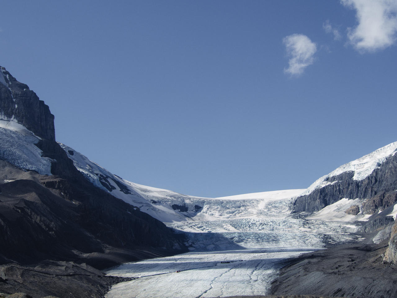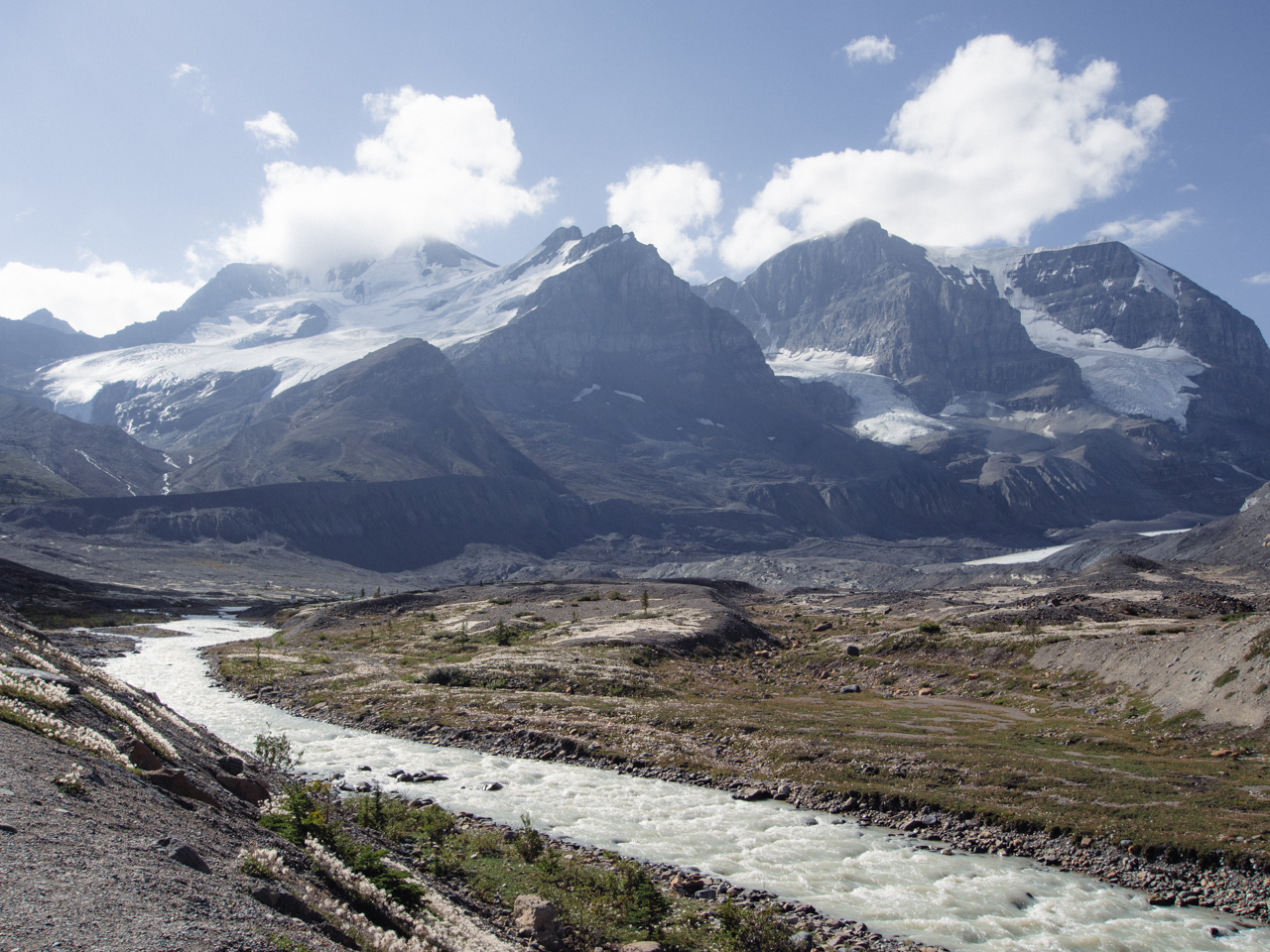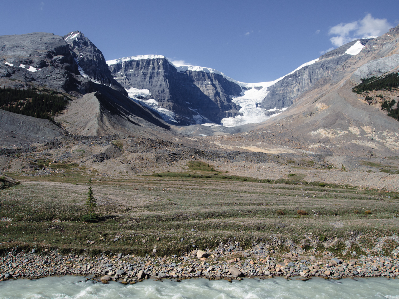 On suit la rivière Athabasca jusqu’à sa source, le glacier éponyme. On remonte la vallée et la route longe le lit de la rivière entourée de glaciers imposants.