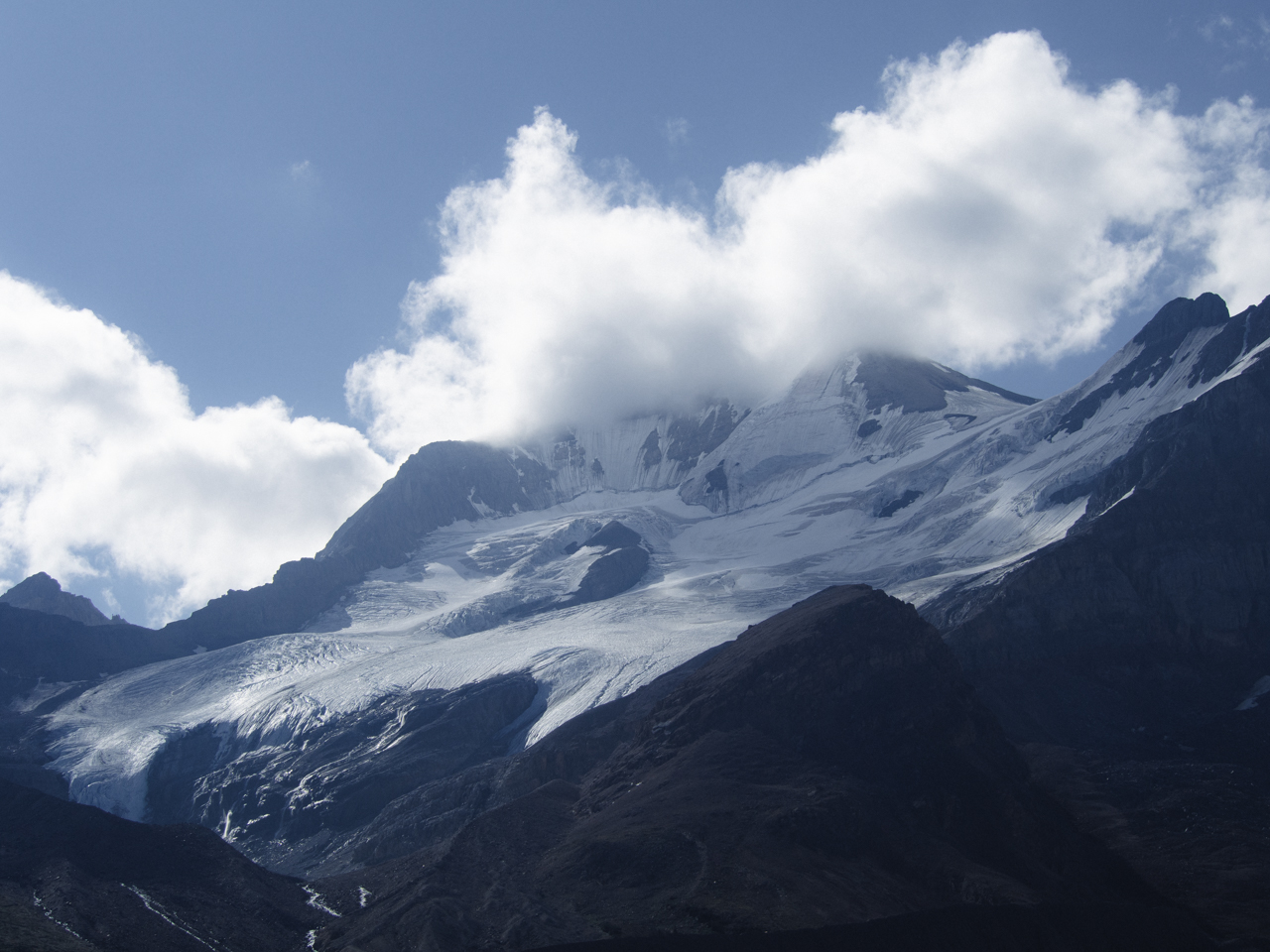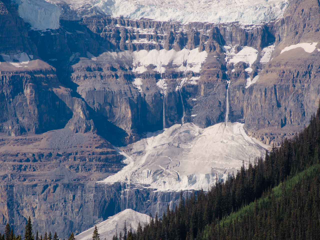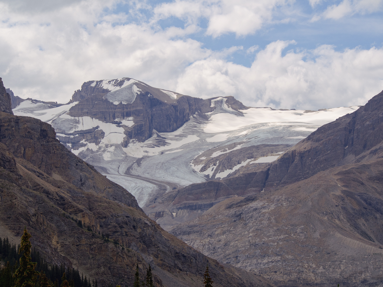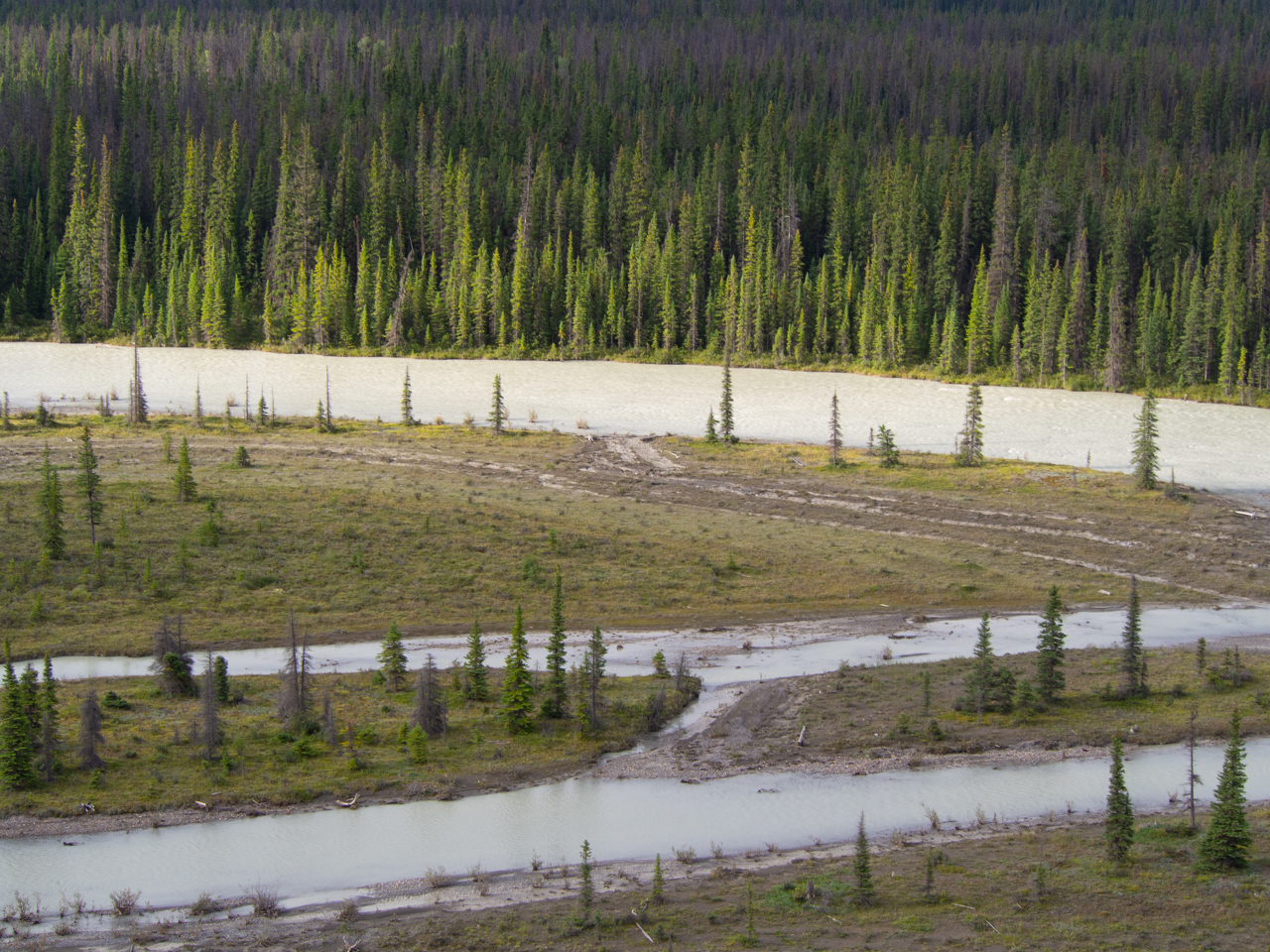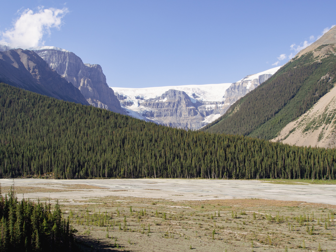 On suit la rivière Athabasca jusqu’à sa source, le glacier éponyme. On remonte la vallée et la route longe le lit de la rivière entourée de glaciers imposants.