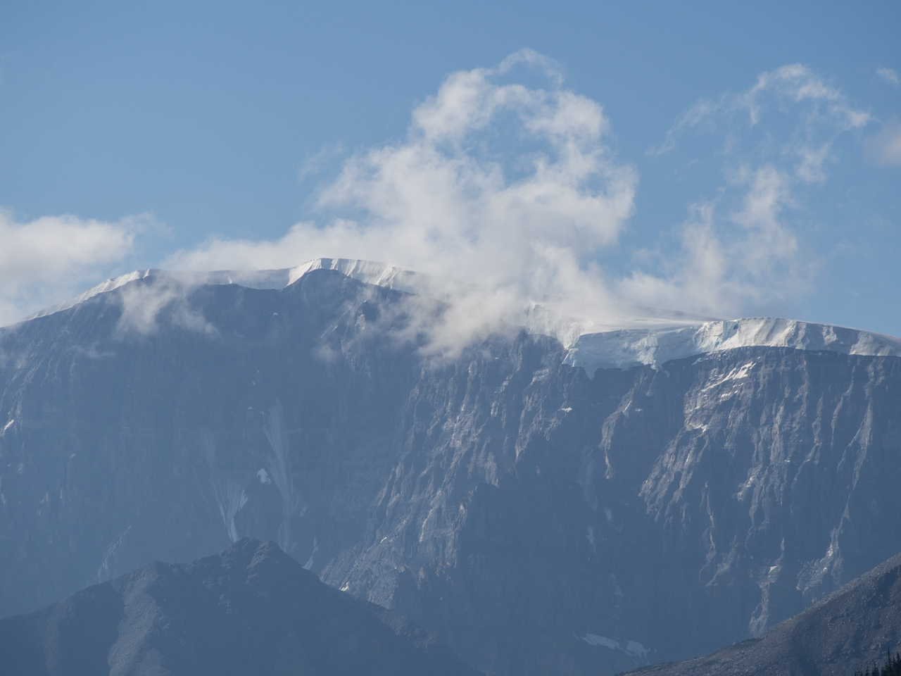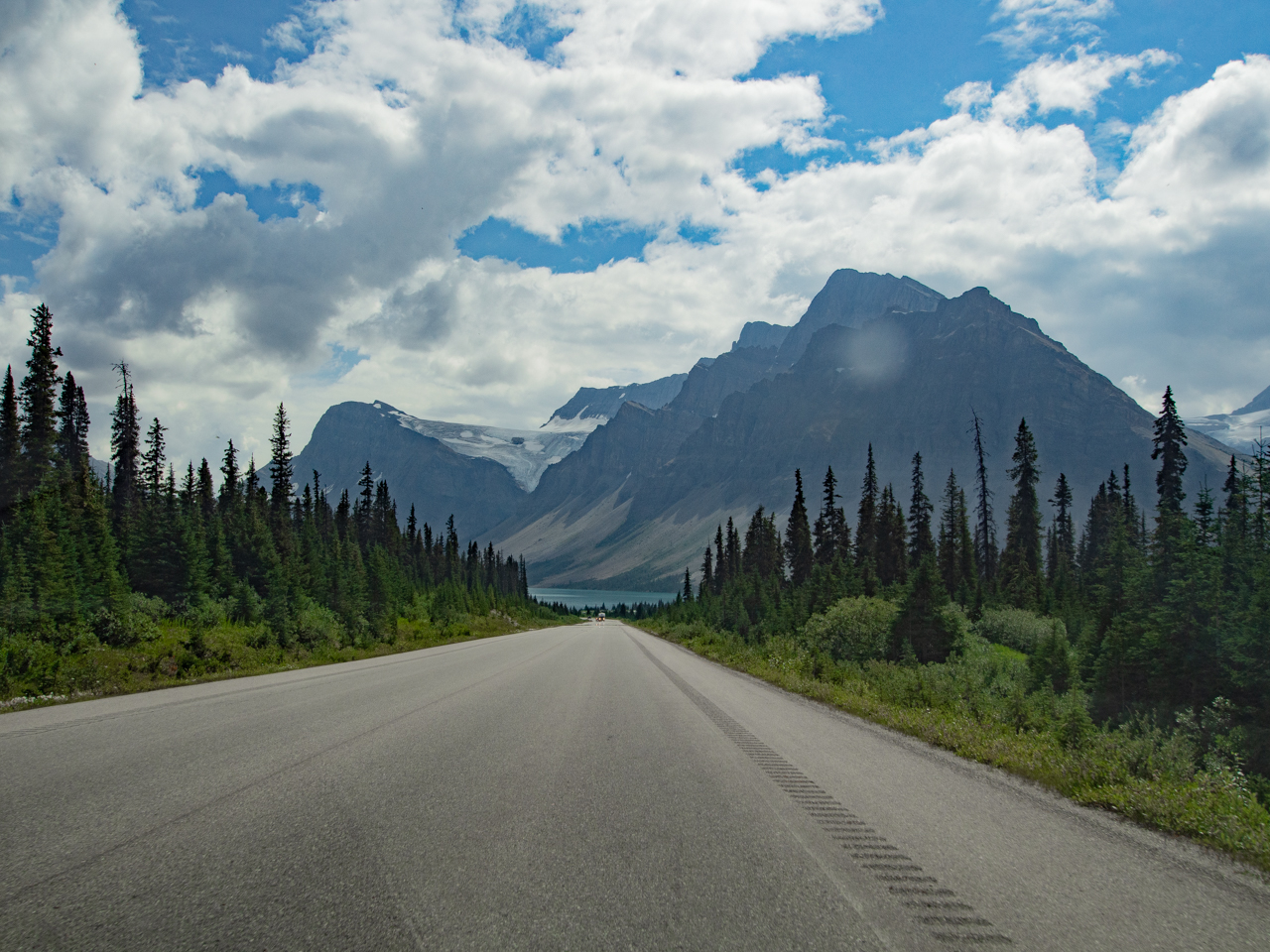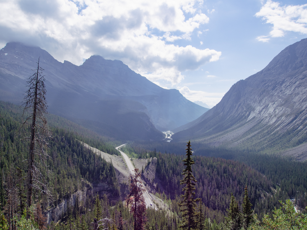 La route redescend maintenant vers Banff. On a culminé à presque 2100m d’altitude selon le GPS de la voiture. On a un peu ressenti le manque d’air alors que l’on marche autour des points de vue. Il y a dans le coin de superbes attractions que l’on a décidé de ne pas profiter par manque de temps mais qui aurait mérité un jour de plus (faisable depuis Jasper) comme le chemin du Parker Ridge Trail qui amène à un point de vue incroyable sur un glacier, ou alors plus facilement mais bien plus cher, une expédition en camion bus sur le glacier de Athabasca. Il faut dire, venant de Haute Savoie et voisins de Chamonix, on ressent moins le besoin de découvrir un glacier, nous en avons un très beau à une heure de chez nous. Néanmoins, le cadre est fantastique, et bien différent des Alpes françaises.