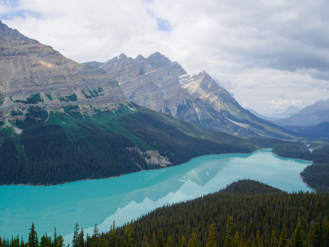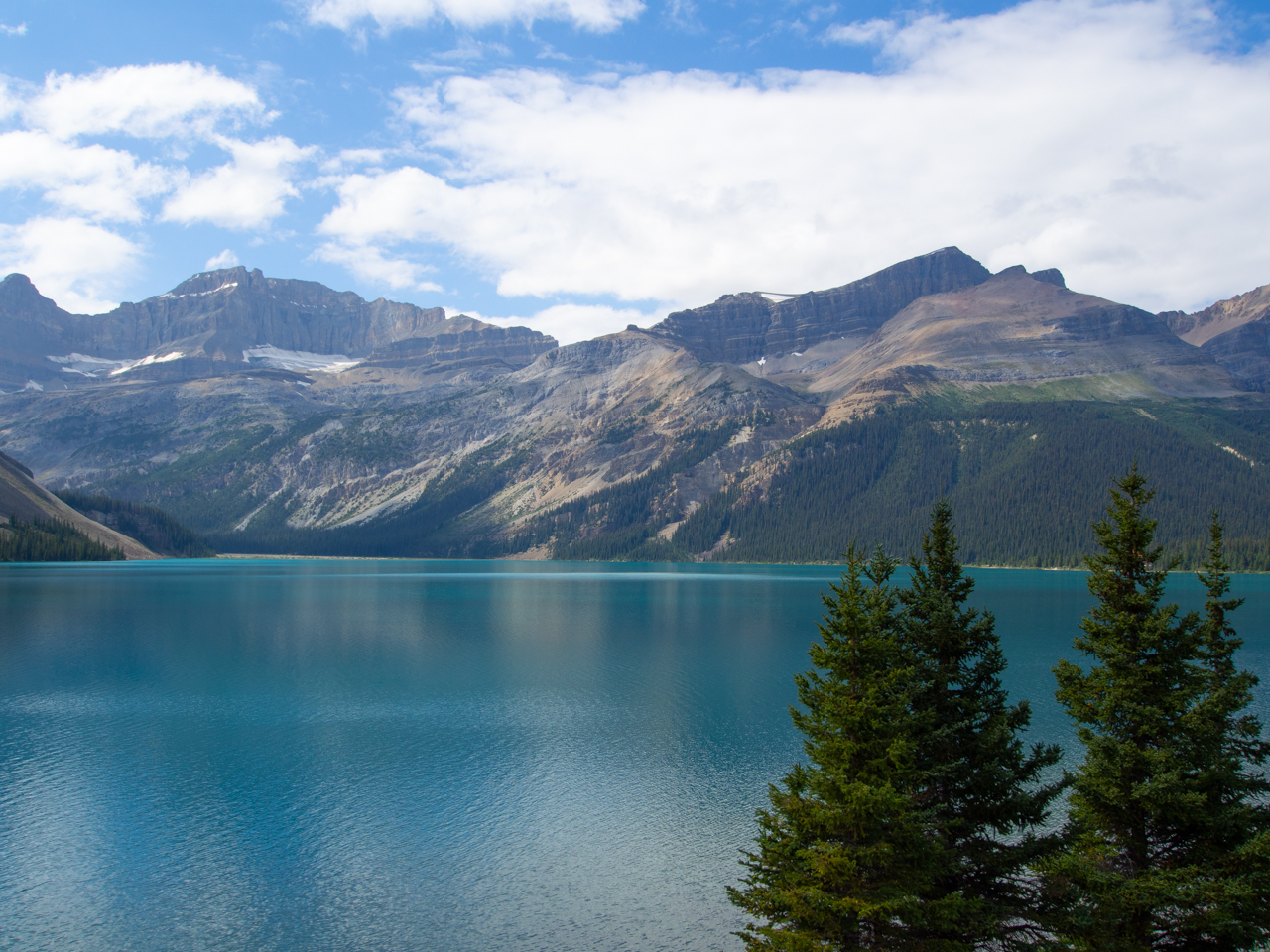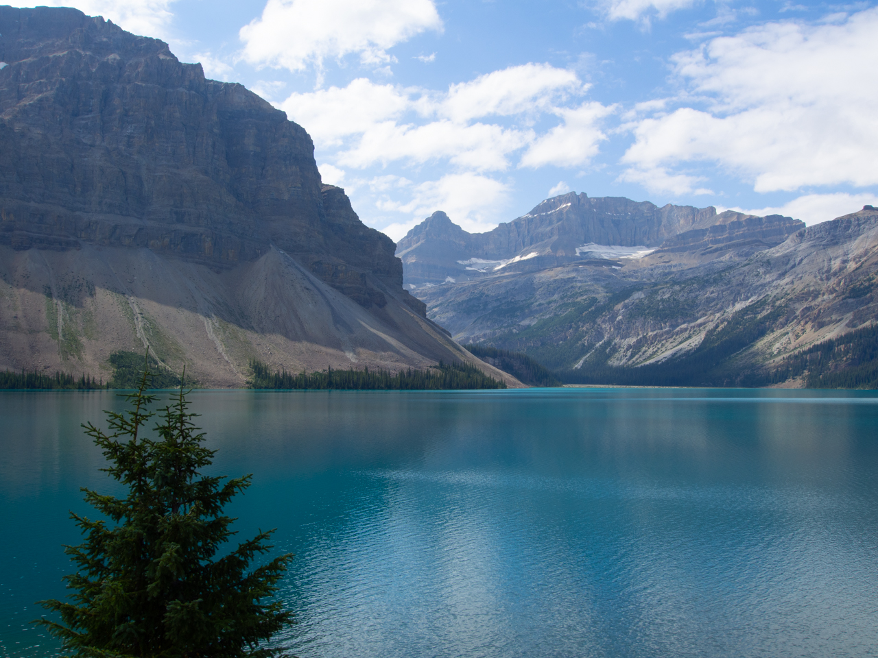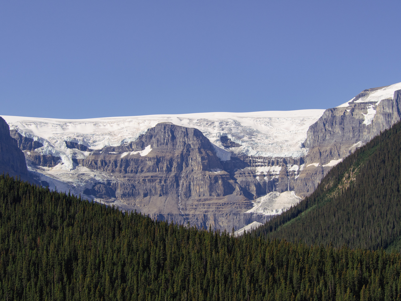 La route redescend maintenant vers Banff. On a culminé à presque 2100m d’altitude selon le GPS de la voiture. On a un peu ressenti le manque d’air alors que l’on marche autour des points de vue. Il y a dans le coin de superbes attractions que l’on a décidé de ne pas profiter par manque de temps mais qui aurait mérité un jour de plus (faisable depuis Jasper) comme le chemin du Parker Ridge Trail qui amène à un point de vue incroyable sur un glacier, ou alors plus facilement mais bien plus cher, une expédition en camion bus sur le glacier de Athabasca. Il faut dire, venant de Haute Savoie et voisins de Chamonix, on ressent moins le besoin de découvrir un glacier, nous en avons un très beau à une heure de chez nous. Néanmoins, le cadre est fantastique, et bien différent des Alpes françaises.