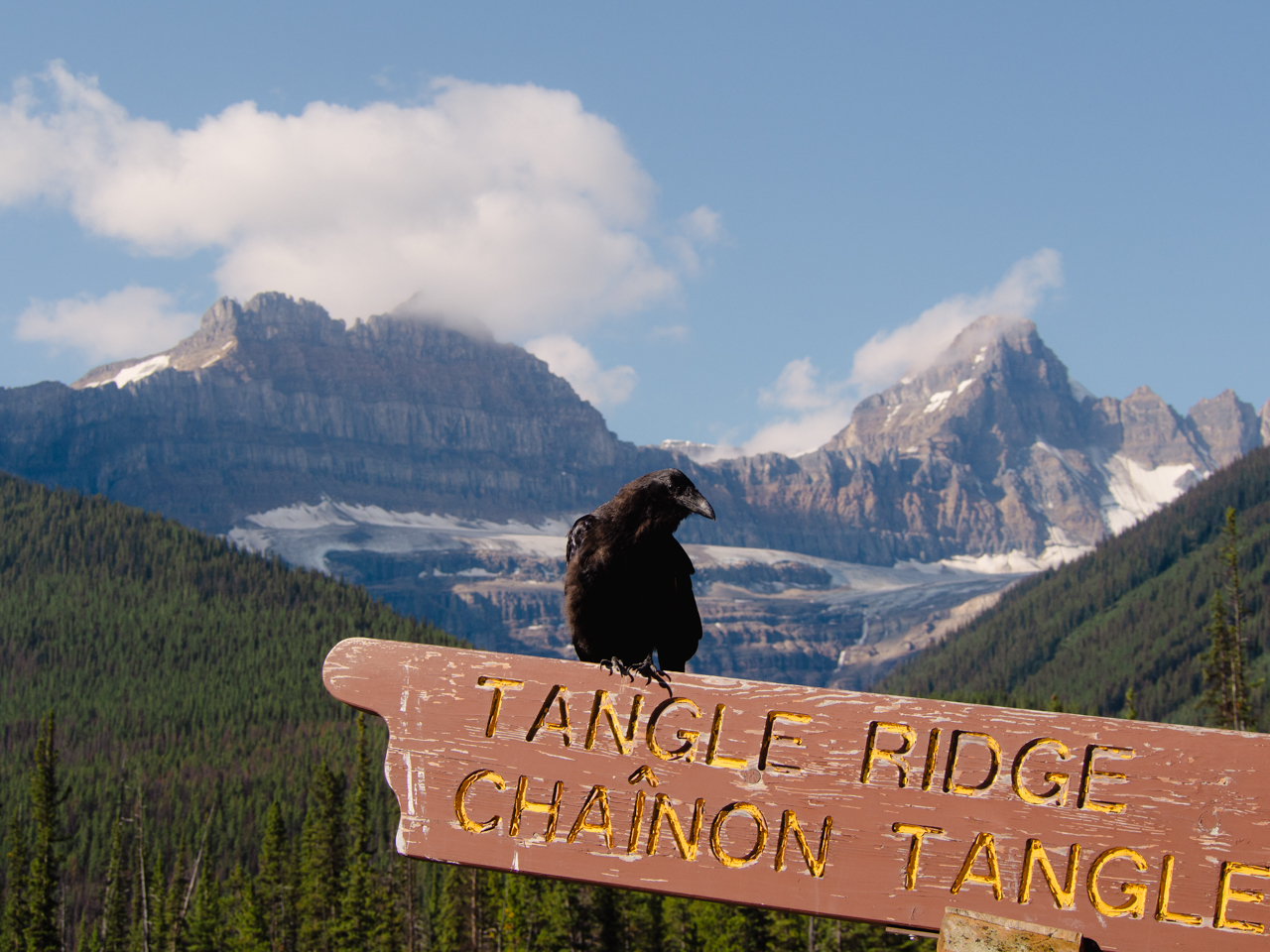 Ici, des panneaux indiquent le nom des montagnes que l’on a sous nos yeux. Des énormes corbeaux sont installés sur le panneau et nous fixent du regard. On a un peu l’impression d’être dans un western mais sans les vautours.