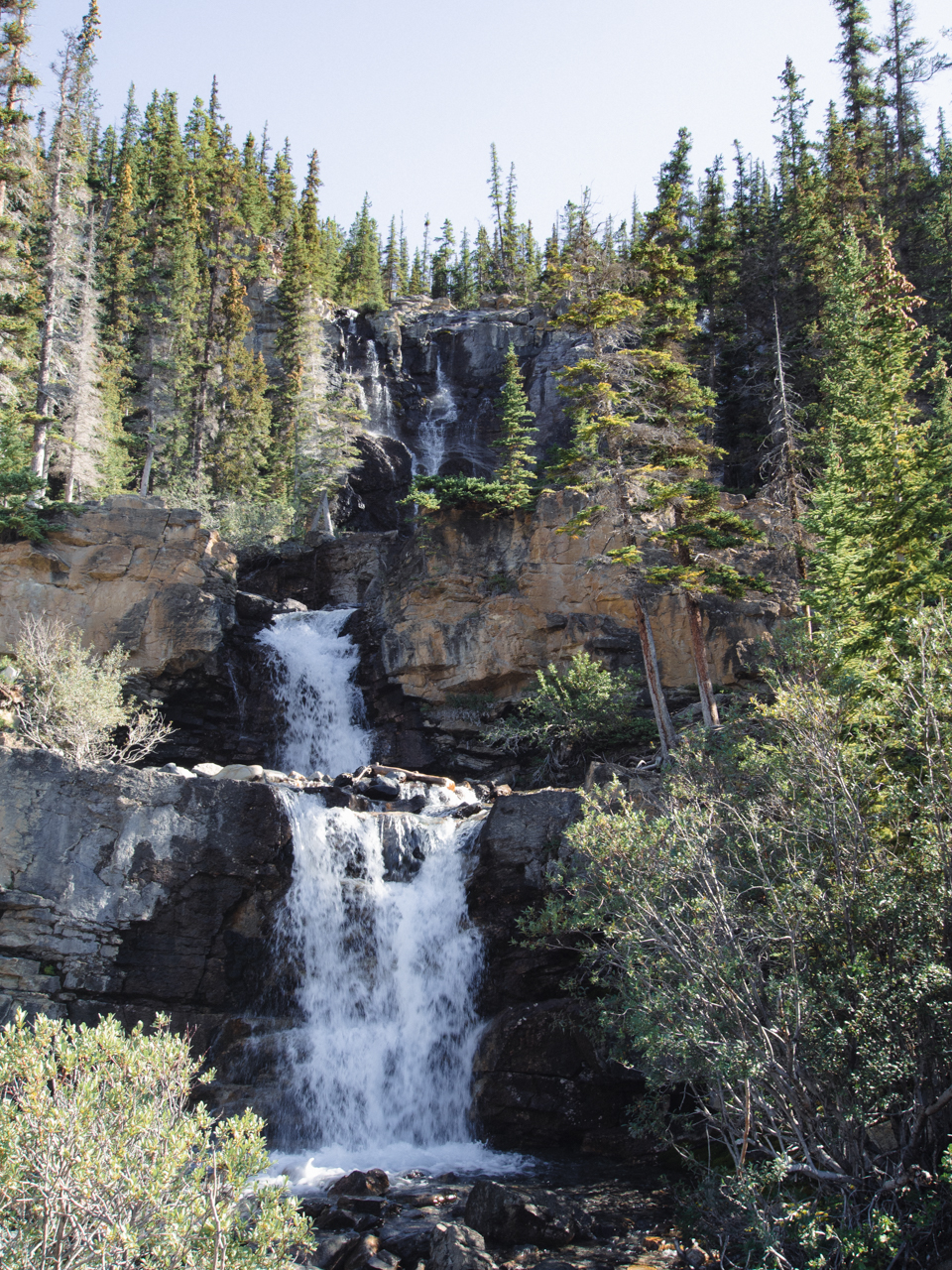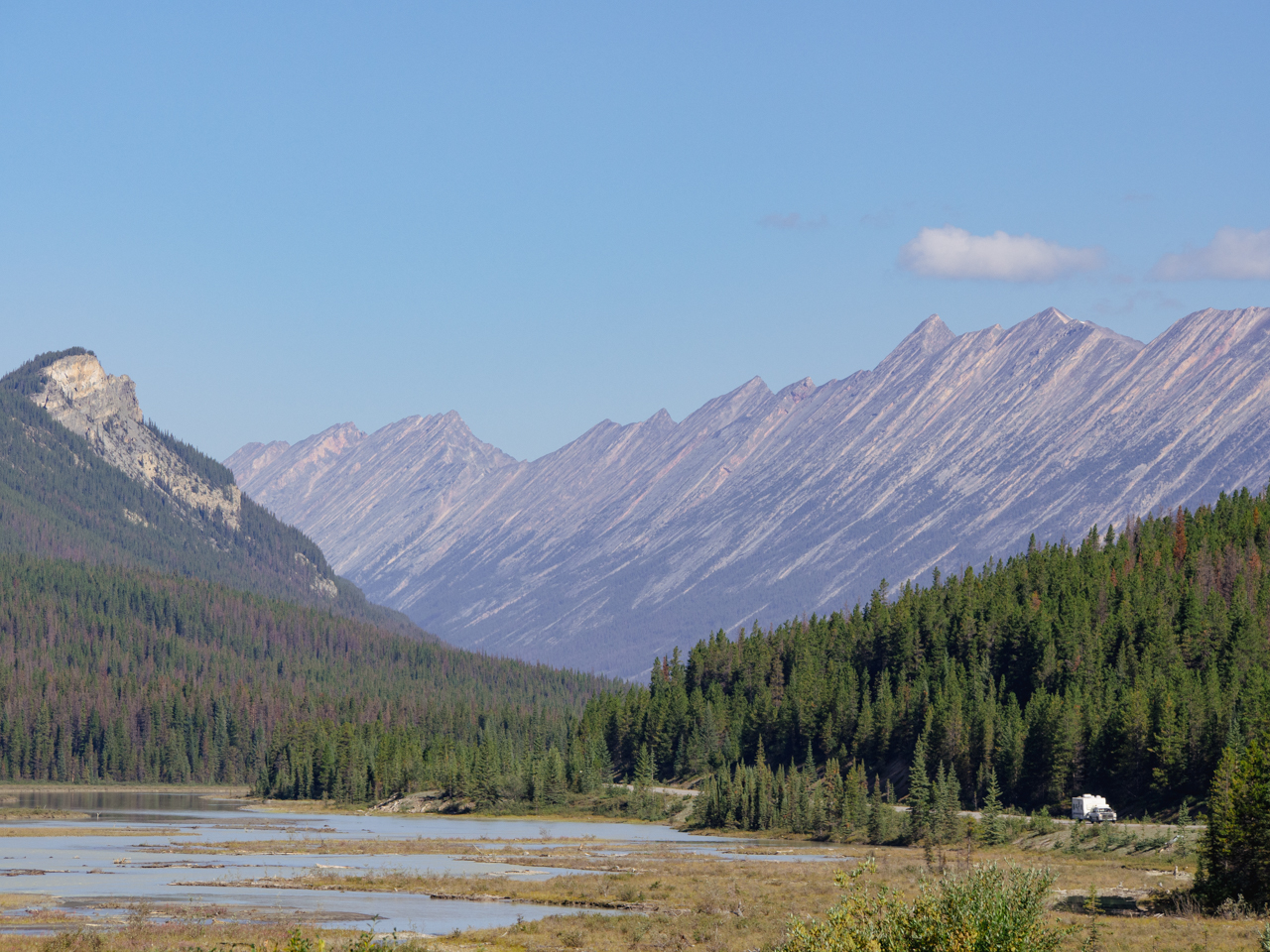On roule longtemps sans faire d’arrêts jusqu’à notre prochaine étape, on dépasse le village de Saskatchewan, où se trouve la seule station service sur le chemin de Lake Louise le long de icefield parkway. L’essence y est hors de prix, heureusement l’Audi n’est pas gourmande et on a largement de quoi tenir. Le paysage a changé maintenant, les montagnes sont beaucoup plus hautes et vertigineuses, plus rocheuses aussi. La vallée se resserre et on grimpe à nouveau vers un nouveau col. Mais avant, on fait une nouvelle étape au lac de Waterfowl.