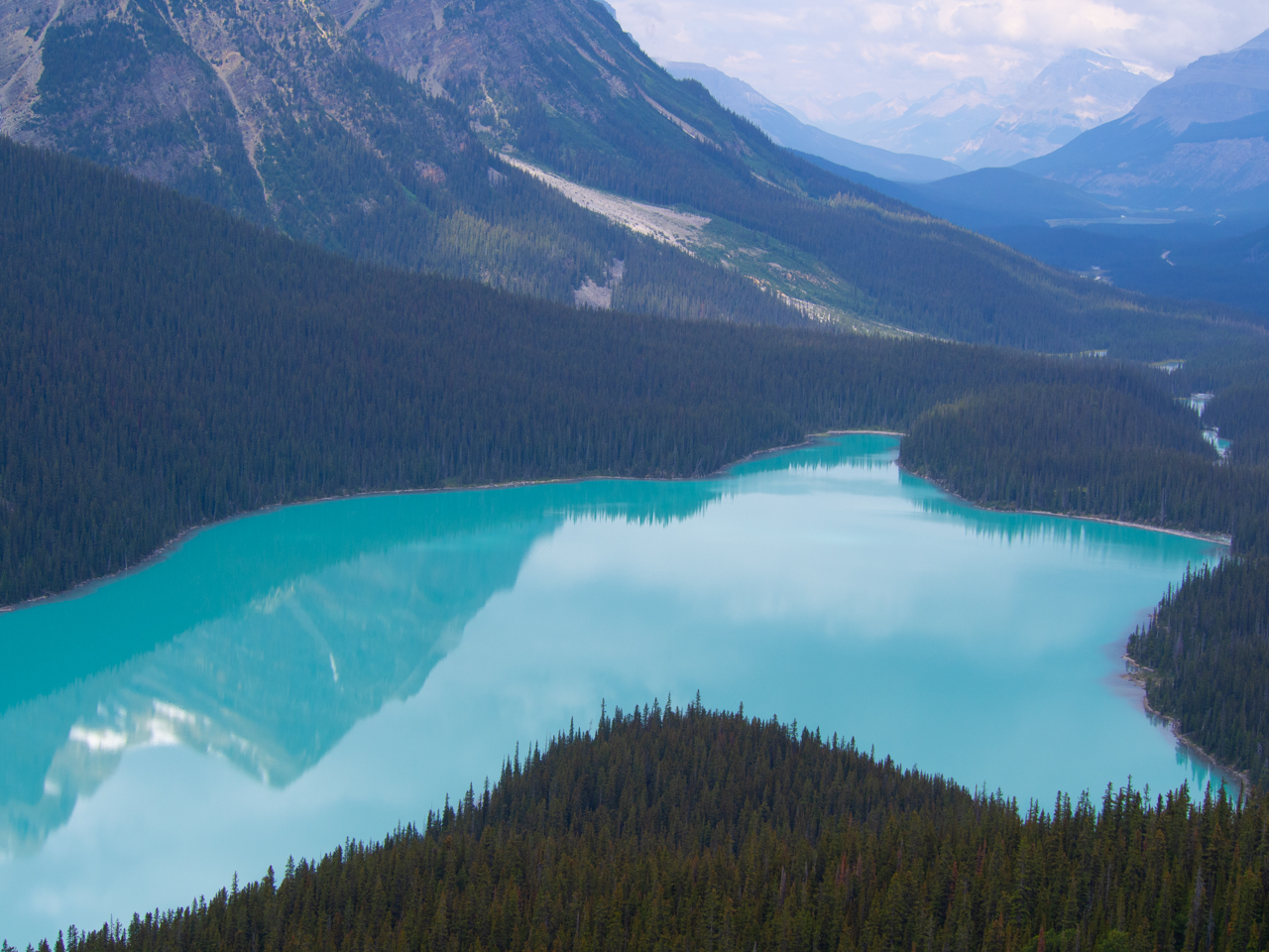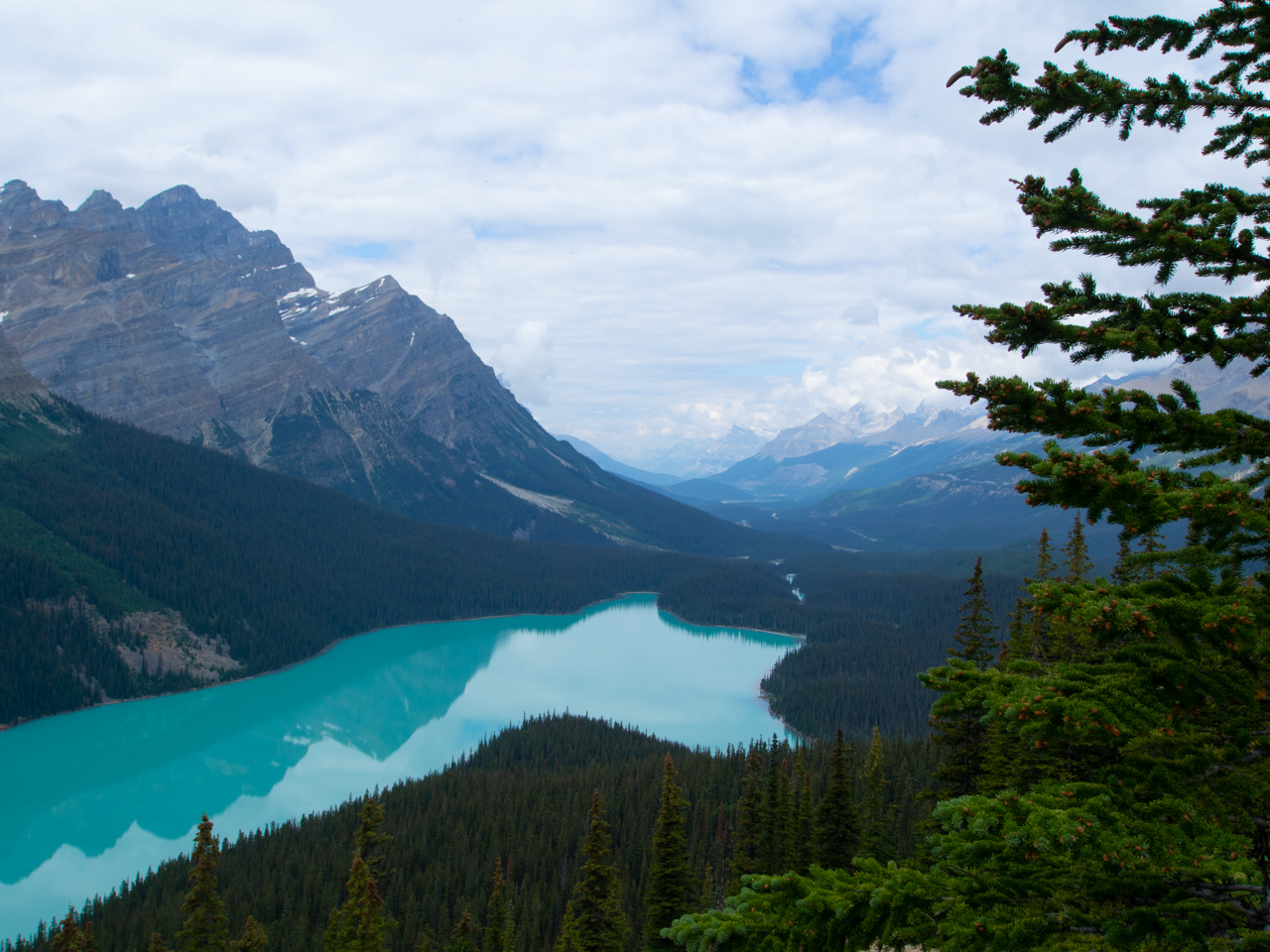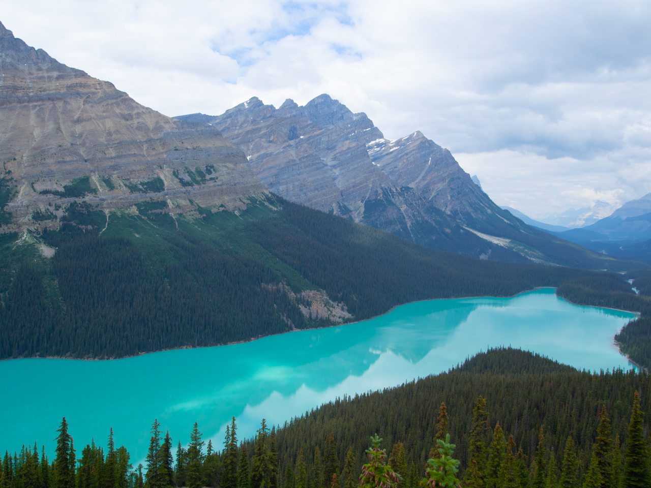 On arrive sur une plate-forme de bois qui avance au dessus de la falaise face à ce joyau de la nature, le Lac Peyto.