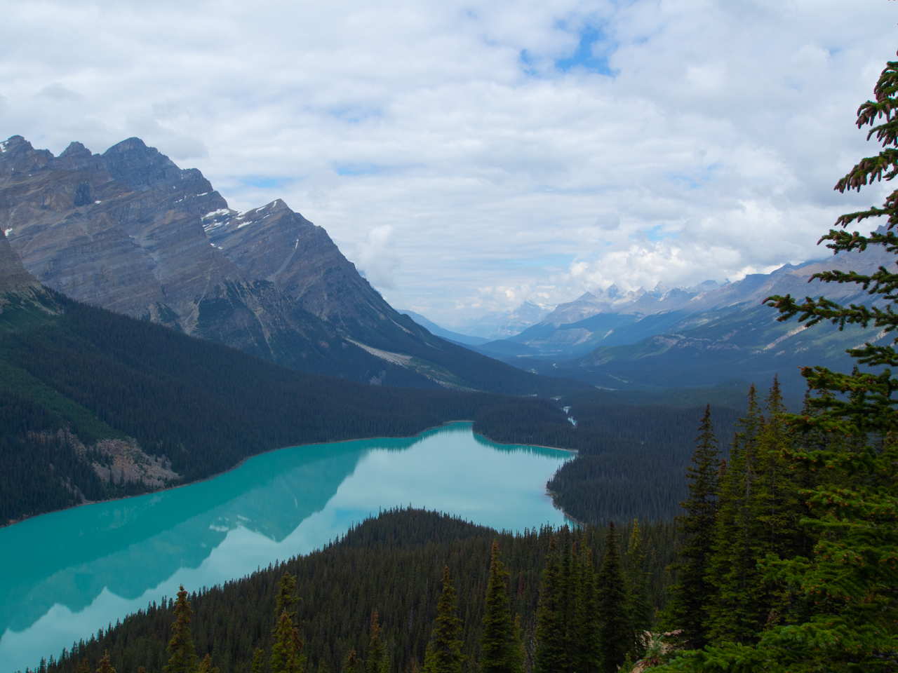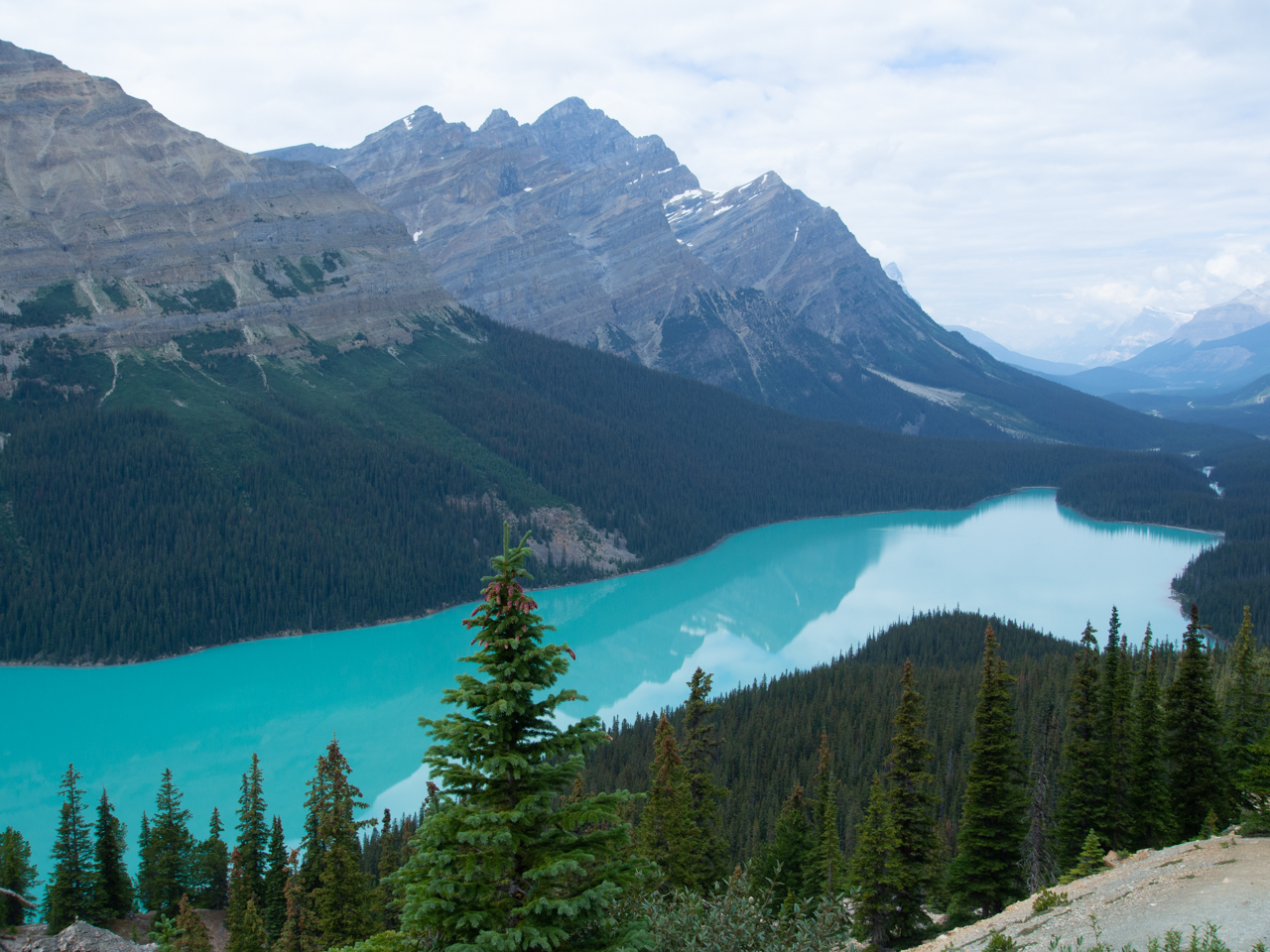 Nous arrivons maintenant au clou de cette journée. En préparant notre voyage dans les Rocheuses Canadiennes, il y avait quatre lacs qui sortaient du lot avec des couleurs ou un emplacement splendide et que je voulais absolument voir sous des conditions idéales. Il y avait tout d’abord le Lac Maligne de Jasper, les deux lacs mondialement connus de lac Louise et lac Moraine. Puis aujourd’hui, nous découvrons donc le lac Peyto, le dernier de cette Bucket list personnelle. Le lac est situé en haut du deuxième col de Icefield Parkway, à environ 2000m d’altitude. Le parking gigantesque nous rappelle que l’on arrive dans une des perles du tourisme canadien. Du parking, il faut marcher une centaine de mètres sur un chemin goudronné qui passe au milieu des sapins.