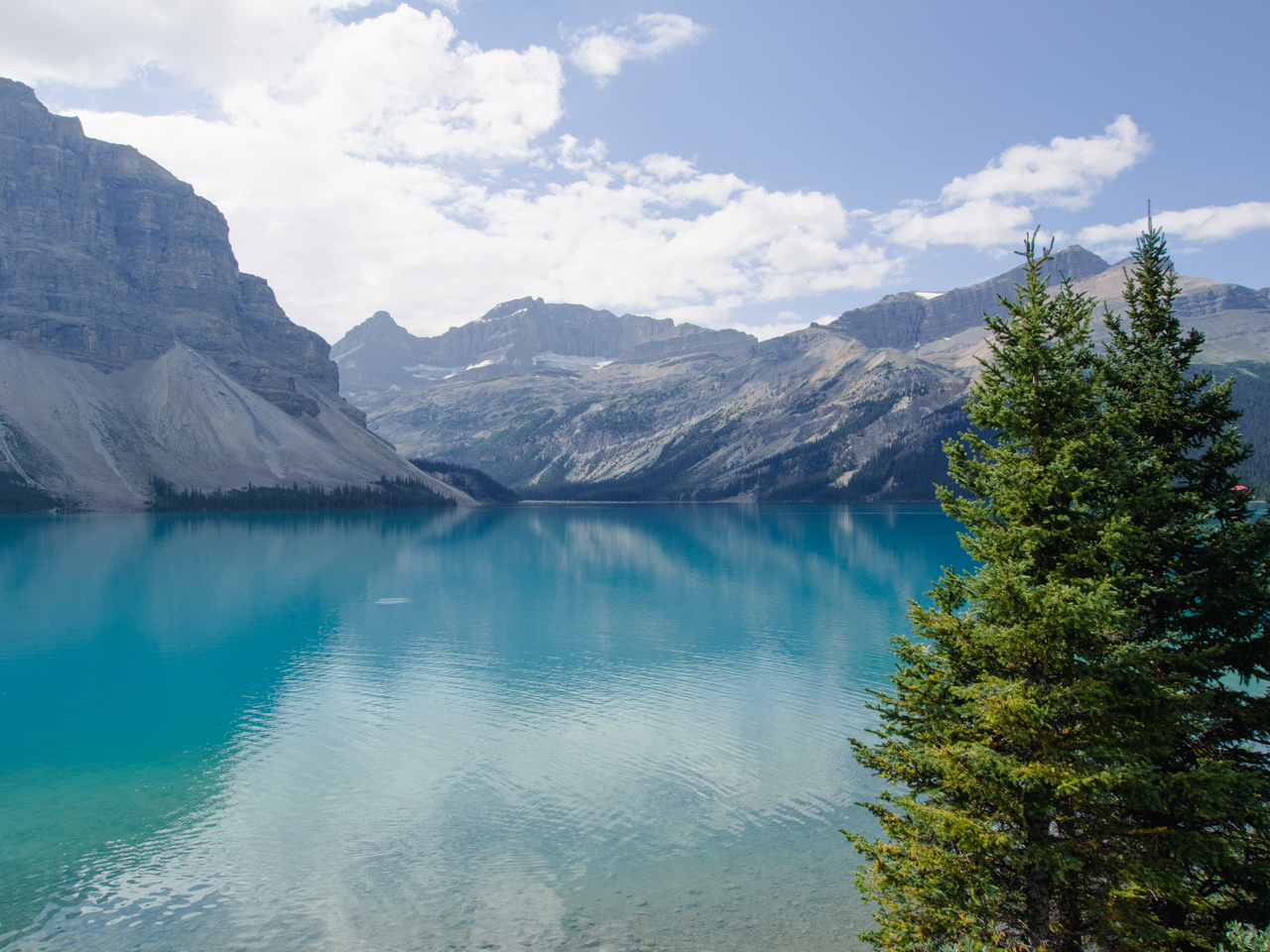 Sa couleur ressemble un peu à celle du lac d’Annecy d’un bleu magnifique. Il s’agit du lac Bow qui s’étend au pied de montagnes aux hautes falaises. C’est grandiose.