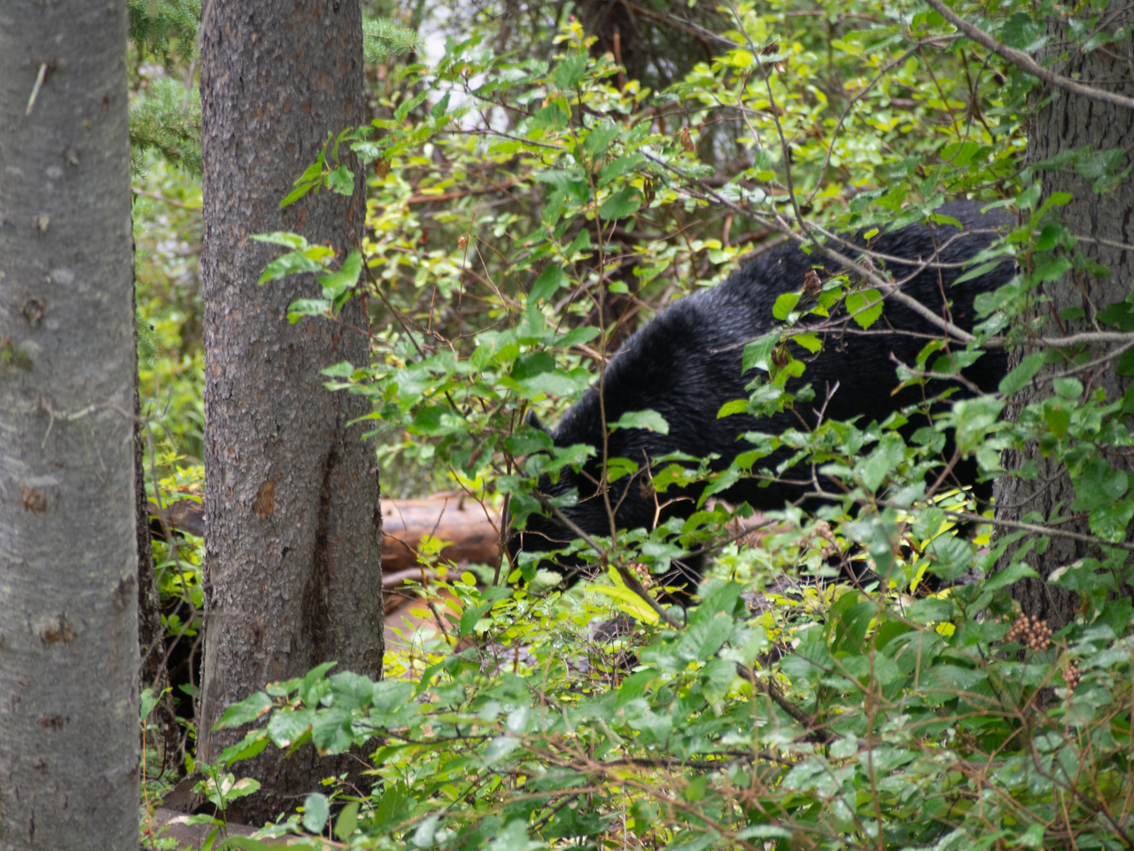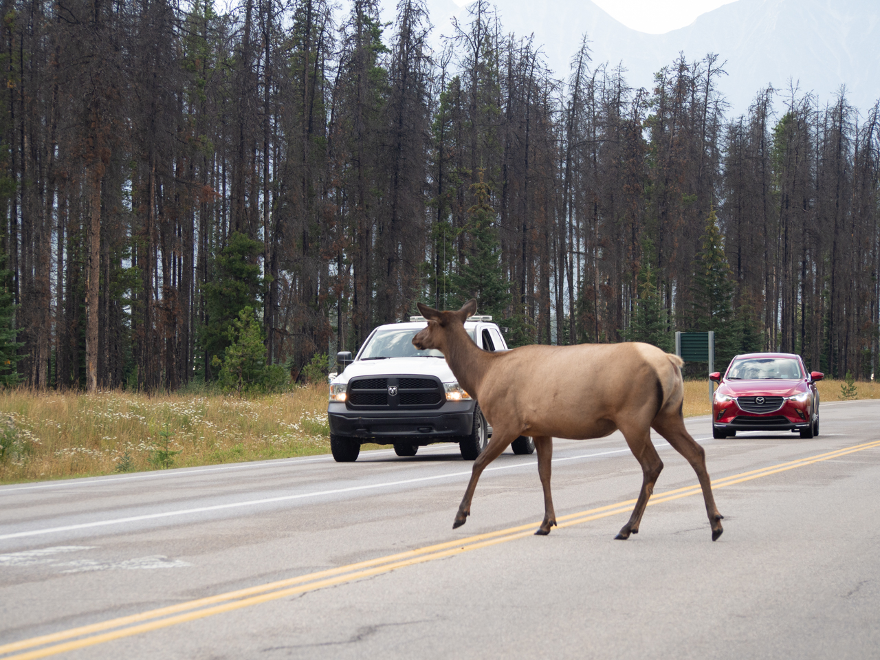 La majesté des parcs nationaux canadiens réside dans la quantité de faune qui vit dans les forêts. Mais il faut faire très attention aux mauvaises rencontres. Nous avons vu seulement qu'un seul ours lors de notre séjour, mais les rangers nous ont bien mis en garde, les ours peuvent être agressifs et il faut les laisser tranquille. Il arrive aussi que les cervidés en grand nombre traversent la route et il faut donc bien faire attention lorsque l'on roule sur les routes dans les parcs, notamment nous avons remarqué à l'entrée de Jasper quand on vient d'Edmonton.