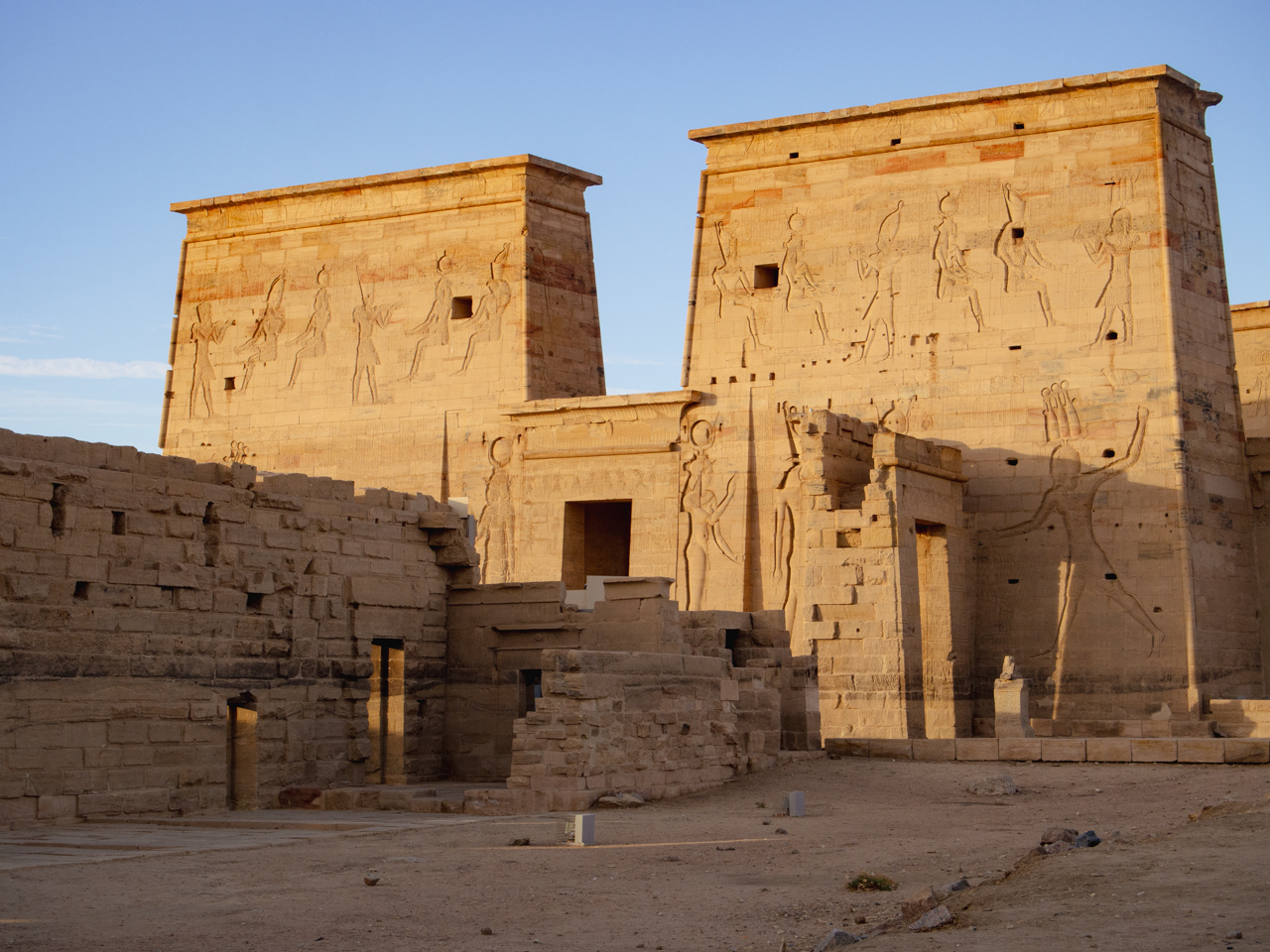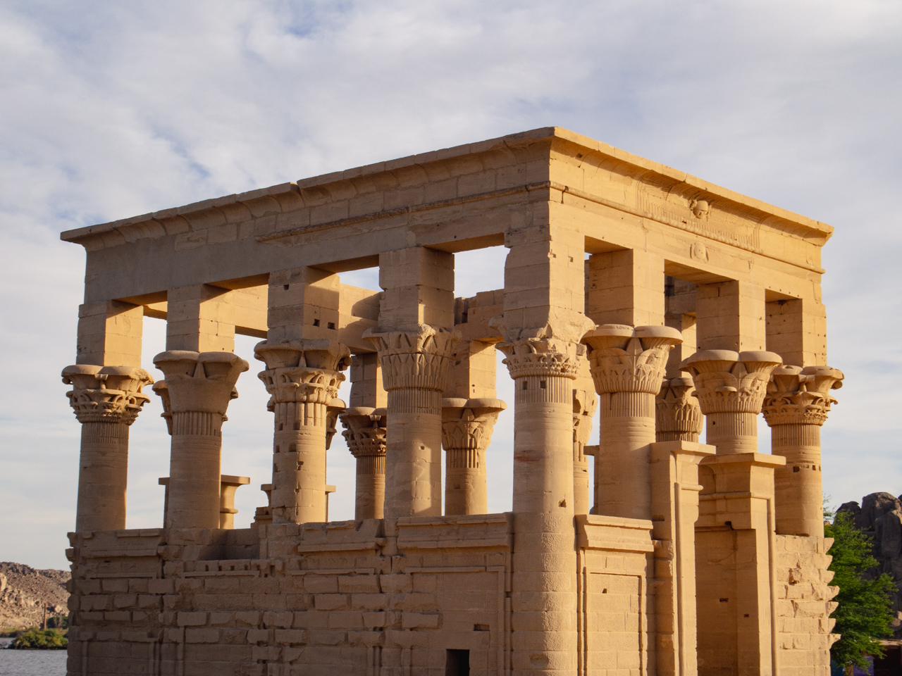 Il y a quand même un contraste énorme entre cette bulle de richesse dans la ville cacophonique d’Assouan. On sort de l’hôtel pour manger des grillades dans un restaurant au bord du Nil, accompagnés de nombreux chats qui viennent quémander les restes. L’après-midi, nous prenons un taxi pour le temple de Philae au Sud de la ville, de l’autre côté du petit barrage d’Assouan. Ce temple dédié à la déesse Isis a été déplacé suite à la montée des eaux et on peut le visiter en prenant un petit bateau qui fait la traversée. On trouve un guide pour nous expliquer les différents détails du temple ainsi que l’histoire de l’Egypte, cela permet de dépoussiérer les souvenirs de classe et de contextualiser le lieu que l’on visite. Déjà l’arrivée en bateau est très charmante, on vogue sur le lac formé par le barrage sur le Nil alors que le soleil a déjà commencé sa descente, on longe l’île du temple de Philae pour être déposés au débarcadère avec le guide.