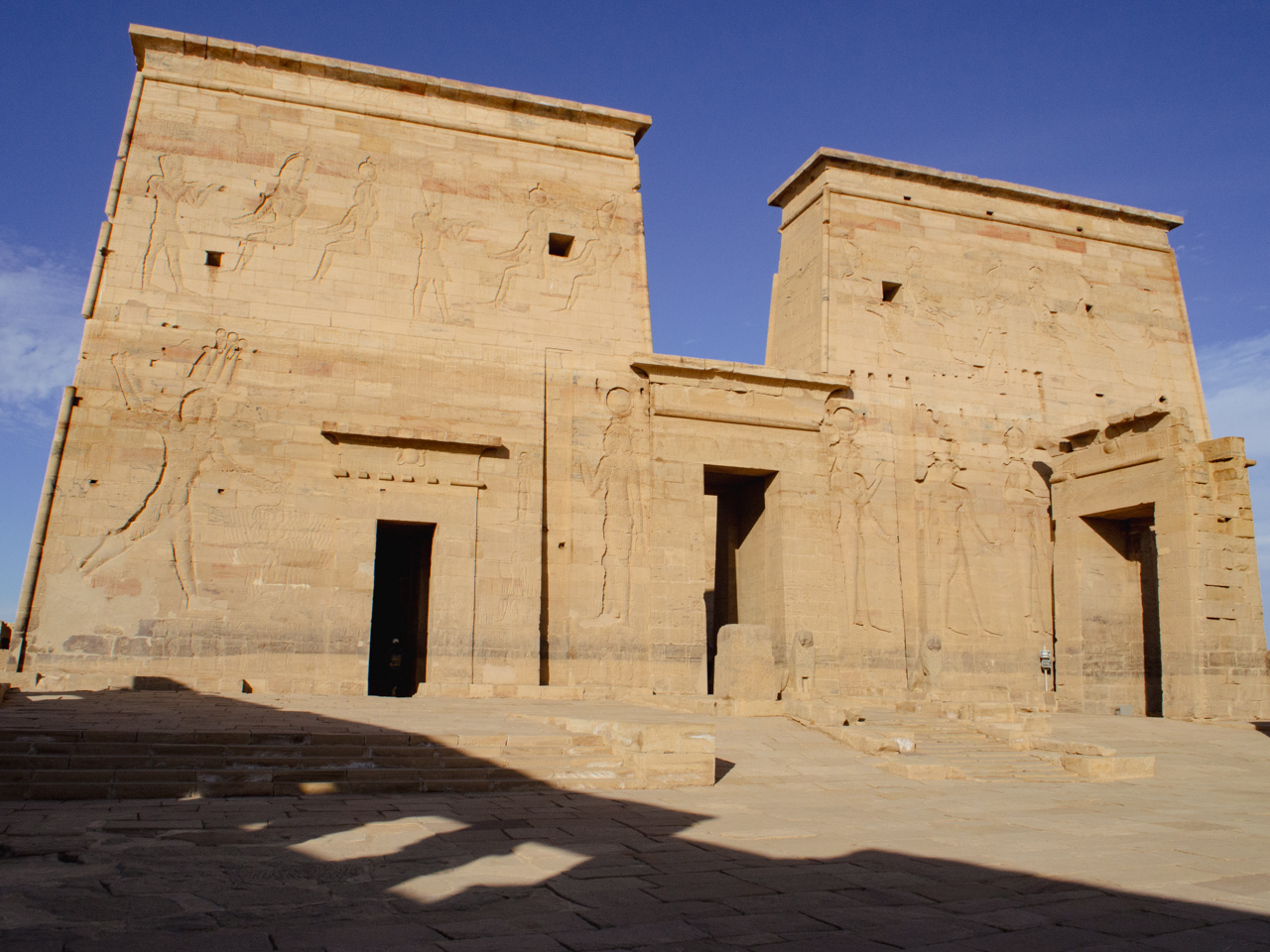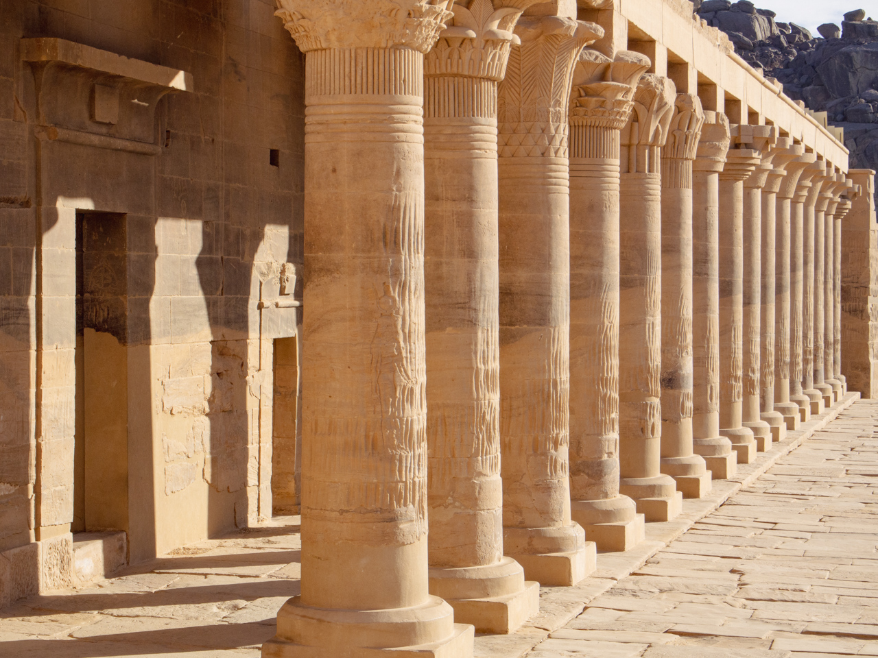 La place entourée de colonnades est grandiose et fait face aux pylônes à l’entrée du temple avec le dieu Isis.