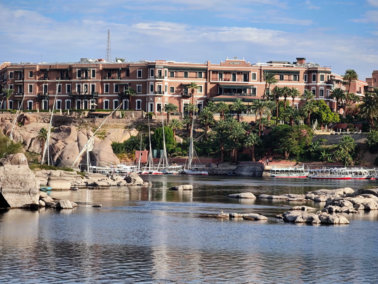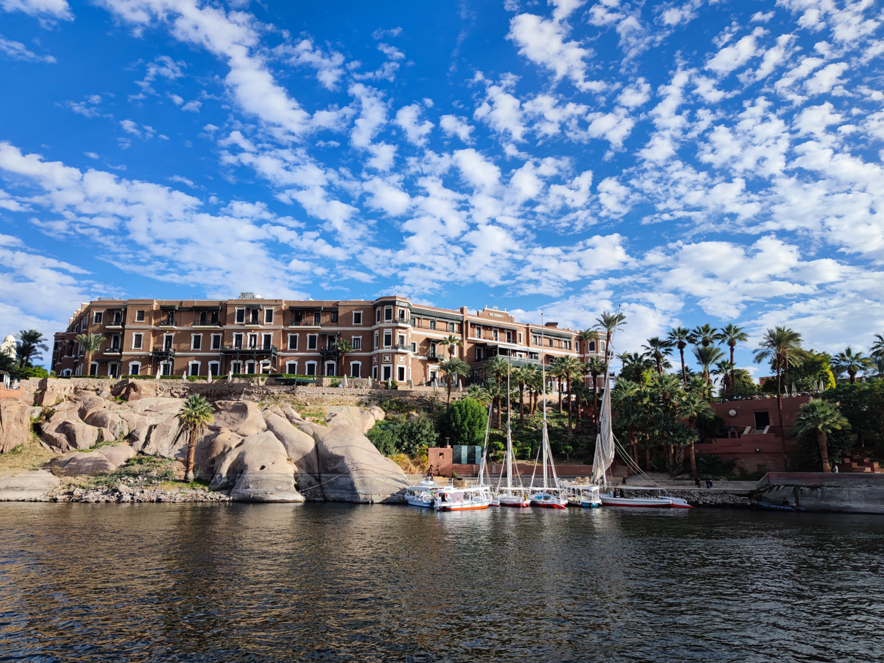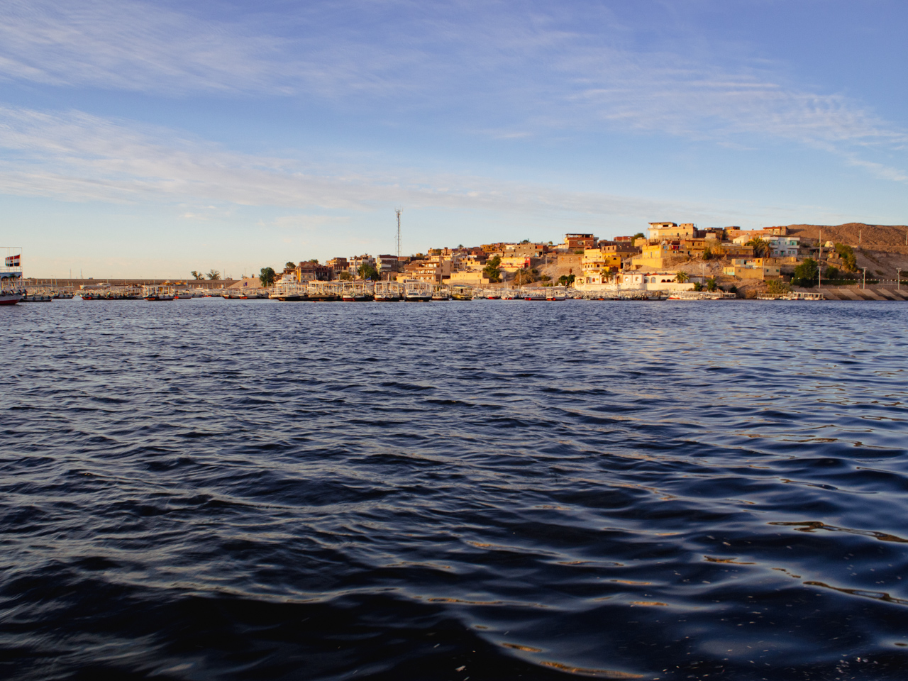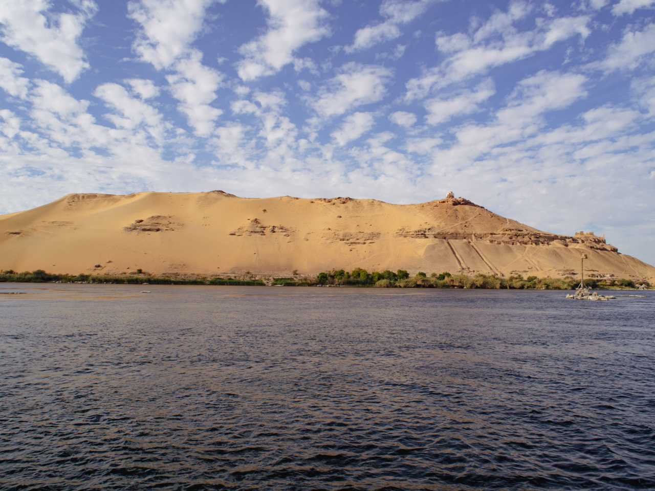 En fin de matinée, nous prenons un bateau pour faire la traversée sur la rive opposée à la ville. Depuis Assouan, on peut apercevoir de grandes dunes à la couleur dorée qui s’élèvent au-dessus du fleuve et aussi un bâtiment au sommet.