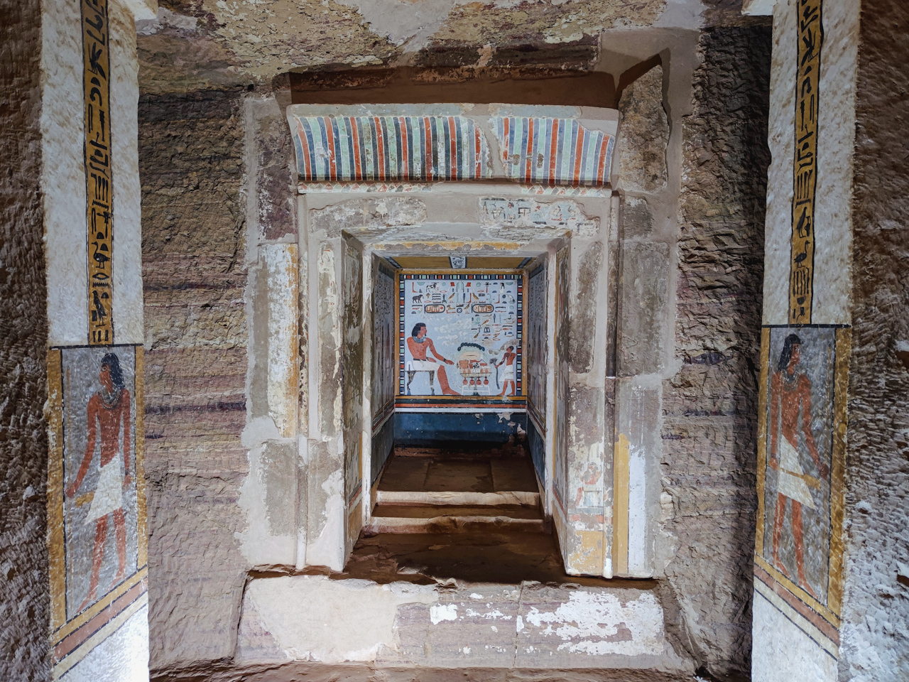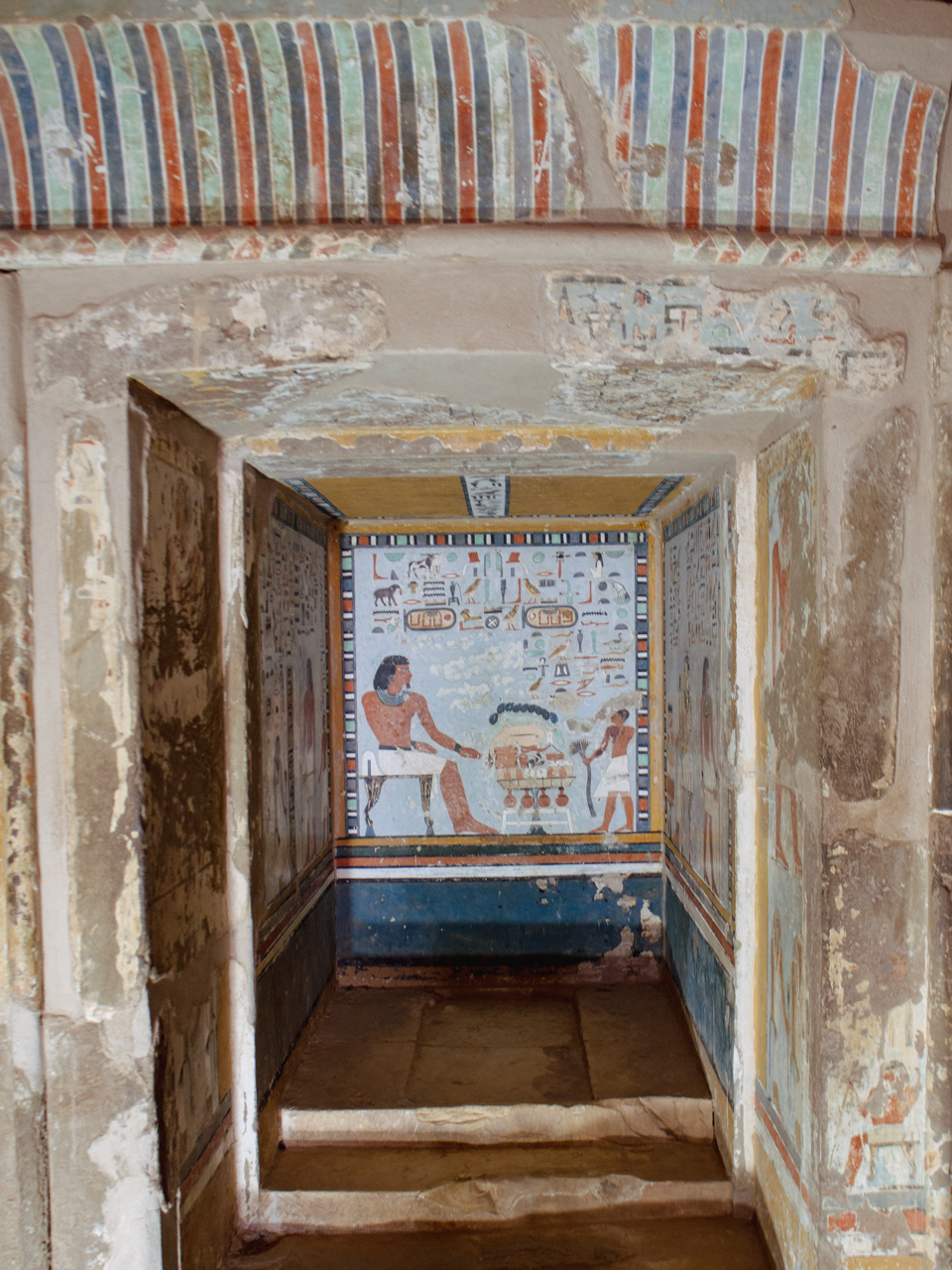 Il y a un autre touriste qui entame la montée avec nous et le gardien qui vérifie les tickets nous emmène ensemble faire la visite des tombes des nobles creusées dans la montagne. Il nous ouvre le verrou d’une tombe, l’intérieur est largement creusé et on découvre des dessins encore colorées sur les murs. Ces tombes n’ont bien sur rien à voir avec la grandeur des tombes des rois de Louxor mais cela reste intéressant de s’y rendre.