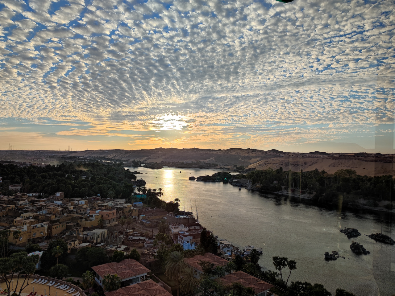 Le temps a été bizarre toute la journée. Un peu voilé avec une couche de nuage qui ne voulait pas partir. Il nous reste un peu de temps en fin d'après midi. On pensait manger dans le village nubien sur l'île, lorsque le ciel a commencé à prendre une allure grandiose. Les nuages comme des moutons on commencé à prendre des couleurs et un volume extraordinaire. Le temps semble parfait pour admirer le coucher de soleil, au Nord de l'île se trouve la grande tour de l'hôtel Movenpick. On monte tout en haut de la tour où se trouve un restaurant panoramique.